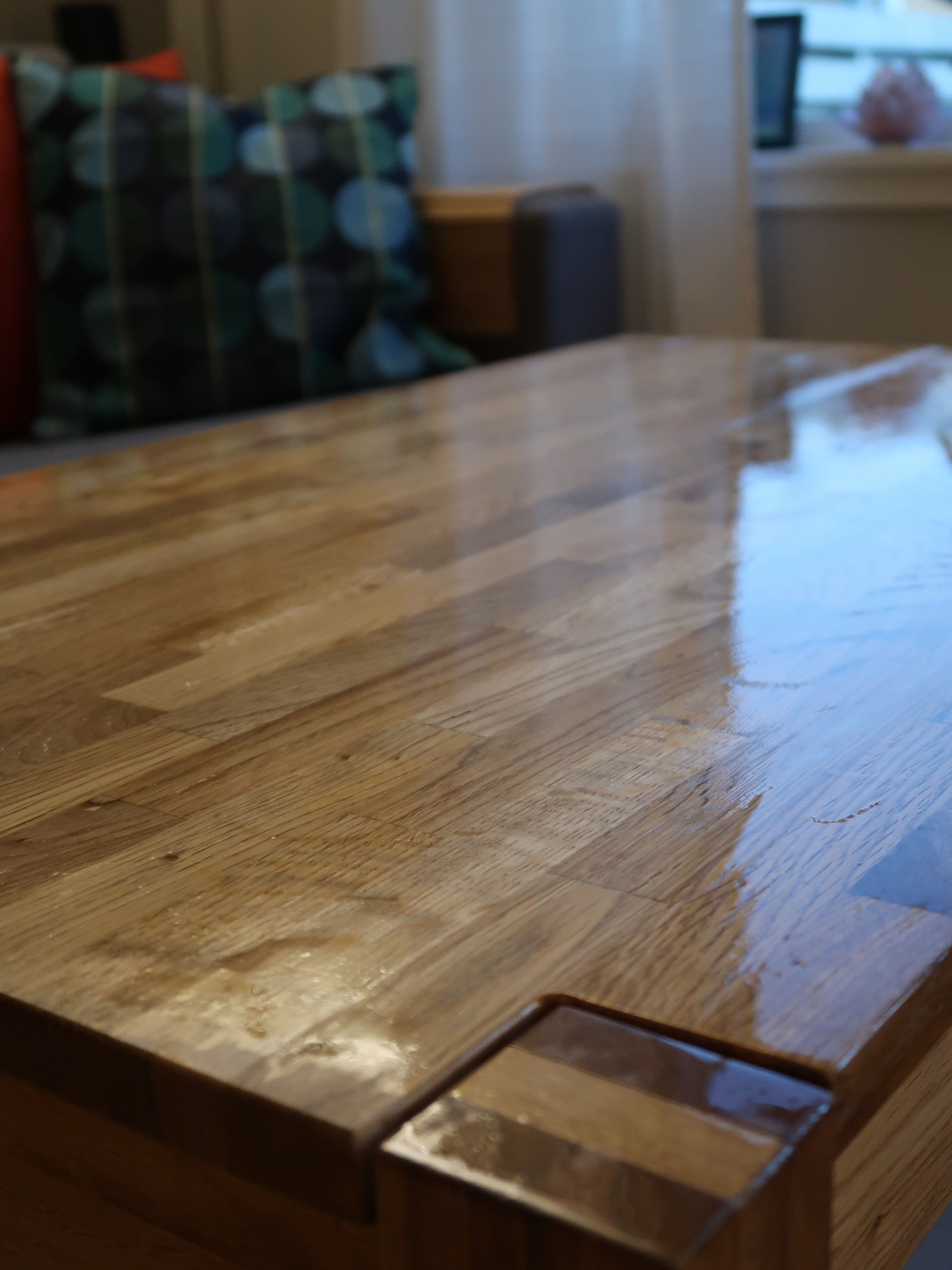 Vi prøver Liberon «Finishing Oil», som skal gi en gyllen og silkematt glød. Oljen skal også få fram den vakre strukturen i treverket. Det er akkurat hva vårt sofabord trenger. Oljen er en blanding av høykvalitetsoljer, harpikser og tørkemidler som er spesielt motstandsdyktige mot vann, alkohol og fettsyrer, og at den er basert på kinesisk treolje.