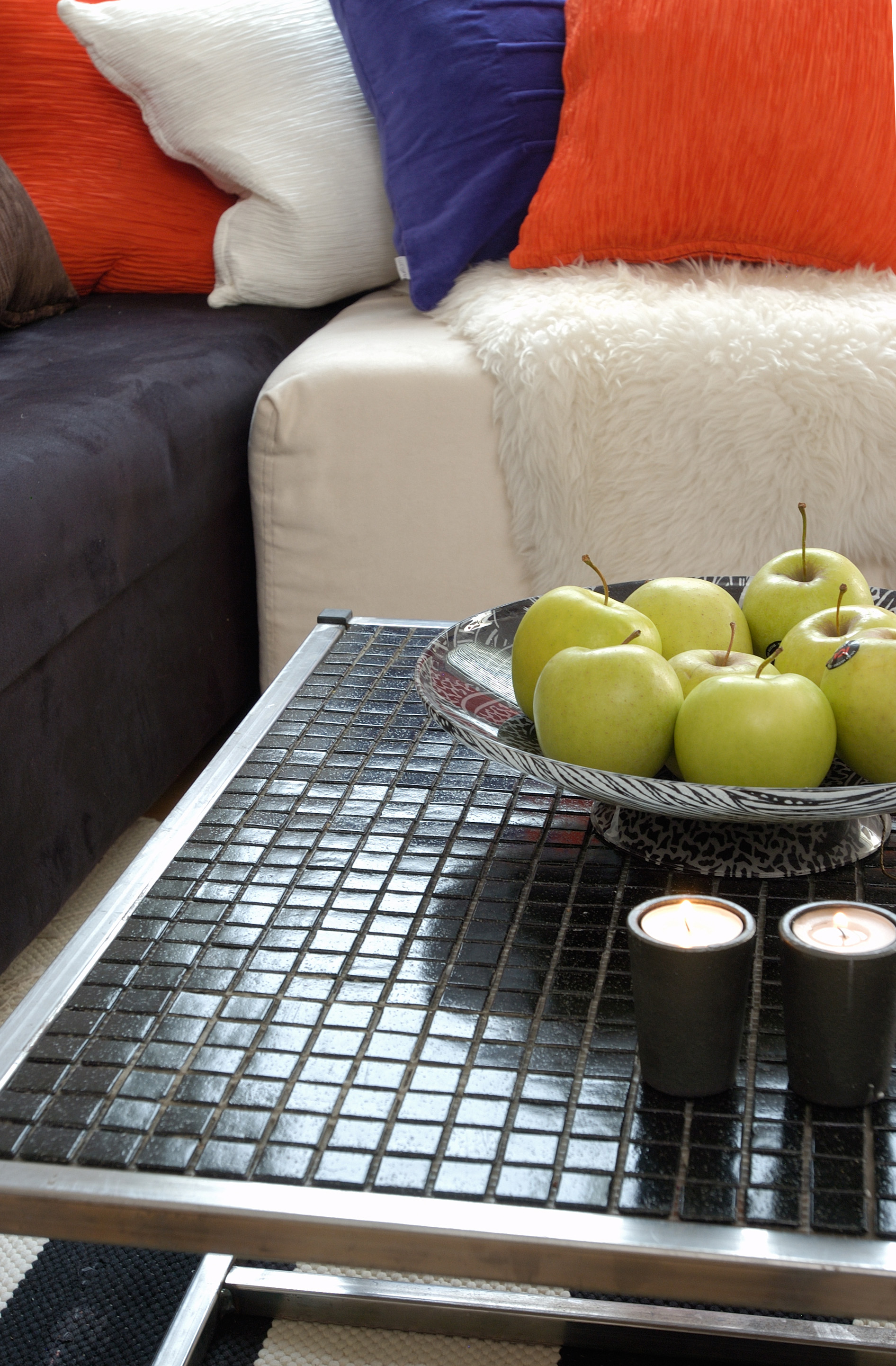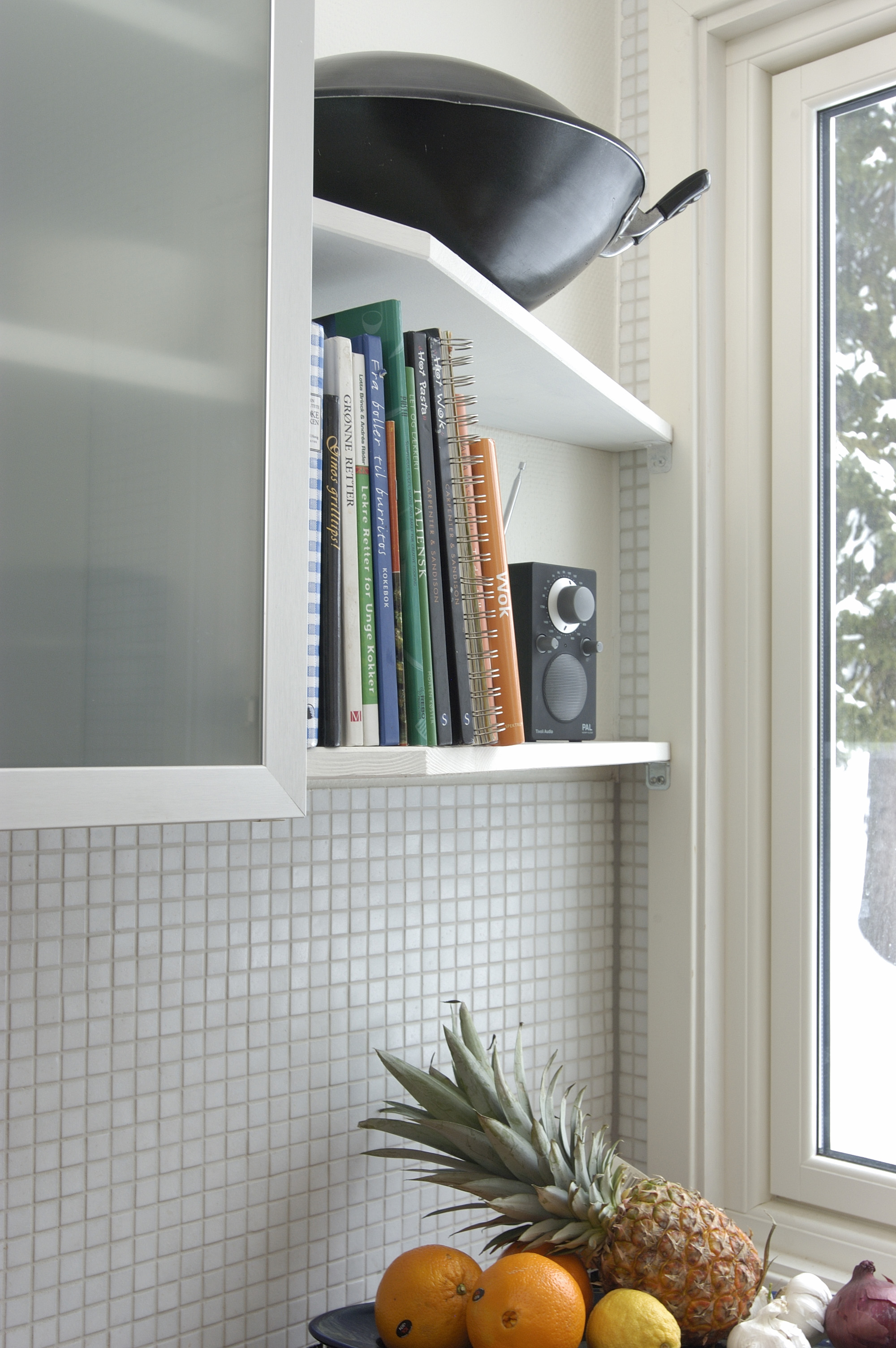 På kjøkkenet var det nødvendig med å legge nytt gulv, siden det gamle korkgulvet delvis var løsnet og så stygt ut. Valget falt på fliser som er greit å holde rent. Det ble sort/ hvitt som på badet. Alle veggene over benkeplatene ble kledd med glassmosaikk. Det er utrolig enkelt å holde rent og det ser lekkert ut. Det er en idé til etterfølgelse! Her er det også brukt sort og hvitt. Glassmosaikk finnes i mange prisklasser, så det kan være smart å sjekke priser flere steder. Den litt blanke flaten reflekterer lyset, noe som er ekstra fint i et lite rom. Kjøkkeninnredningen er beholdt, men flyttet litt på og det har kommet til et høyskap. Benkeskapene har fått nye håndtak, overskapene har fått nye dører med frostete glassdører, som gir et roligere inntrykk. Benkeplaten er beiset og oljet og ser helt ut som ny.