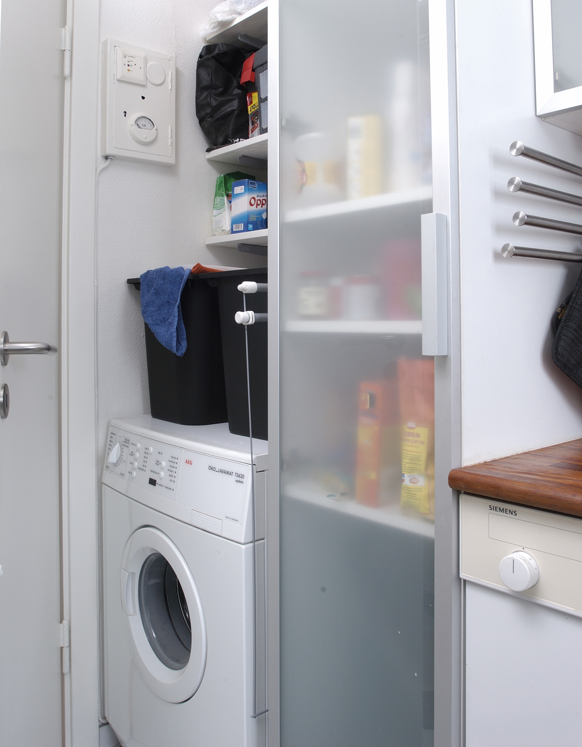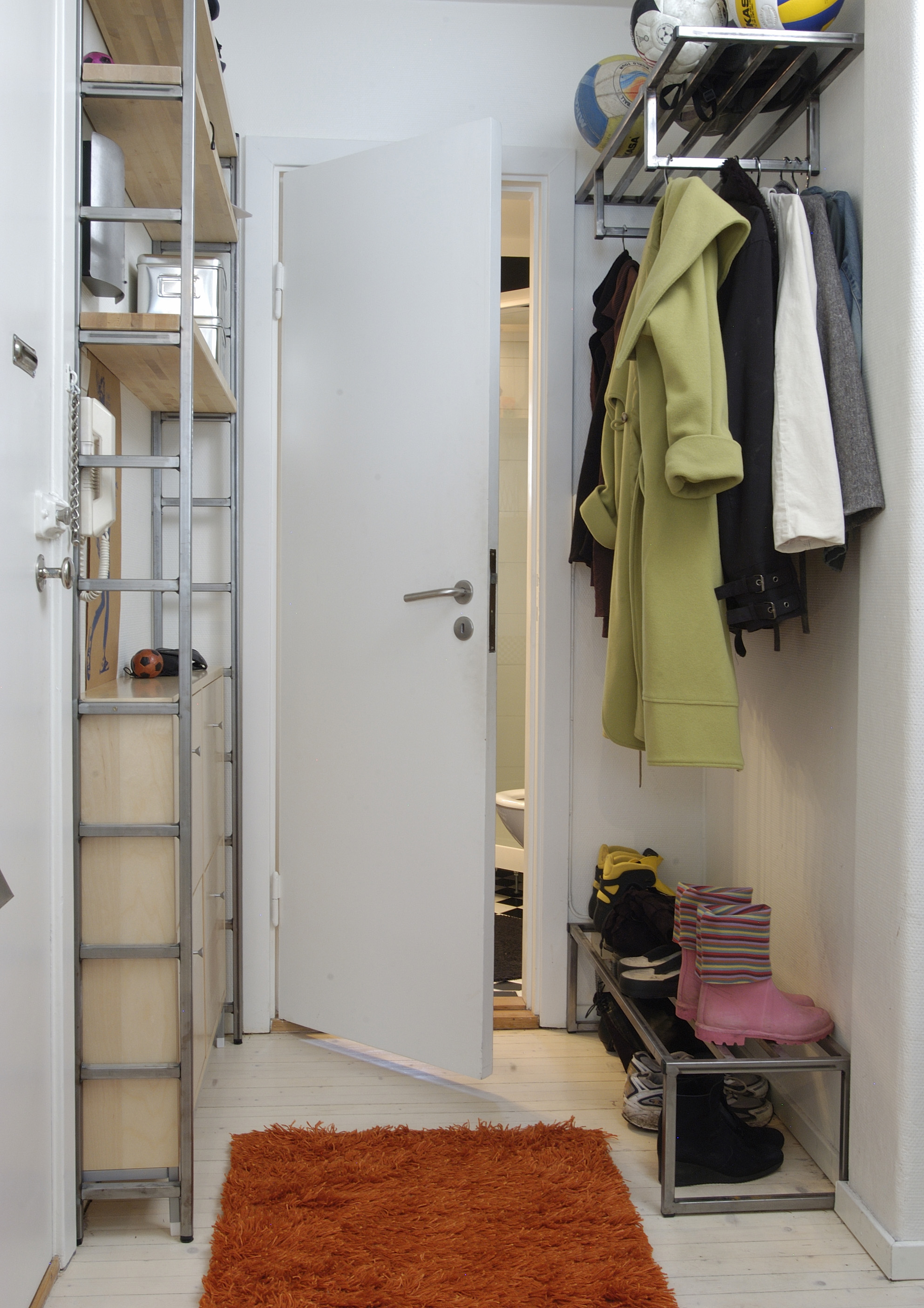 Her er gulvet slipt, hvitlasert og lakket, mens alle veggene er malt hvite. Vannbasert maling er benyttet på veggene, mens dører, lister og karmer har fått et strøk med olje/vann maling som gir en overflate mer lik tradisjonell oljemaling, og er lettere å holde ren. På gulvet er det en litt langhåret rye. Der synes ikke skitt og søle så lett og den er lett å riste av. All innredning er laget av den samme sveiseren som har laget hyller til de andre rommene. Slik ble det både rimelig og full utnyttelse av plassen.