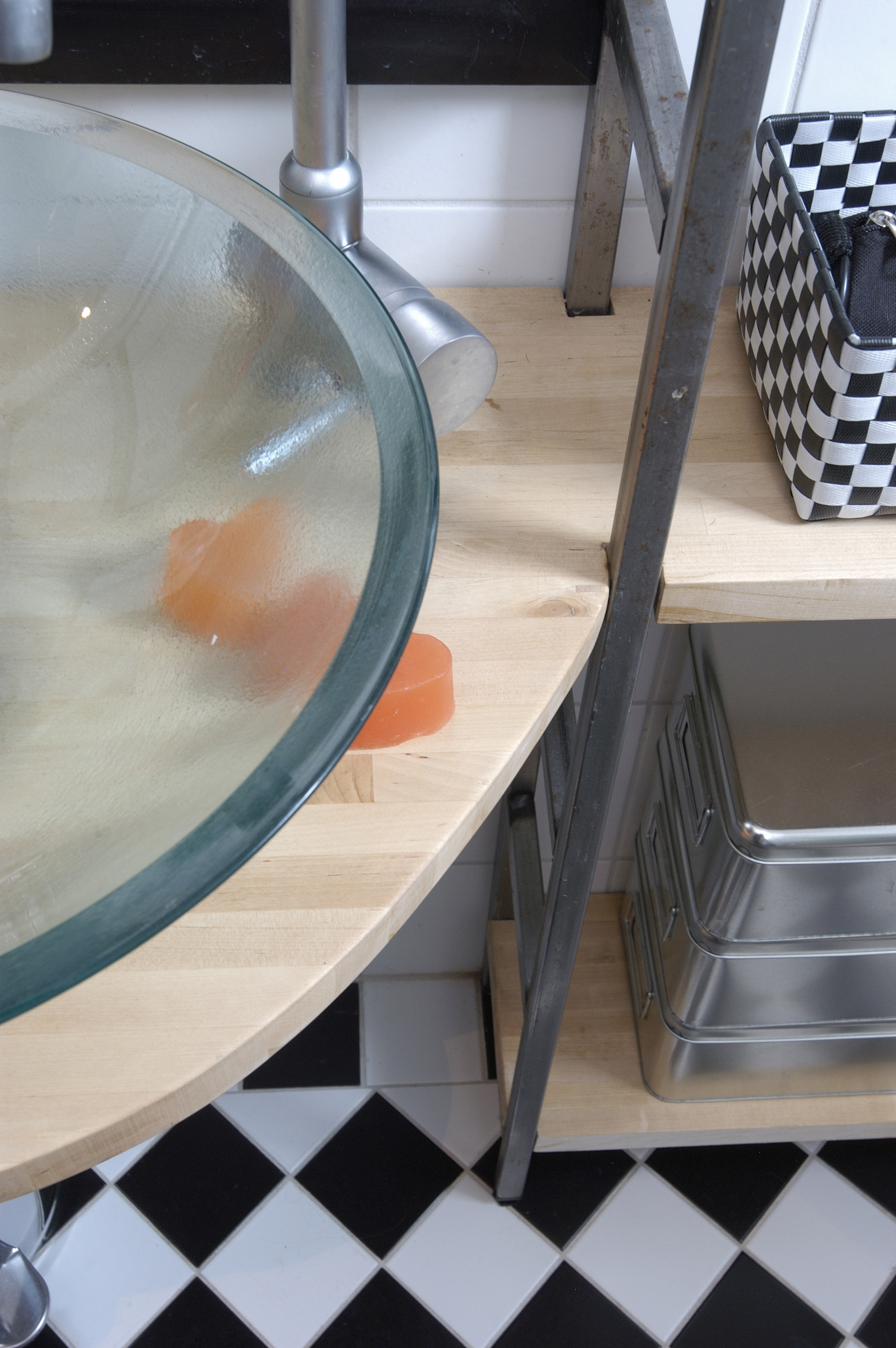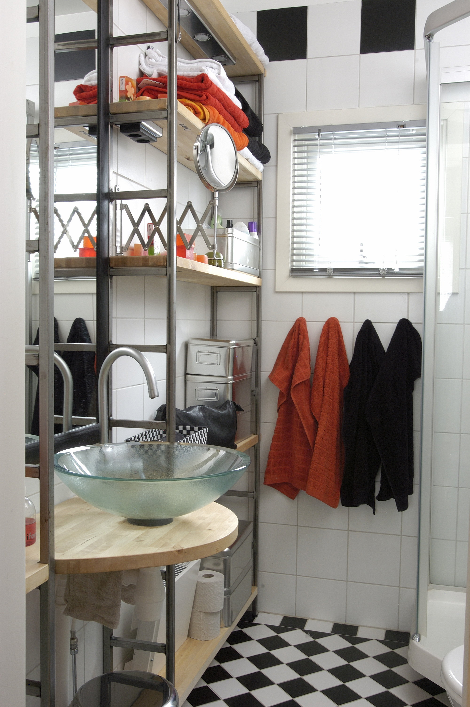 Et enkelt dusjkabinett ble plassert i hjørnet og det nye toalettet ble hengt på veggen. Det er plassbesparende og letter renholdet. På den andre langveggen fikk Turi Tobiassen laget en hylle med innebygget servant. Hyllen er sveiset av firkantstål, hyllene er skåret til av en laminert benkeplate i bjerk. Hyllen fyller akkurat den plassen som er, uten å ruve ut i rommet. Glasservanten var rimelig i forhold til mange andre på markedet, det lønner seg å sjekke rundt omkring, prisene varierer svært.