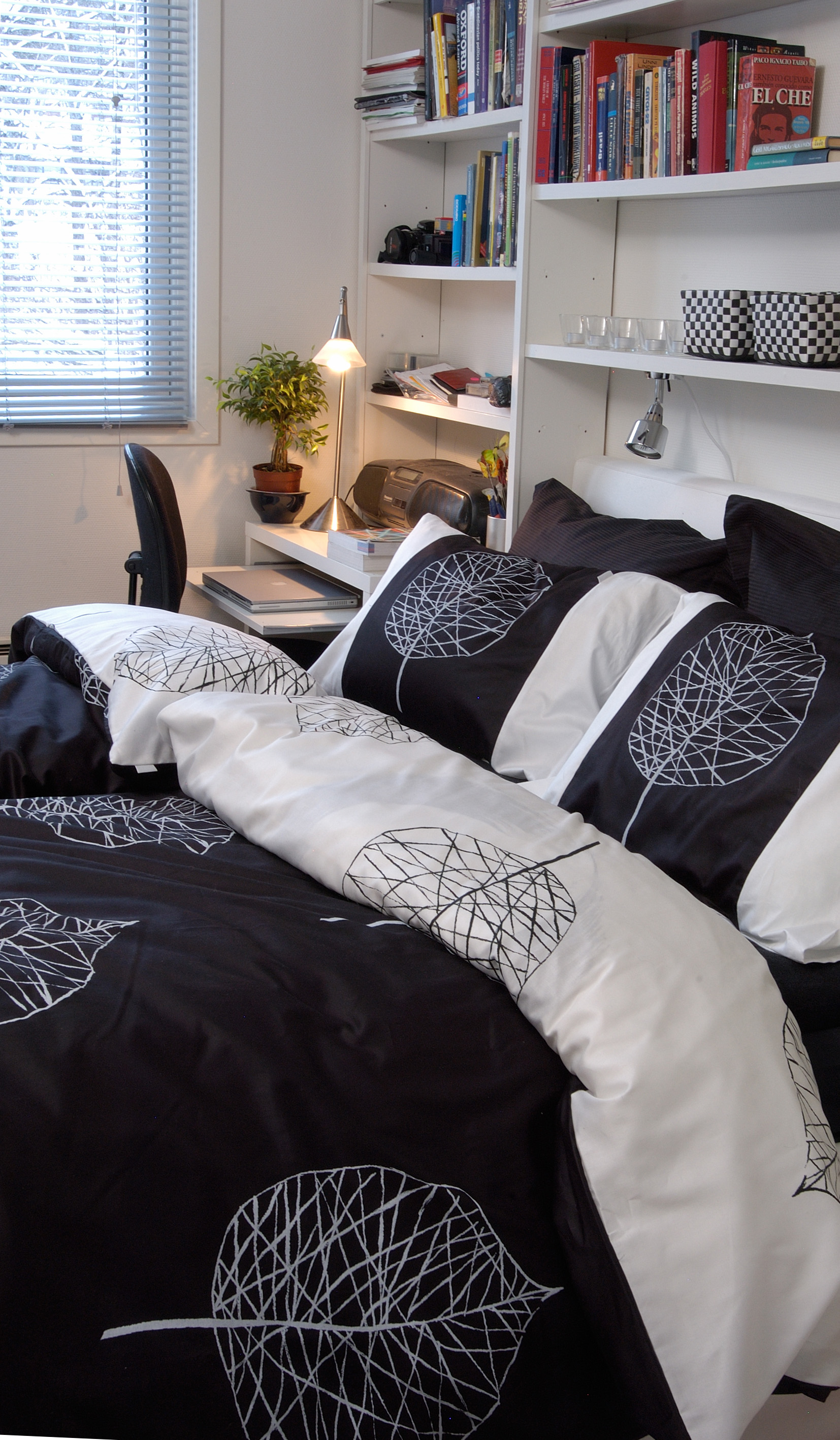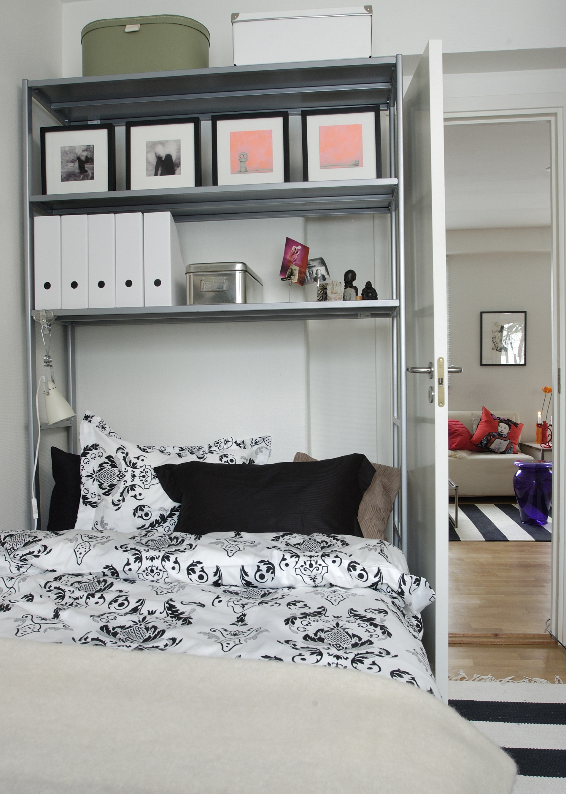 Tanker bak innredningen: Sort hvitt går igjen i hele leiligheten. Det ser rent og enkelt ut og er en grei basis for mange farger. Siden Tobiassen er tekstildesigner er det også naturlig for henne å ville skifte litt farger rundt seg. Med sort hvitt på vegger, gulv og fast innredning er det enkelt å skifte stemning ved å bytte ut tekstiler og småting.