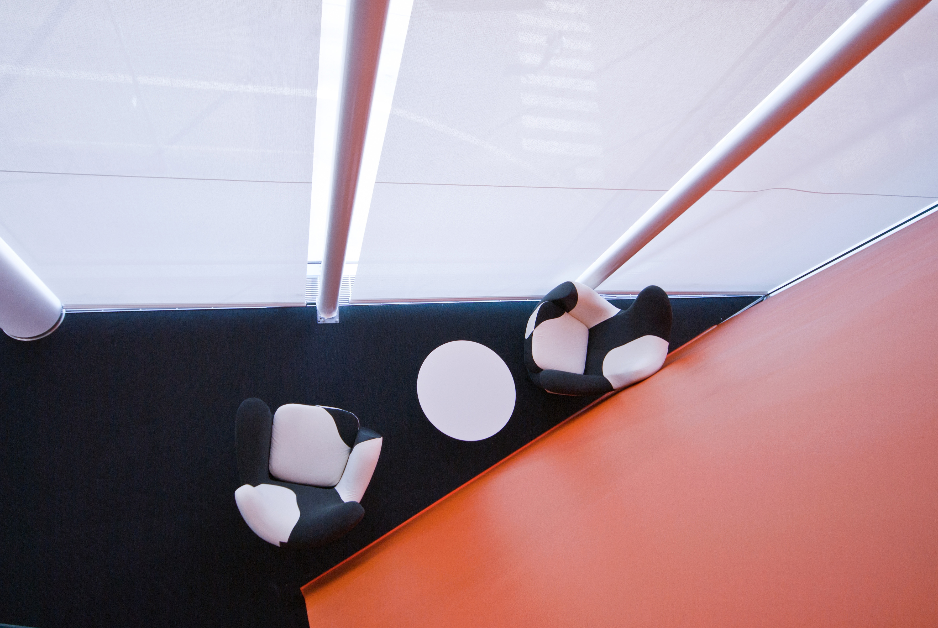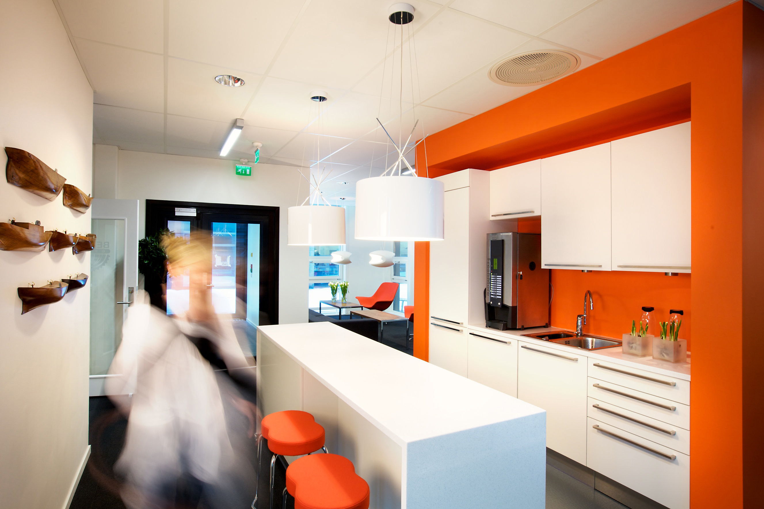 Også fellesarealene i det nye hovedkontoret til Bergen Group er innredet med signalfargen oransje, fargekode NCS S 1080-Y60R. Interiørarkitekt MNILSonja Solstrandi Sol Design, er godt kjent med den delen av fargesirkelen etter å ha brukt oransje i flere referanseprosjekt.