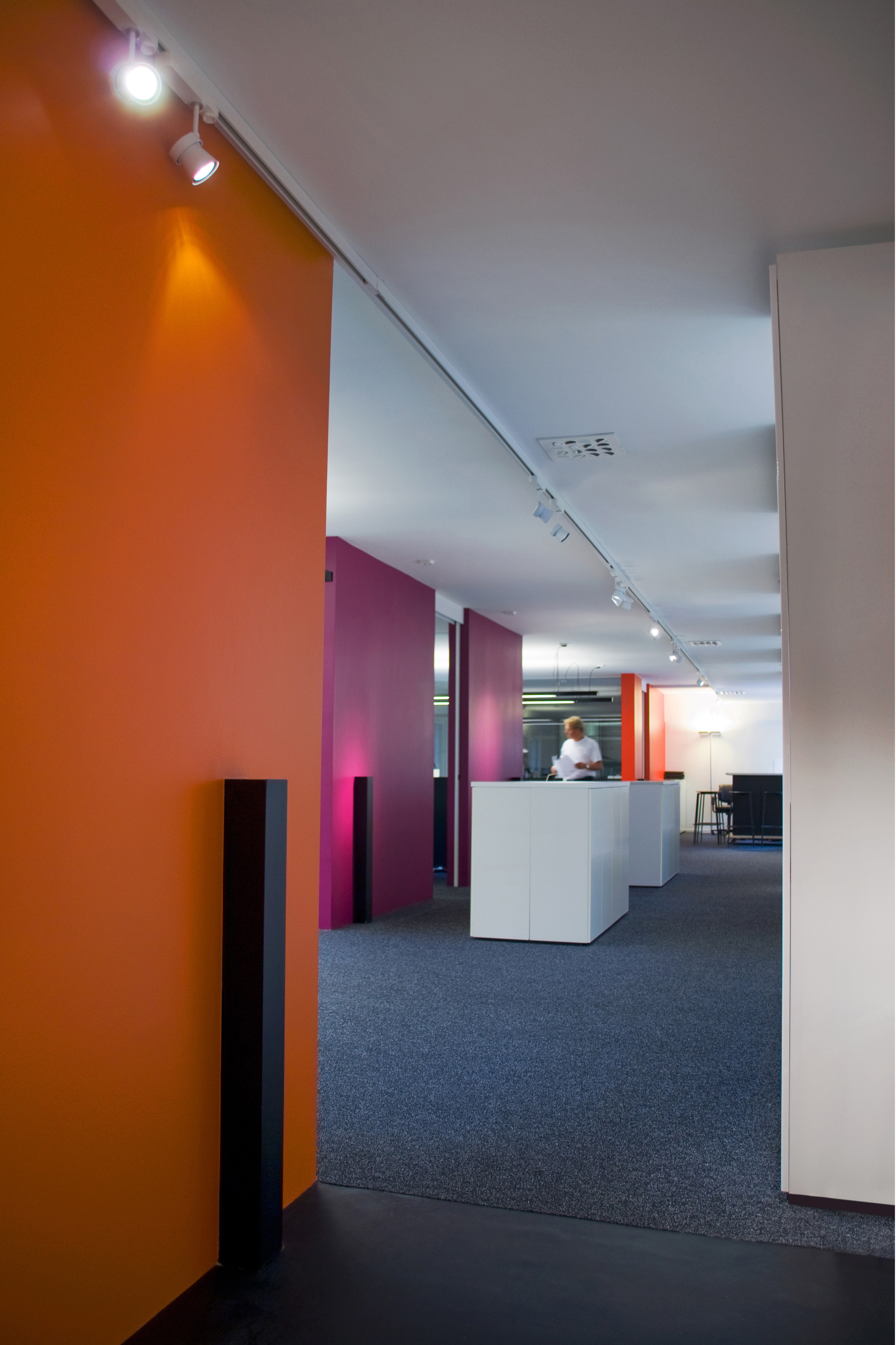– Fargekoden er noe justert i forhold til deres grafiske profil, for å fungere bedre interiørmessig og i helhetsbildet, sierSonja Solstrand. Vi har brukt oransje tilknyttet sosiale områder der folk møtes, slik som fellesarealer og pentrykjøkken. Det er et fint sted å sette farge på. Fargesettingen er roligere i arbeidsarealer, sierSonja Solstrand.