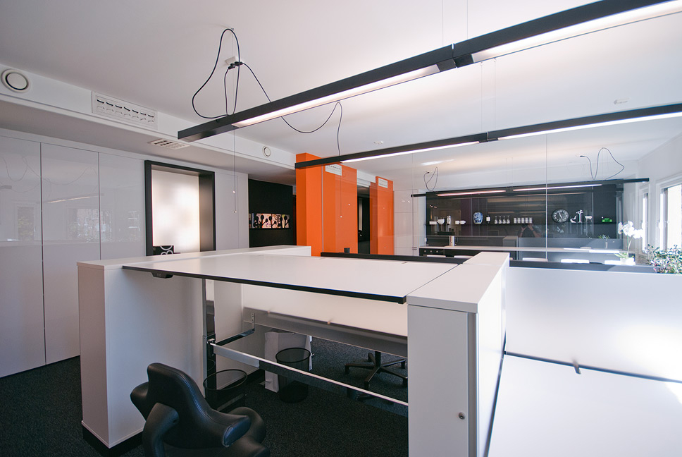 – Det er en sterk og glad farge som også er tidløs, sier hun. Bergen Group driver innen offshore, og oppdragsgiver ville at interiøret skulle gjenspeile firmaprofilen. Derfor er oransje, grått og valnøttre fremtredende elementer i interiøret, som sammen med maritime detaljer knyter an til både moderne visjoner og gamle båtbyggertradisjoner.