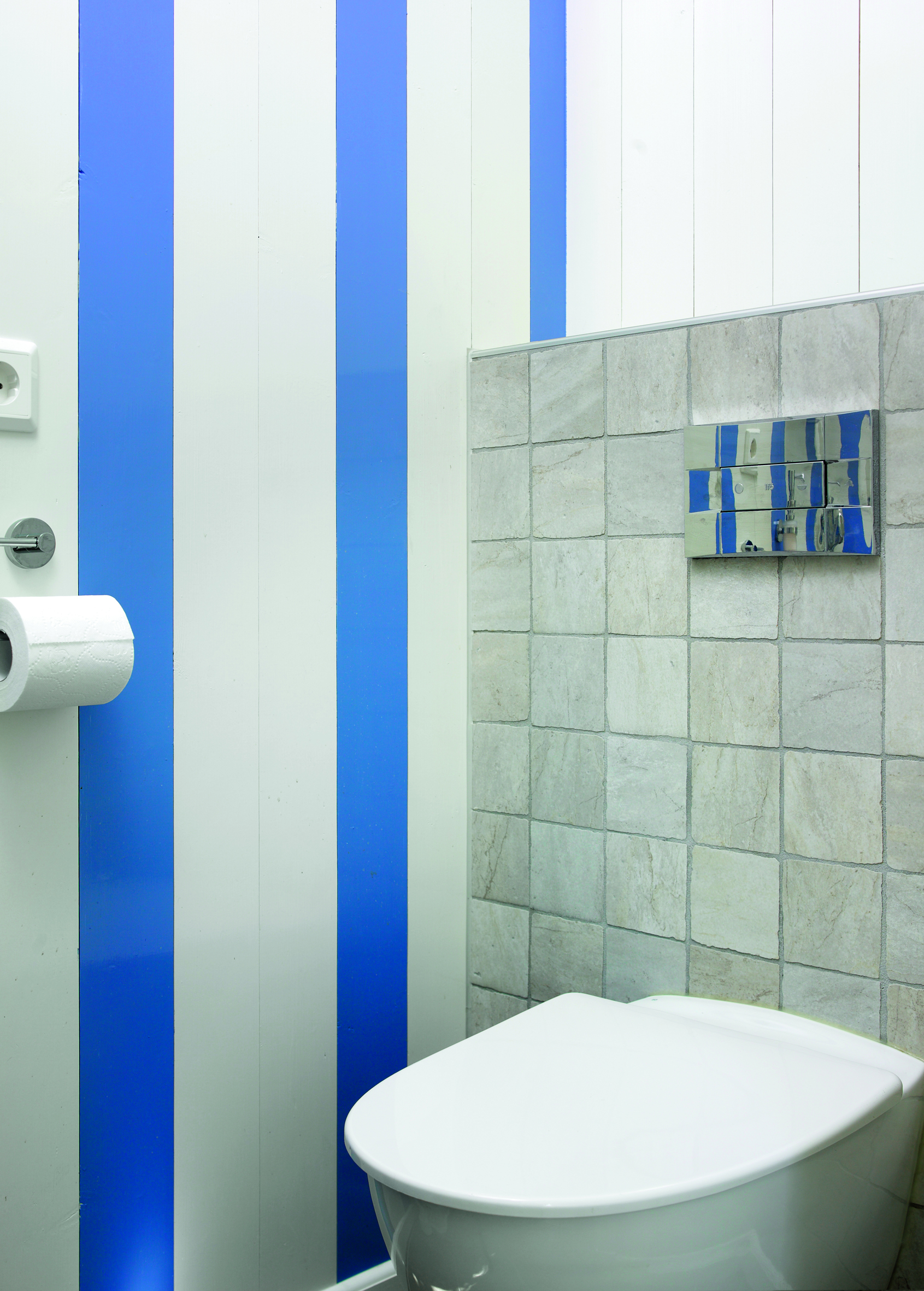 For å markere det lille toalettet, ble noen av panelbordene malt med en blå dekorfarge NCS S 3060-R80B, som står seg fint mot det ellers egghvite. At de blå stripene er malt med en halvblank maling og den hvite veggen er matt, fremhever ytterligere stripeeffekten.