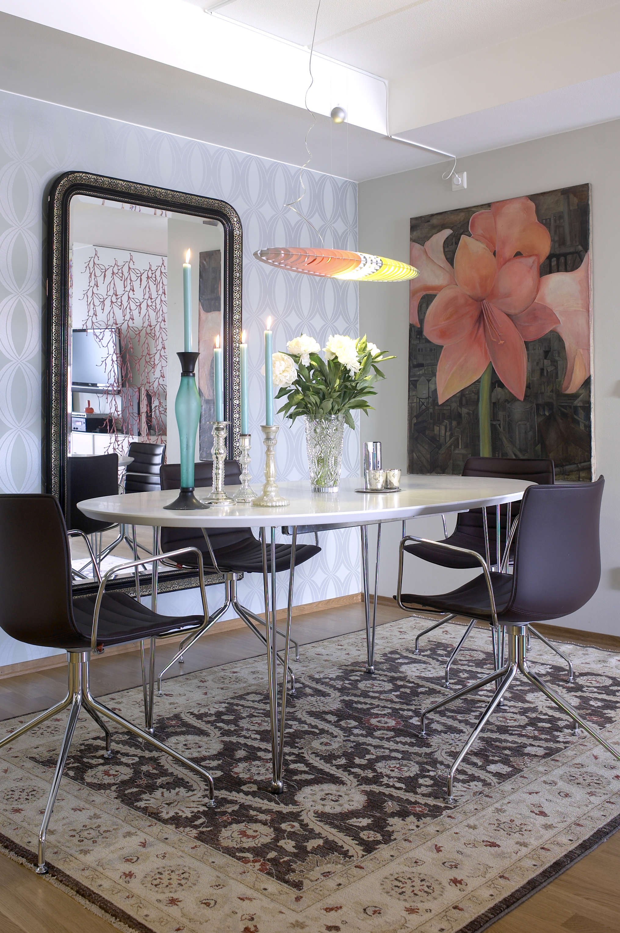 Salongbordet er en gammel furubenk som er beiset i samme farge som de brune skinnstolene. Mens romdeleren harmonerer med det røde teppet, og de røde innslagene i det persiske teppet under spisebordet.