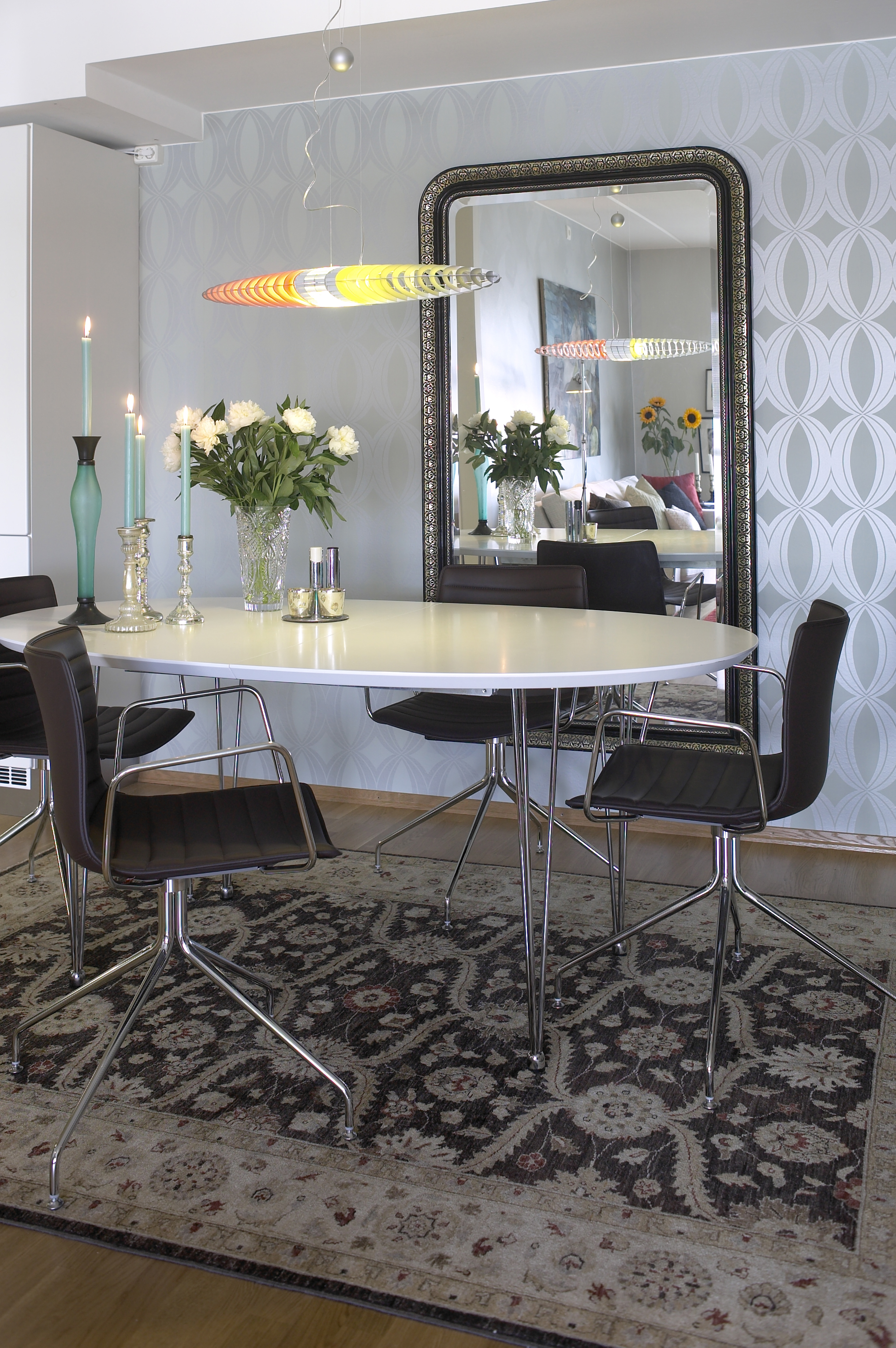 Rundt salongbord og spisebord står like, brune stoler i stål, som er svingbare. Når eieren har mange gjester, er det derfor bare å sette alle stolene rundt spisebord eller salongbord. Løsningen er både plassbesparende, og økonomisk.