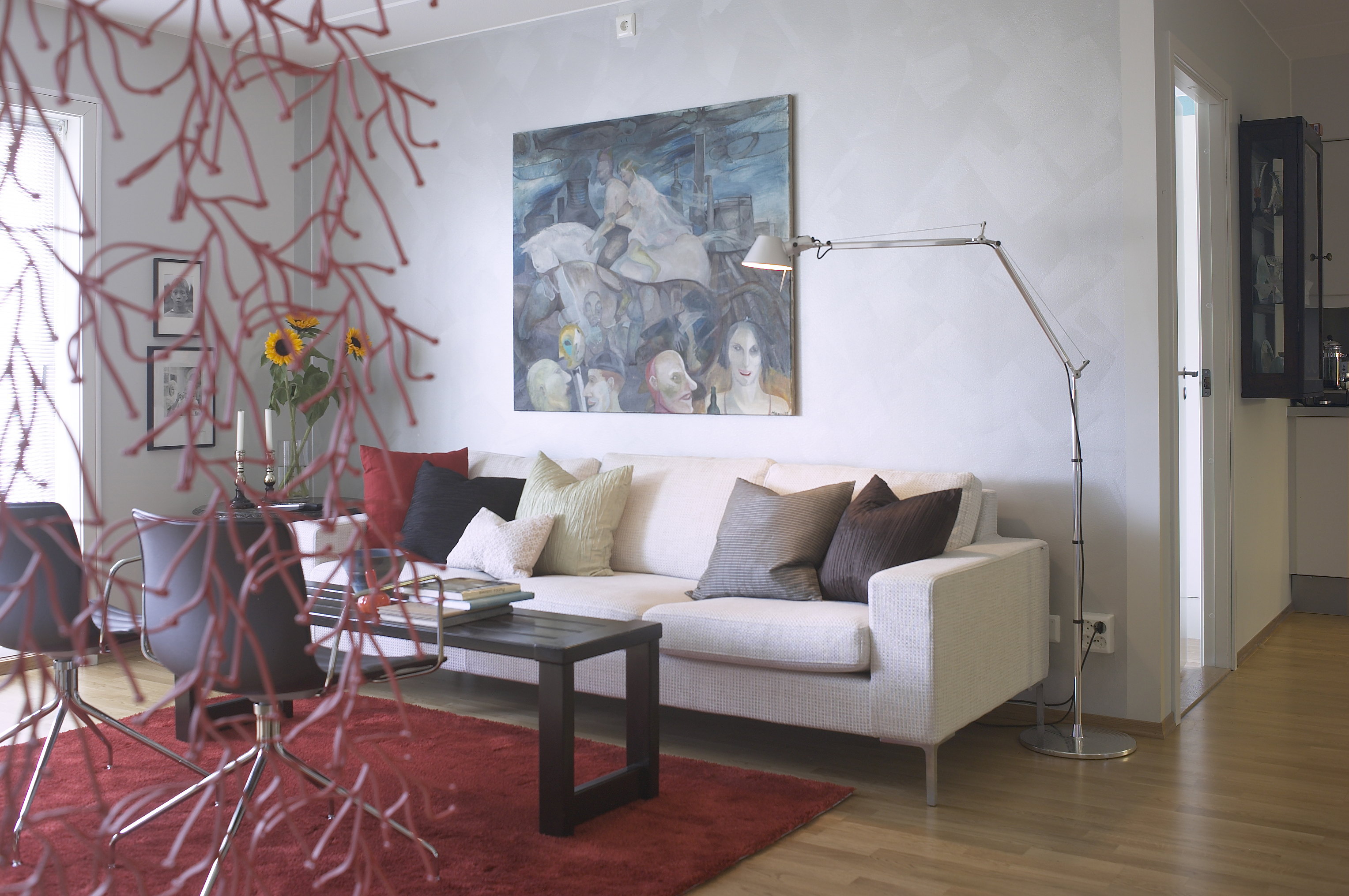 Et rødt, flott teppe i salonggruppen er knyttet i ull og lin, og binder møbelgruppen sammen. Mens gulvlampen i aluminium er plassert slik at den gir godt leselys.