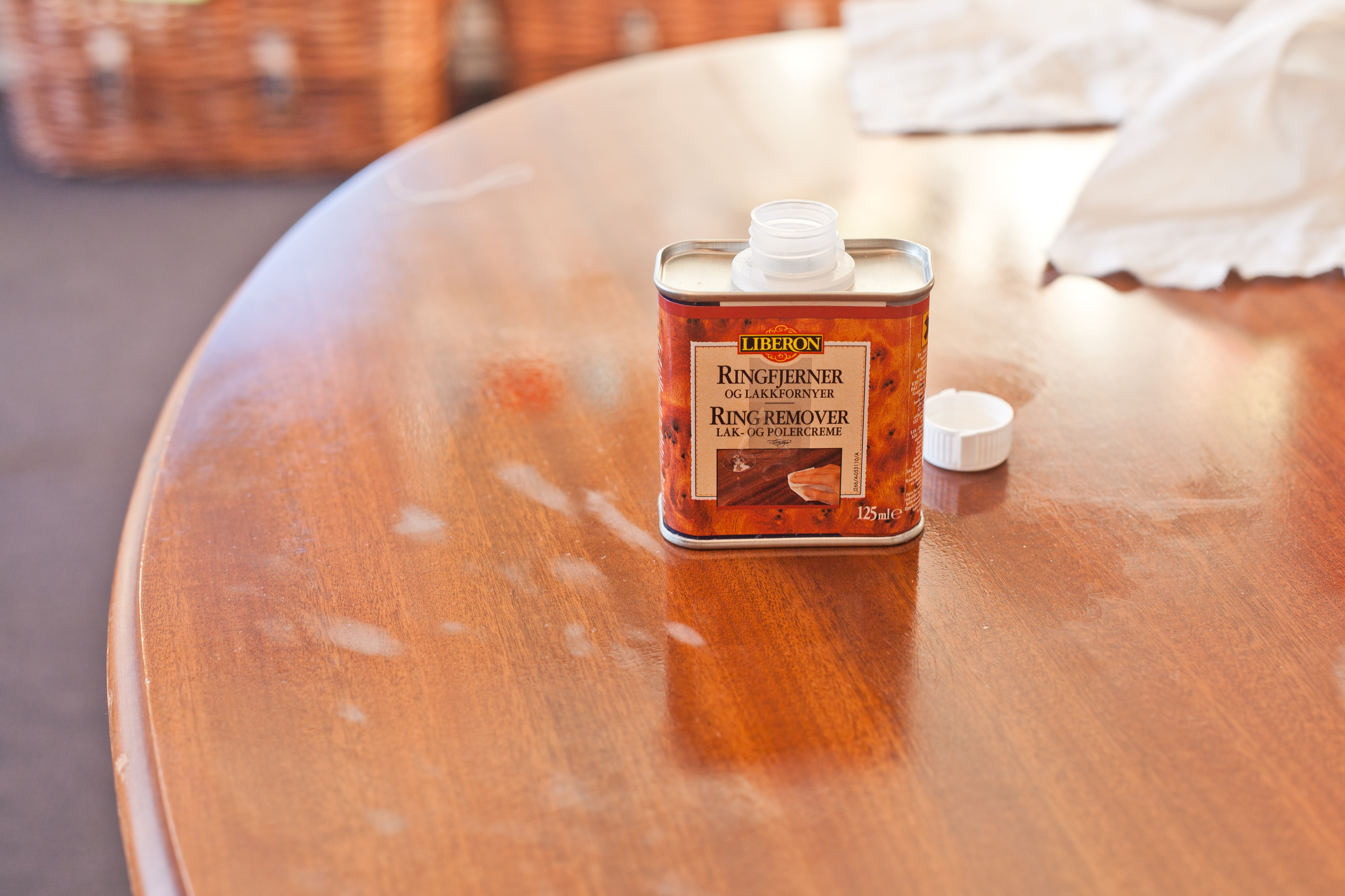 Er flaten lakkert med skjellakk, og det hvite merket har kommet grunnet litt vannsøl, kan Ringfjerneren allikevel bøte på problemet. Det beror på at fargeforandringen kun sitter i toppen av skjellakkfilmen.
