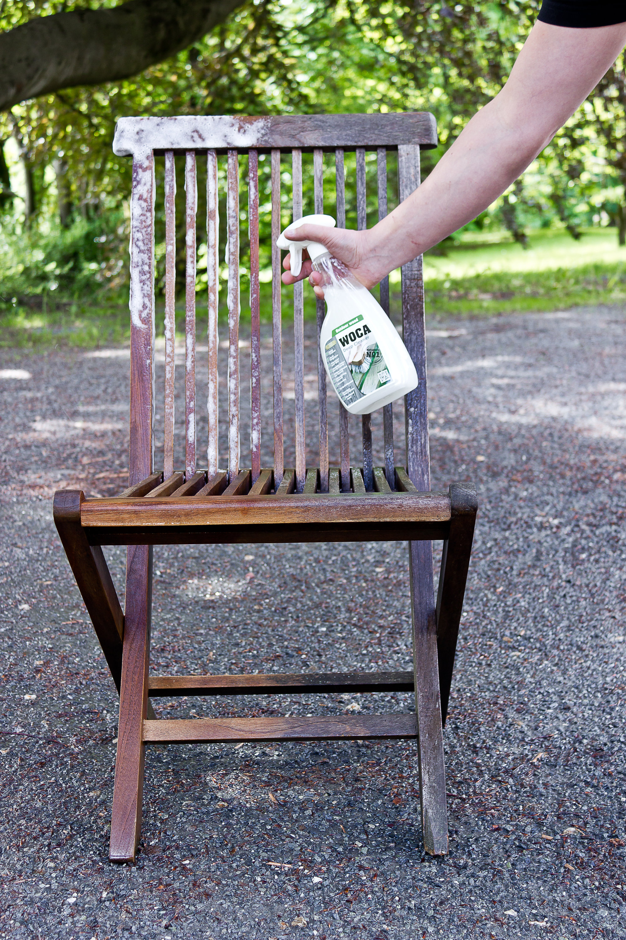 Middelet han bruker, WOCA Grunnrens, dyprenser treverket for olje og smuss og kan brukes til hagemøbler i alle treslag med unntak for eik.