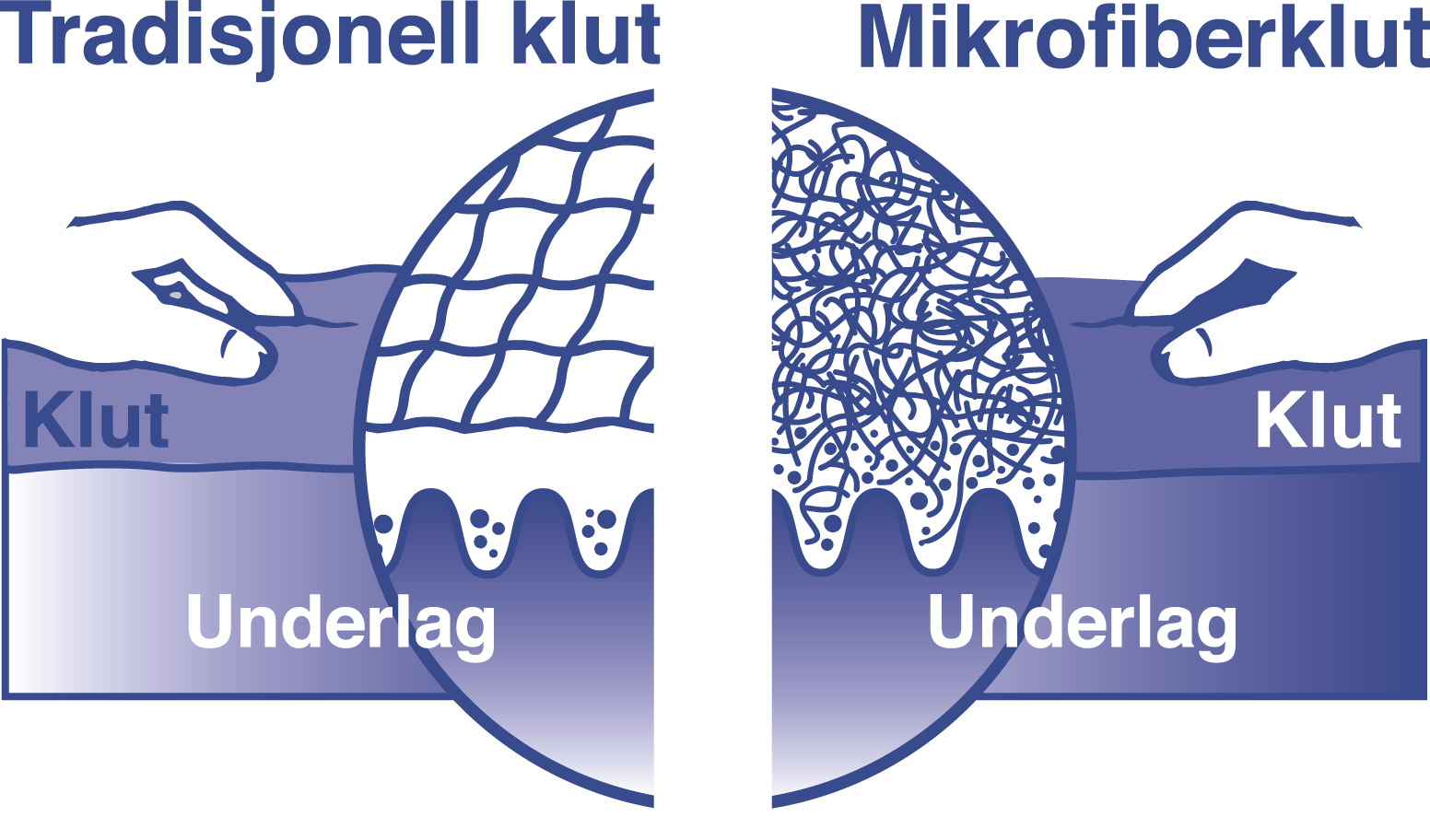 Mikrofiber har en sterkere rengjøringseffekt enn såpe og kjemikalier. Grunnen er at fibrene er sprengt i mer enn 1000 ganger finere fibre som trenger dypere ned i underlaget der det løsner og tiltrekker seg store og små partikler samt mikrostøv, se illustrasjon. Kluten kan brukes både med og uten vann. Hovedregelen ved bruk av mikrofiber er at smuss påført tørt, fjernes med tørr klut. Flekker som er påført vått, fjernes med fuktig klut. Du kan bruke såpe, men kluten gjør best rent uten.