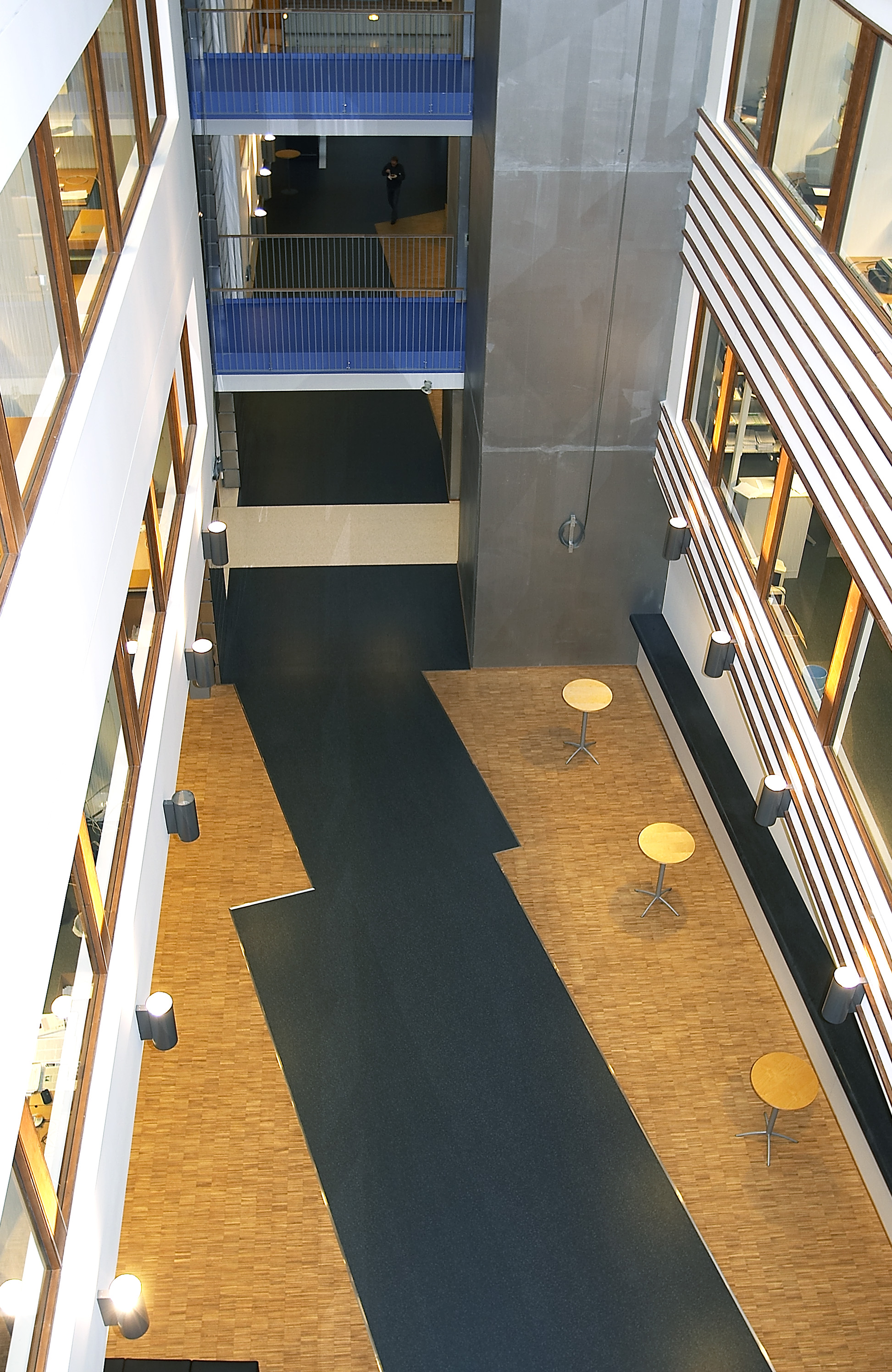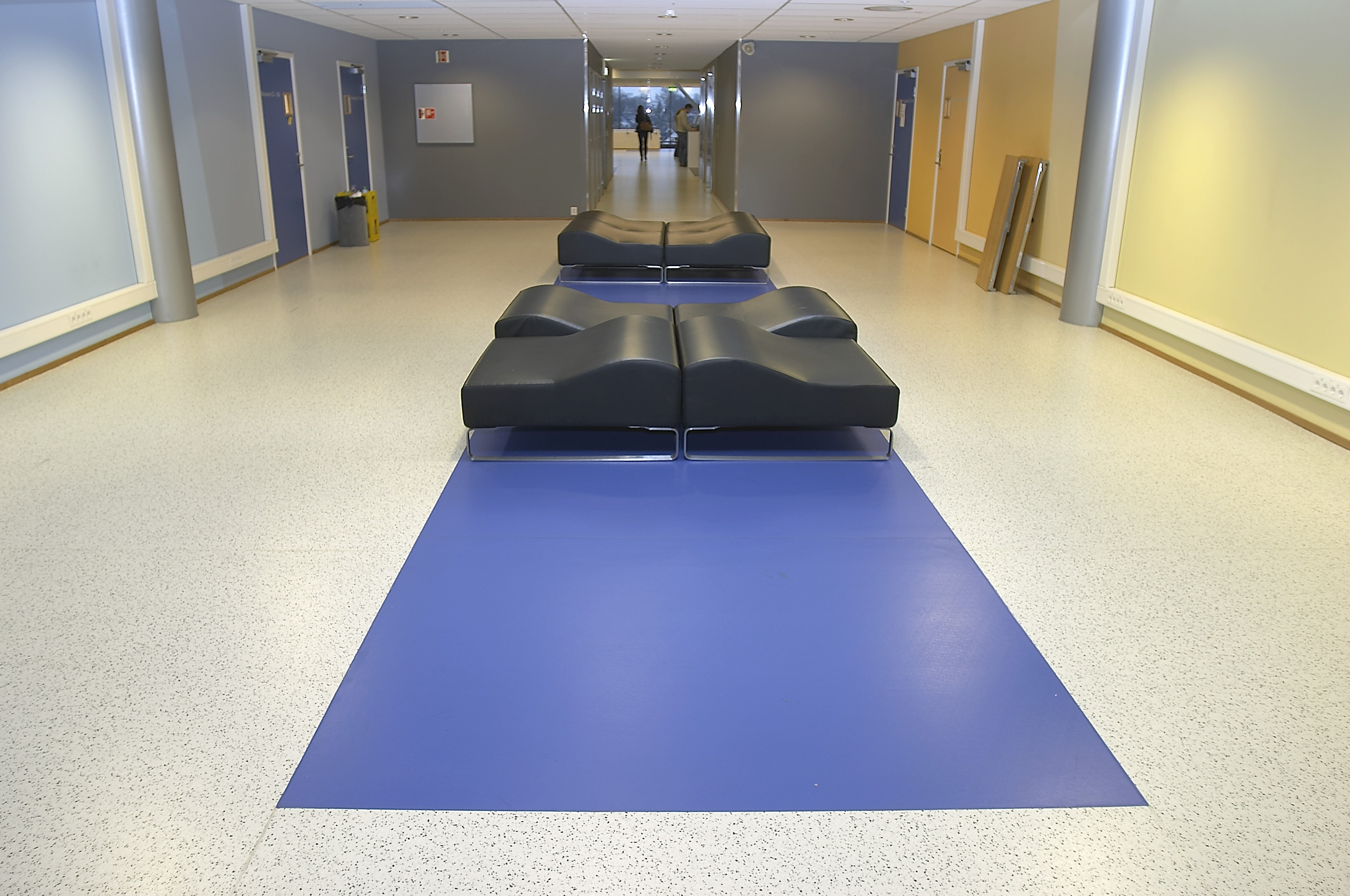 - Det var 3-4 runder med prøveproduksjon hos Armstrong DLW før man valgte farger og mønstre, forteller salgsansvarlig Tor Erik Ekeberg hos Intep. - Belegget som er valgt er Contract Acoustic, en lyddempet vinyl som på utsatte områder har fått et underlag for ekstra demping. På de fargesterke gangveiene er det valgt vinylbelegg fra Gerflor.
