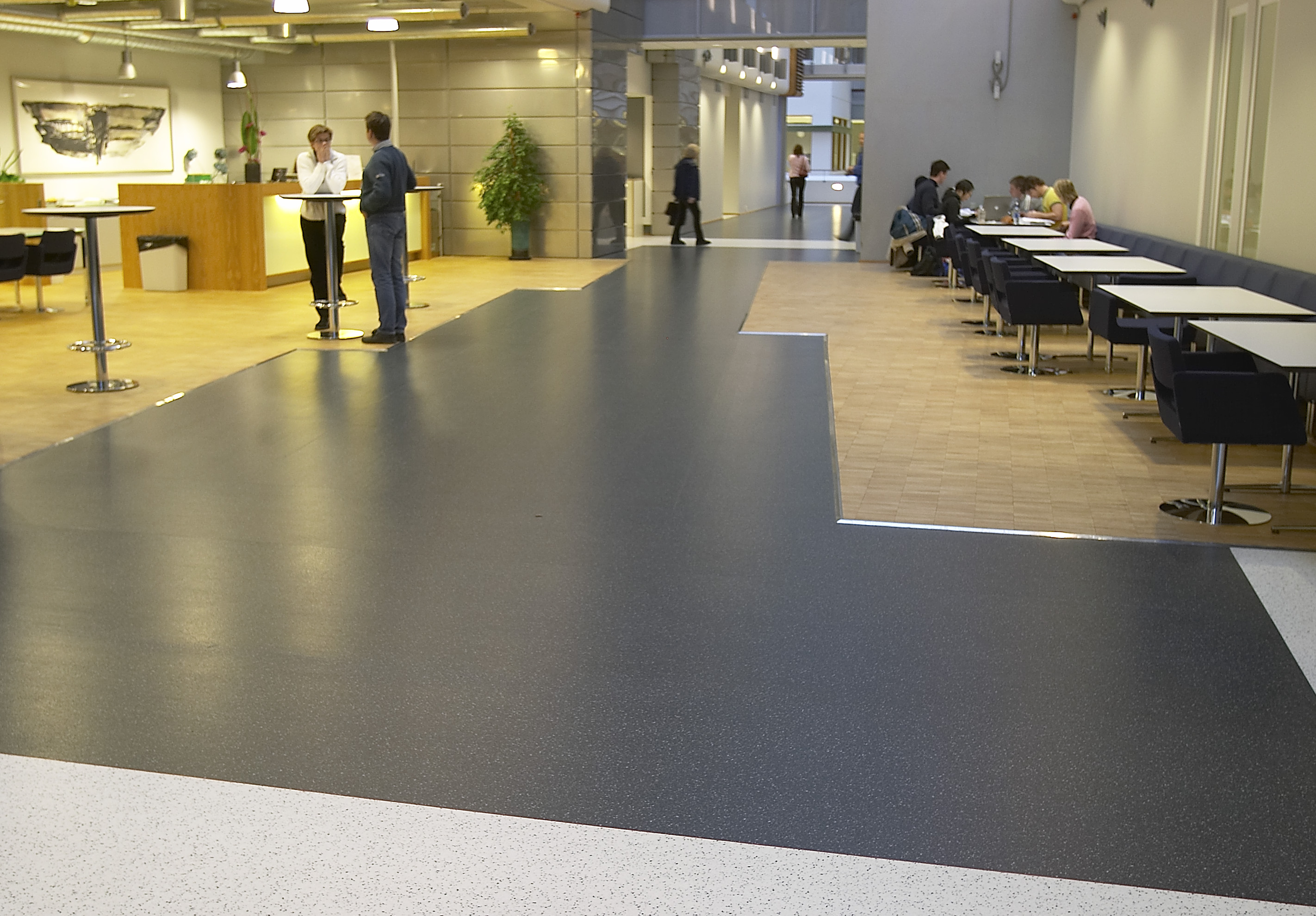 Gulvene i bygget er et kapittel for seg - fra slipt betong til myke tepper, ofte i overraskende og spennende kombinasjoner. Intep AS har stått for legging av 60.000 kvm gulvbelegg, hvorav halvparten er vinyl. Hovedfarger/mønstre er en hvit vinyl med sorte innslag, og sort med hvite innslag. Begge gir en terrazzo-effekt og er et spesialdesign. Med Intep som koordinator er mønsteret utarbeidet gjennom løpende dialog mellom arkitekt og produsent.