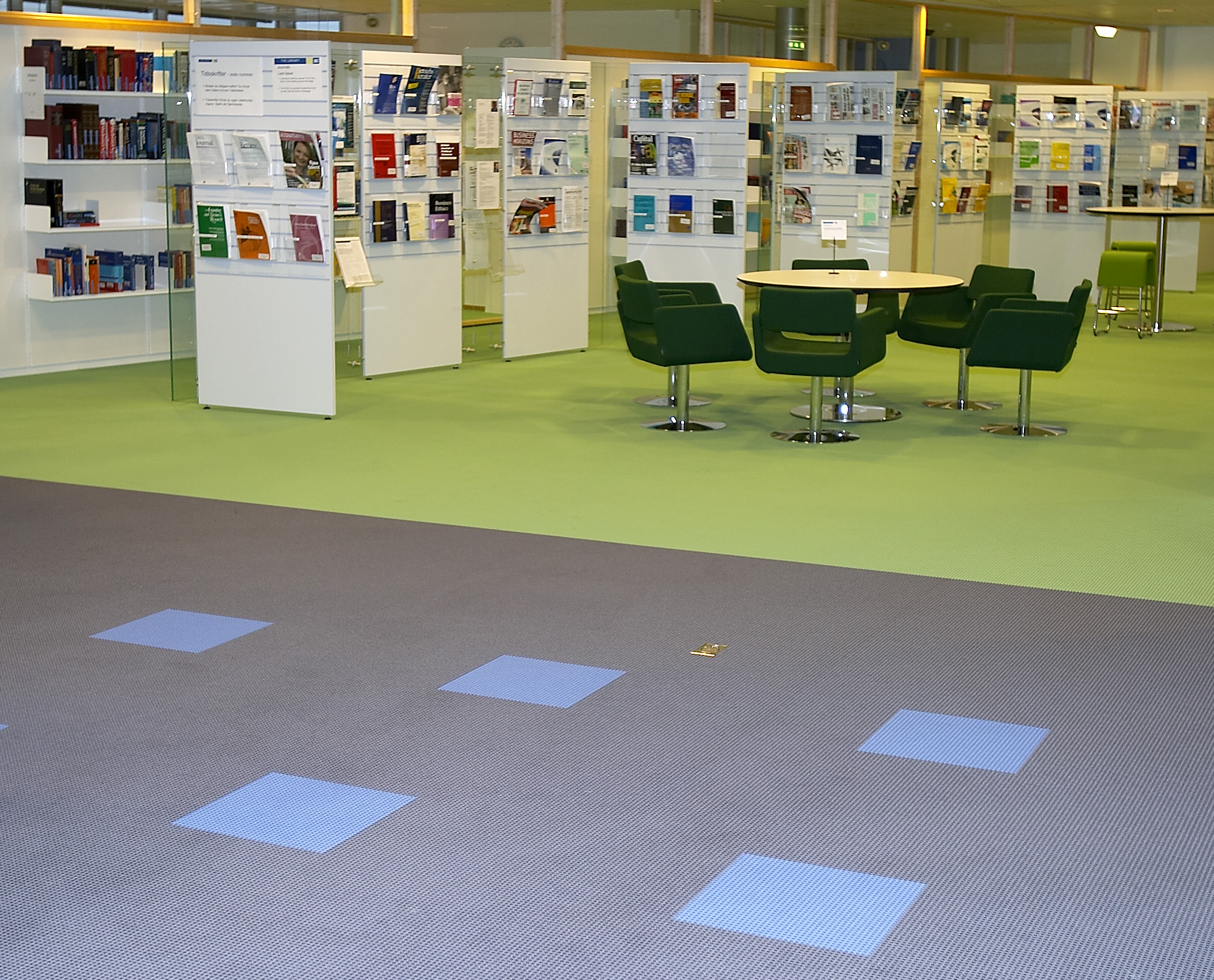 - I biblioteket og en del andre lese-områder er det valgt Flotex-tepper fra Intag AS. Teppet har slitestyrke og rengjøringsegenskaper som ikke så mange andre tekstile belegg kan vise til, fortsetter Ekeberg. - Grønnfargen er en spesialfarge etter arkitektens ønsker. Ellers ligger det høykant- og mosaikkparkett i en del områder. Disse er slipt, sparklet med woodfiller, slipt på nytt med stadig finere papir og til slutt oljet.