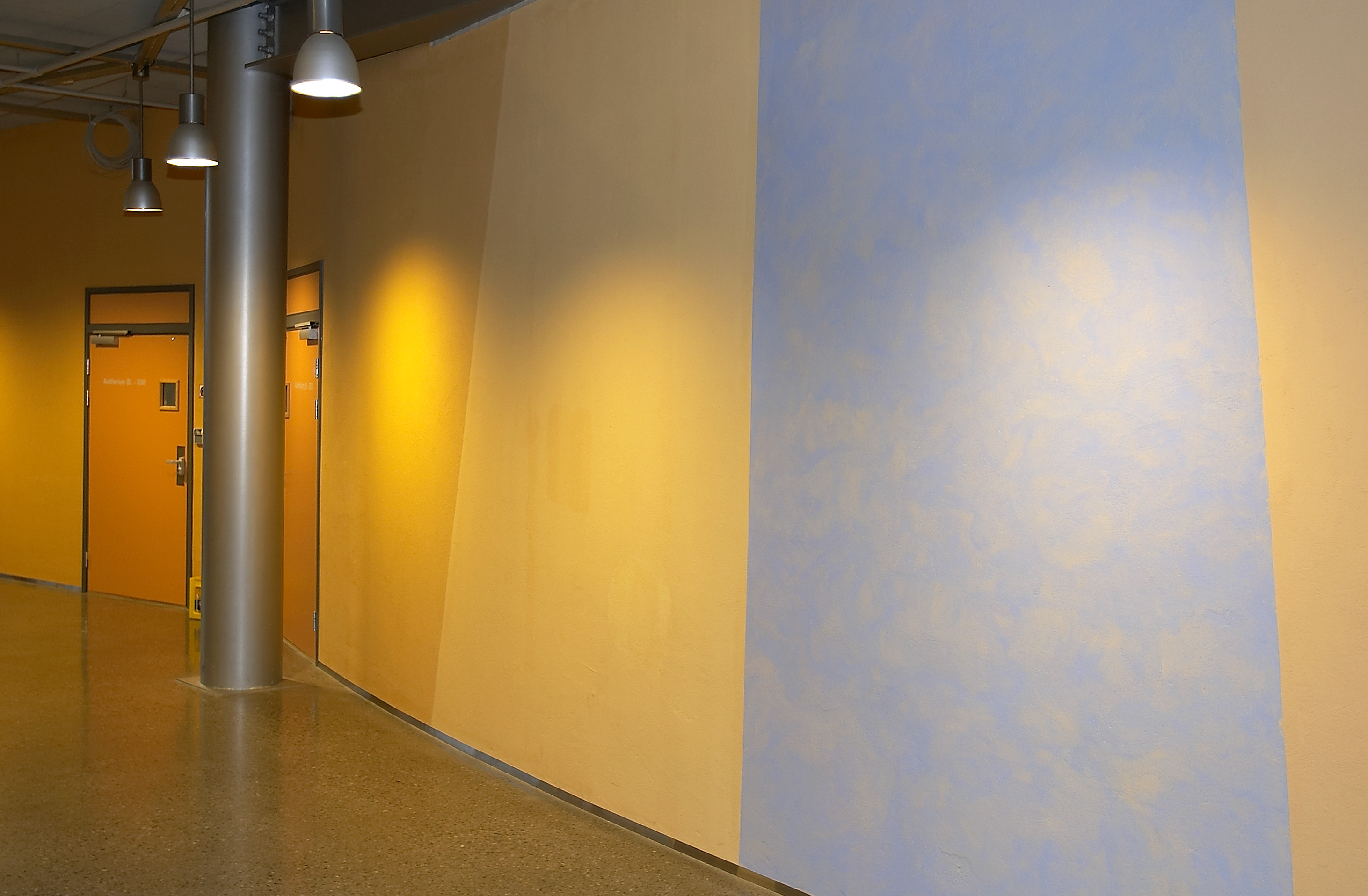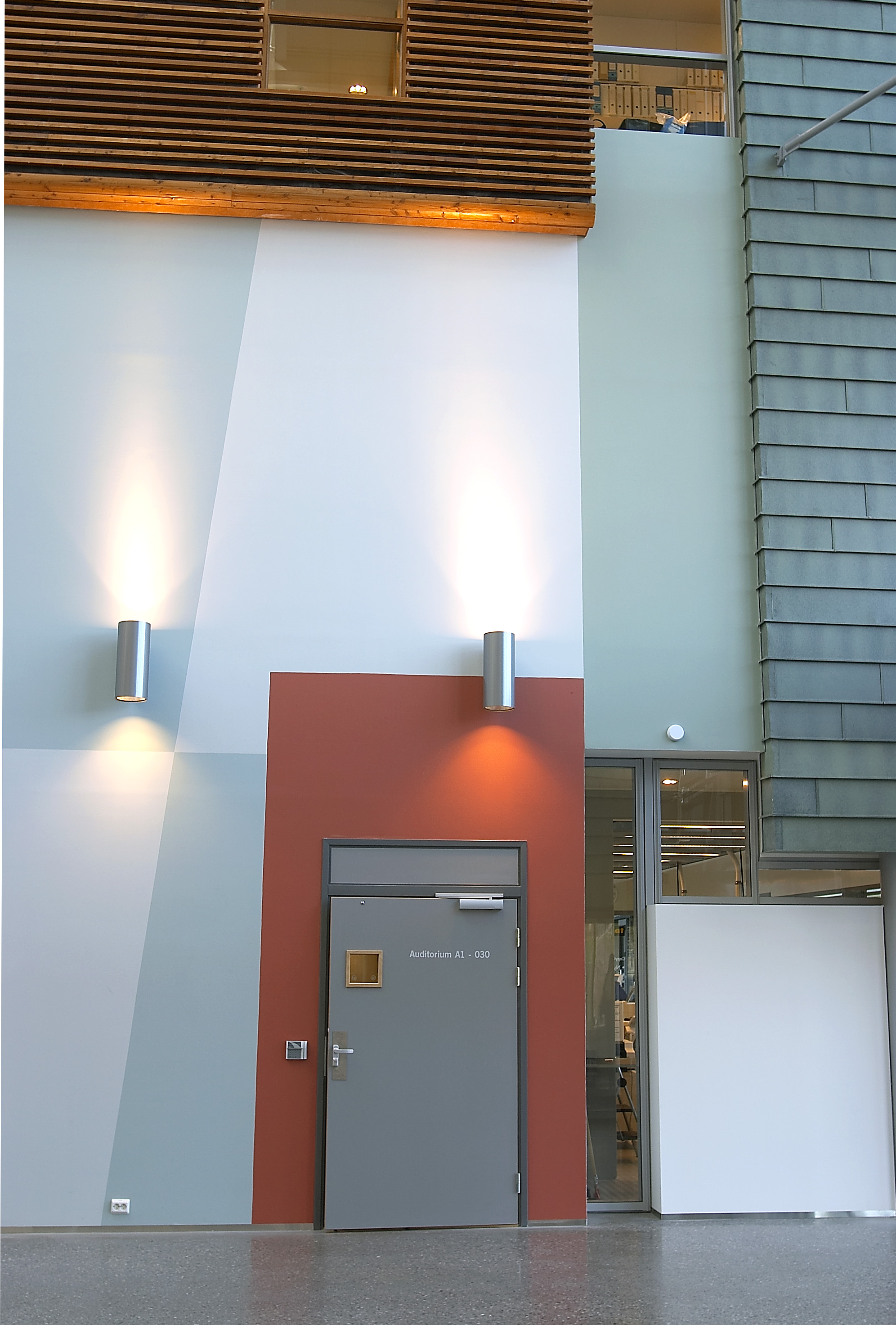 - Opprinnelig var alle vegger innvendig tenkt hvite, men den fargesettingen vi nå ser har vært helt avgjørende for hvor flott det er blitt her, sier Liz-Heidi Leonhardsen i Nydalen Campus. - Det startet med at vi ønsket å gi BI en gave i form av kunstnerisk utsmykning. I dialogen som fulgte ga også BI et bidrag. Etter forslag fra arkitekten ble det besluttet å dekorere en del av veggene fremfor å kjøpe inn kunst.