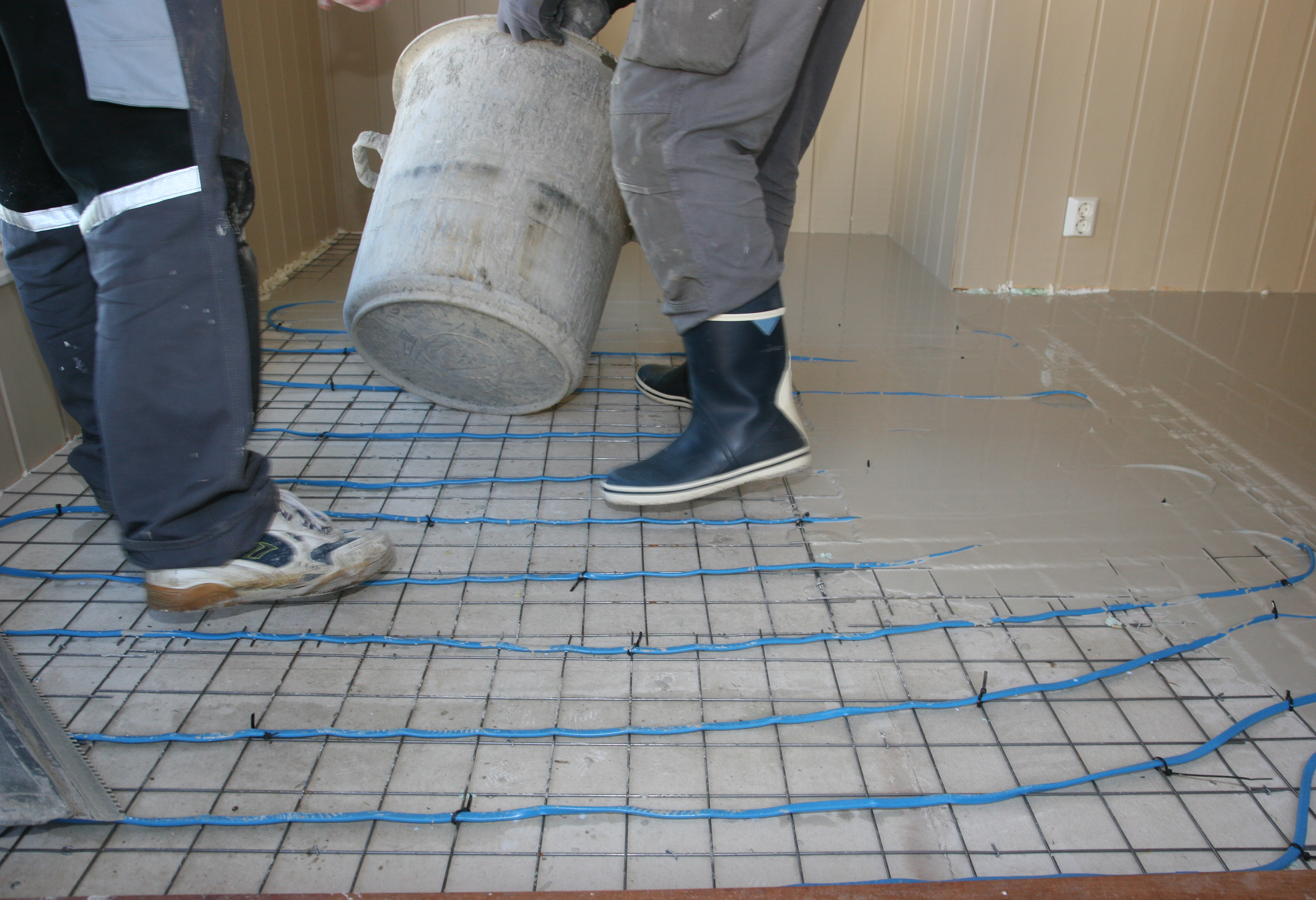 Avrettingsmasse blandes utendørs og skal har konsistens som en vaffelrøre. Det vil si at den ikke flyter utover av seg selv, men trenger litt hjelp. Bruk riktig verktøy og sjekk at massen er klumpfri og uten luftbobler. Avrettingsmasse basert på gips med fibertilsetning krever ikke så lang herdetid som sementblandinger. Når den er størknet, kan man ganske raskt skru på varmekablene.