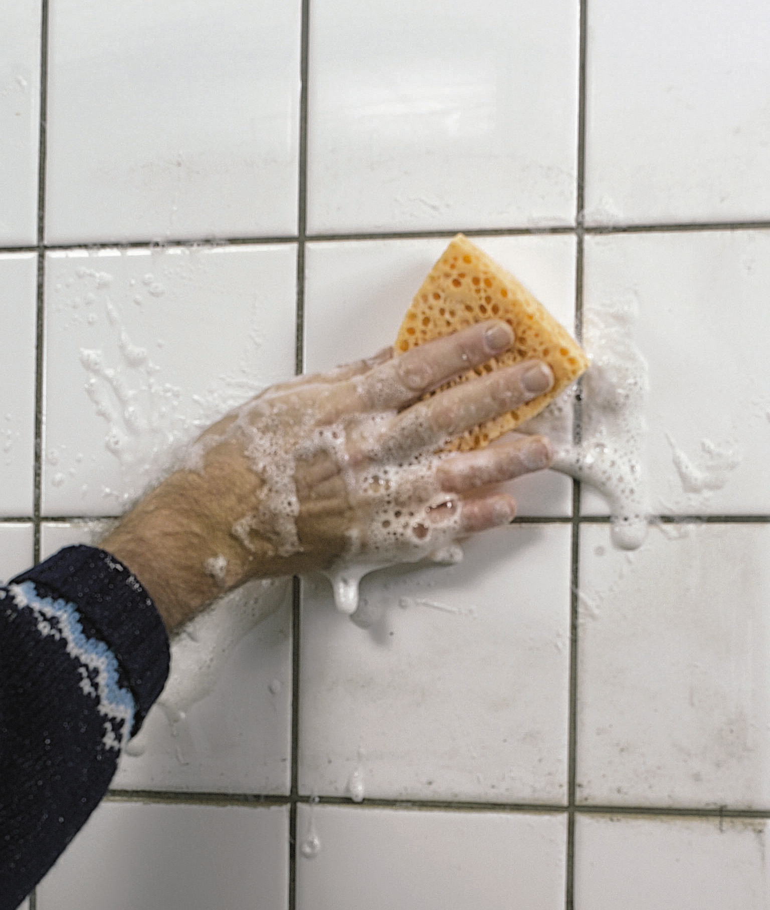 Alle rester av fett, smuss, kalk, såpe osv må bort - både fra fliser og fuger. Du kan enten vaske med eddikvann (en del eddik til fire deler vann), eller klorin først og et sterkt vaskemiddel med nedmattende effekt etterpå. Uansett valg av vaskemiddel må du være veldig grundig og skylle godt med rent vann etterpå.