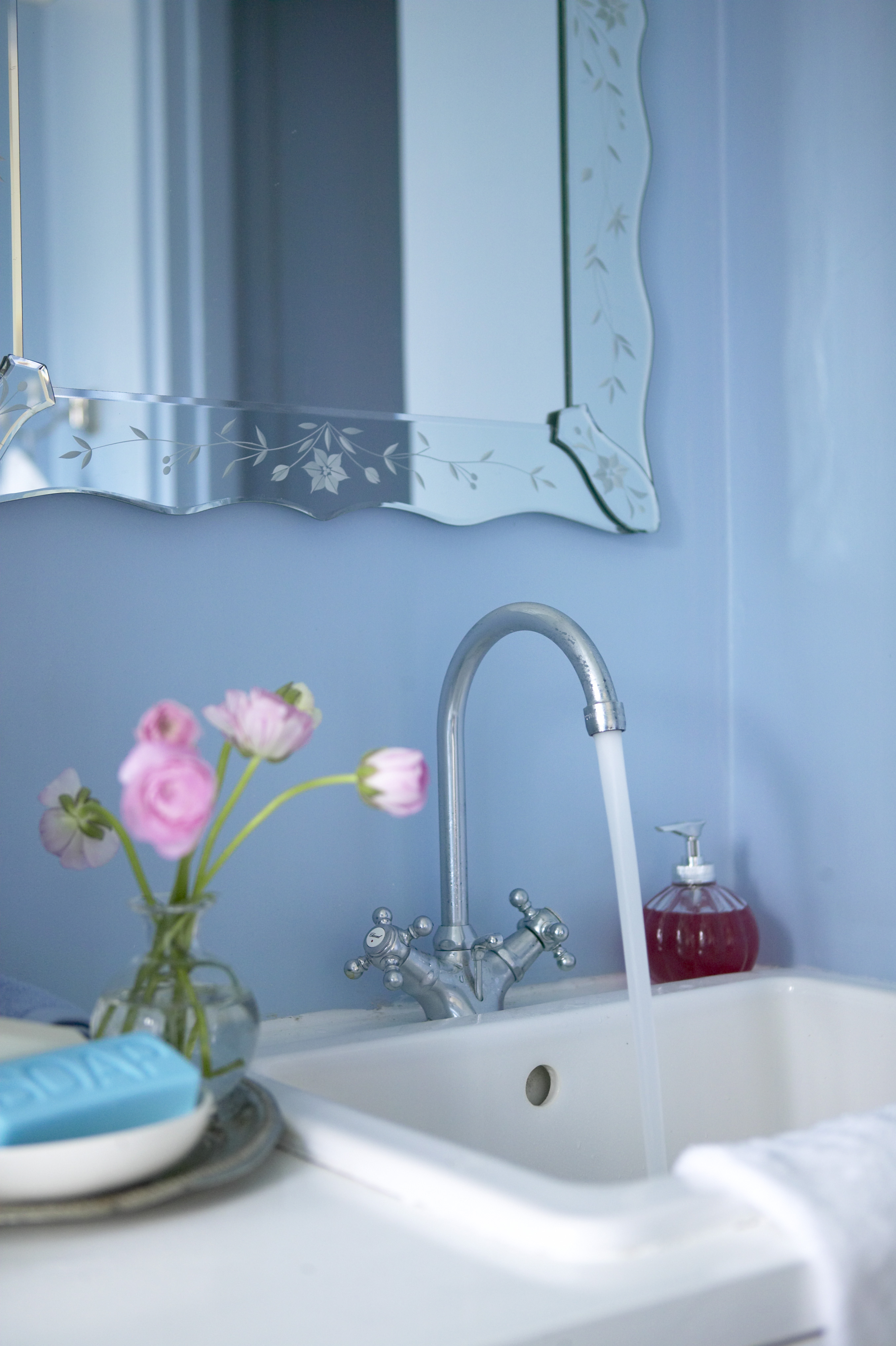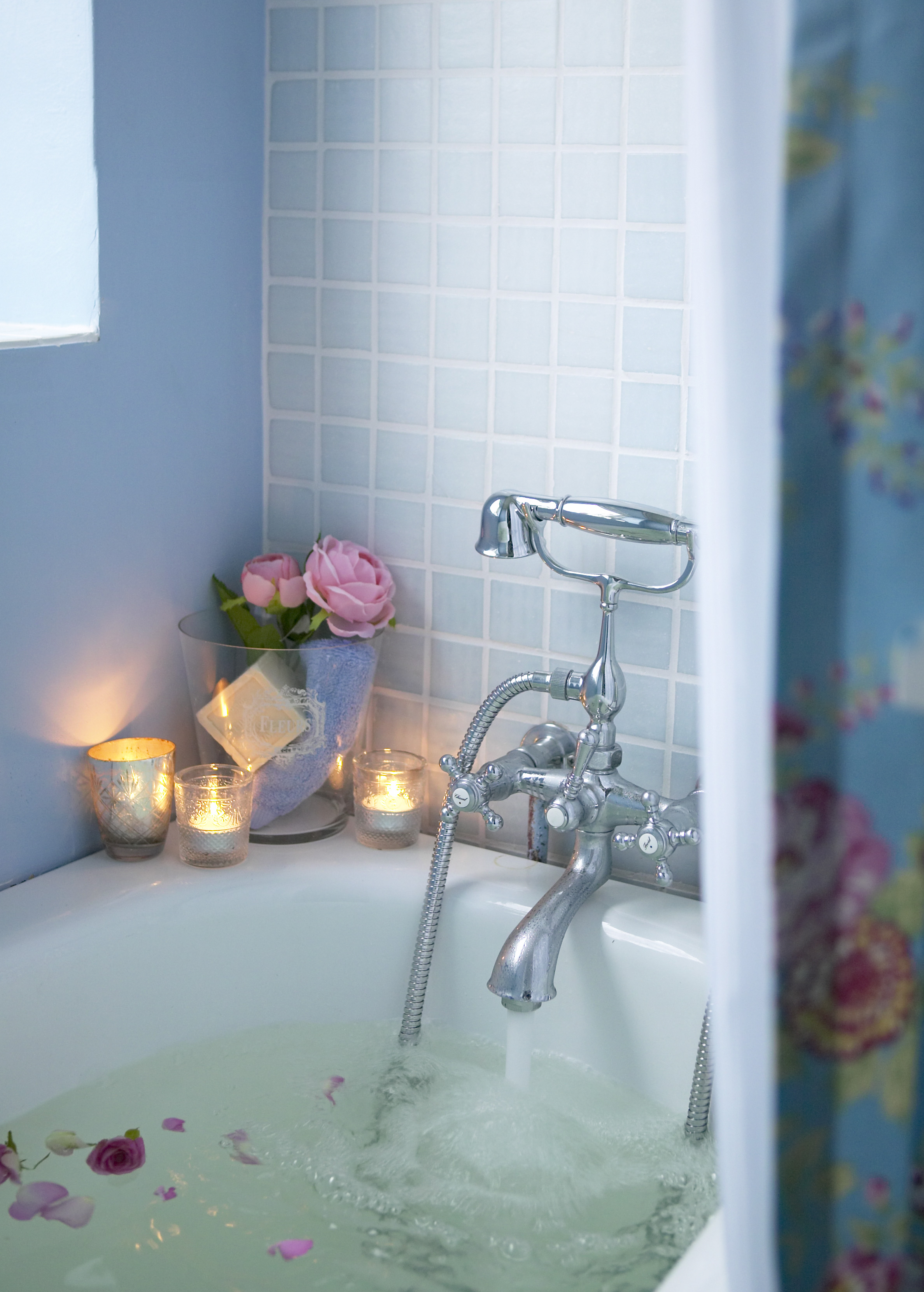 Yndige tekstiler med blomstertrykk og blonder var med på å gi farger og lunhet til baderommet. Et gjennomsiktig dusjforheng i plast, ble gjemt bak nydelige, pastellfargede tekstiler som ble knyttet med bånd rundt dusjforhengstangen. Det samme tekstilet ble benyttet i frontene på det innebygde skapet i forgangen. Speilrutene ble skåret ut og erstattet med tekstil og hønsenetting, noe som ga et litt gammeldags og romantisk preg. Og vaskemaskinen under servanten ble skjult bak hvite blondetekstiler.