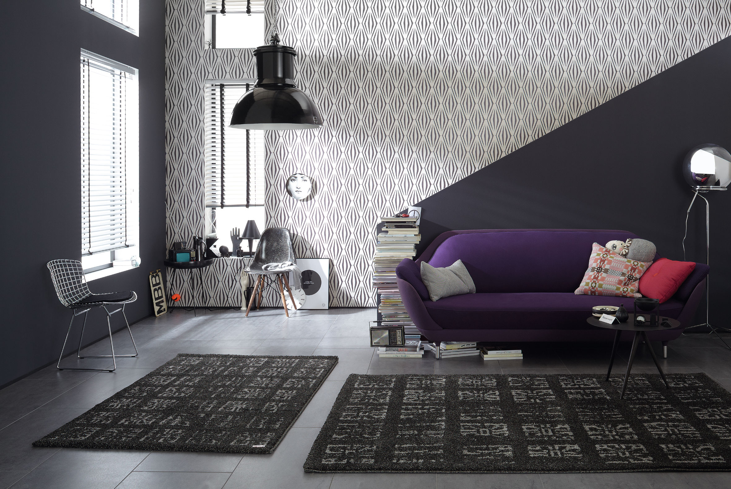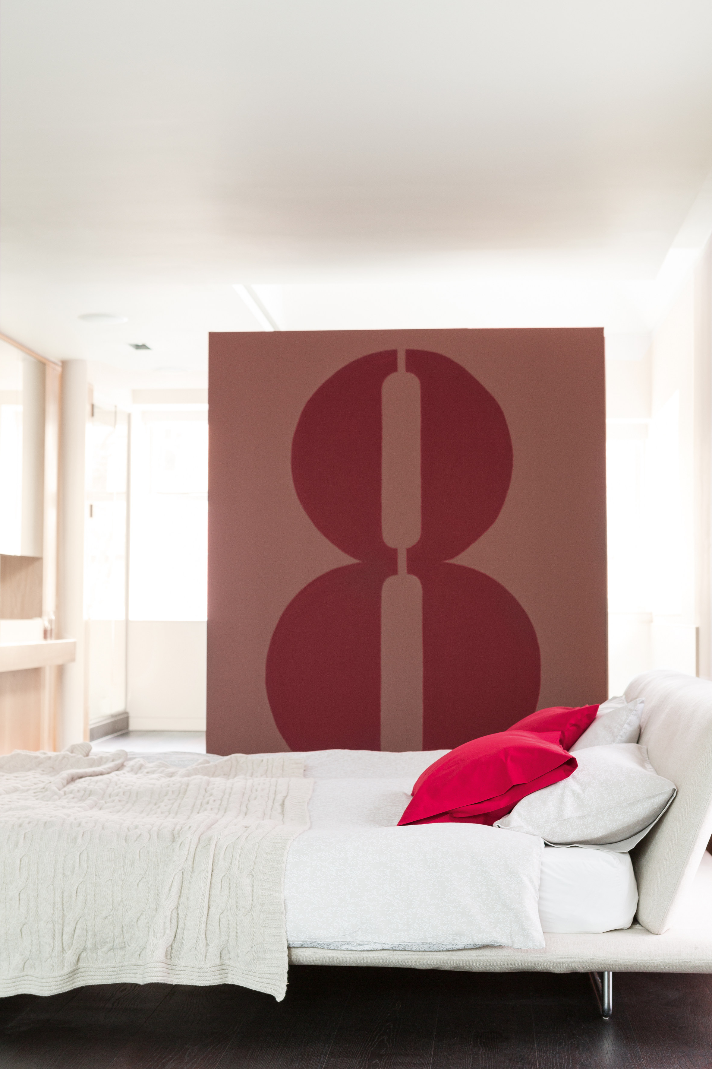 For at veggen ikke skal bli en stor, ruvende flate som står alene, gjentas fargen i andre elementer i rommet. Jo mer farge som allerede er i rommet, jo sterkere bør uttrykket til fondveggen være. Tenk helhet. Formspråket taler både til møblementet, til listverket som rammer det inn, og til andre farger og materialer i rommet.