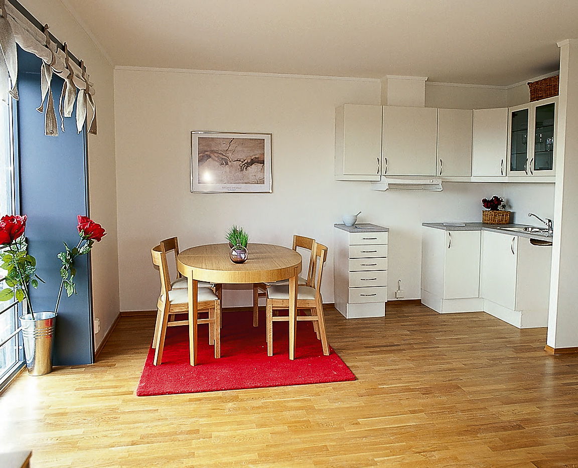 Gulvene i leilighetene har fått eikeparkett som er lagt på flytesparklet betong. Her er det lagt gulvvarme under tregulvet. Alle bad er flisbelagt.