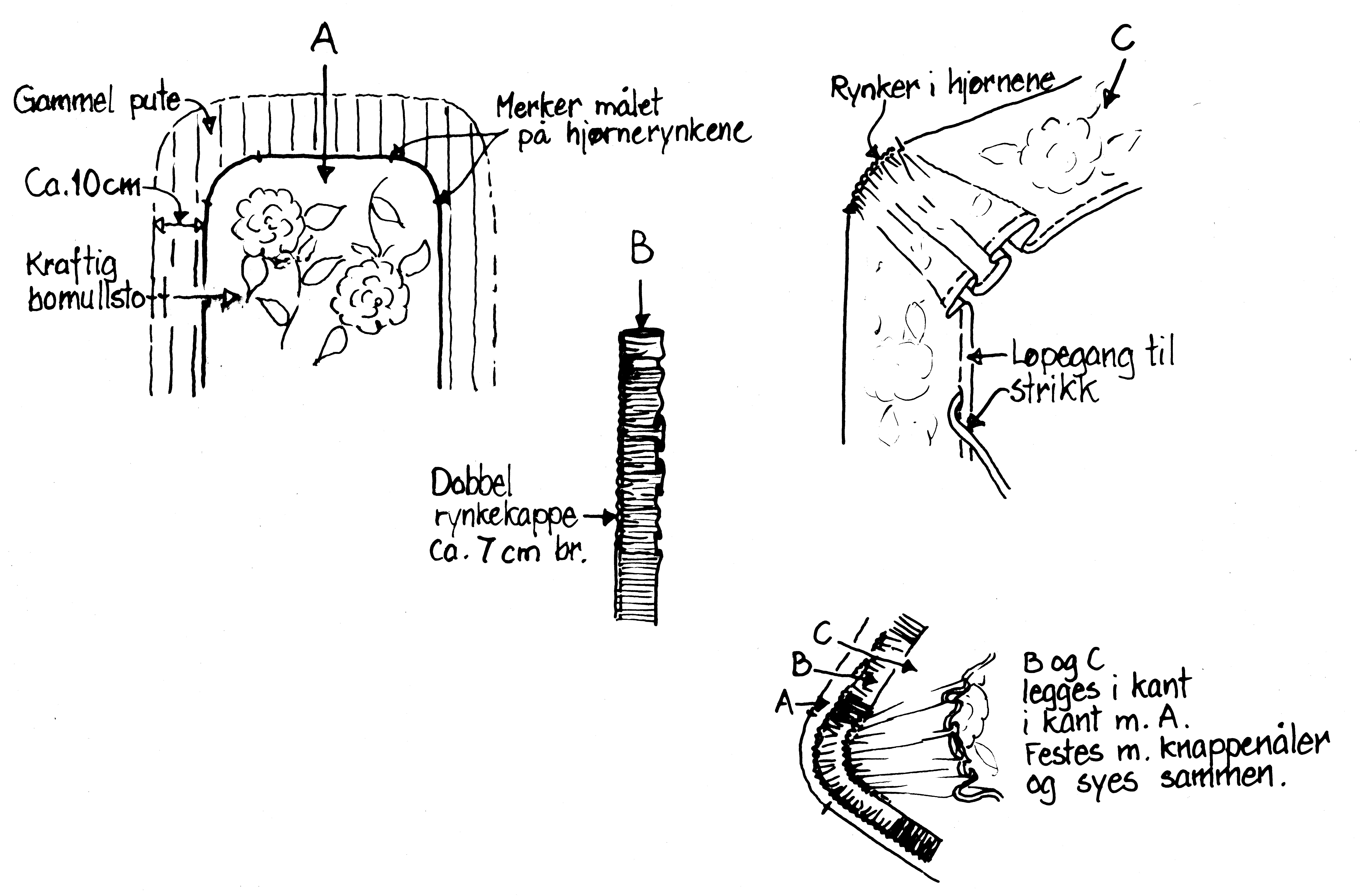Av et kraftig blomstrete bomullstoff sydde vi et trekk med strikk til å tre rundt den gamle puten (se tegn.). Baksiden ble holdt sammen med to bånd med borrelås, både oppe og nede. På forsiden ble det sydd på en rynkekappe i matchende stripete stoff for å gjøre stolputen ekstra romantisk. Den lille sofaputen i stolen har fått trekk i samme stoff som rynkekappen, og med en diagonal blondebord.