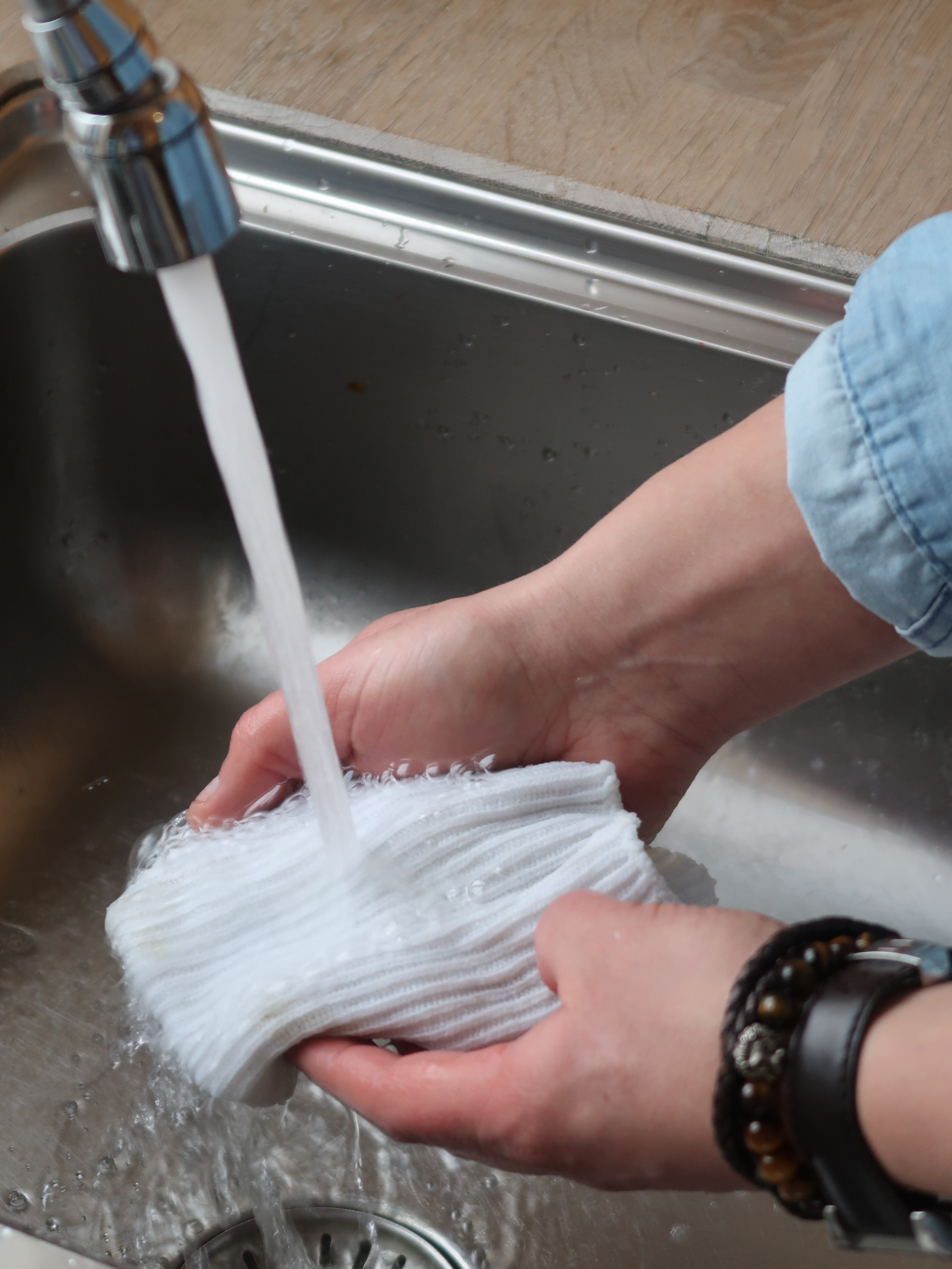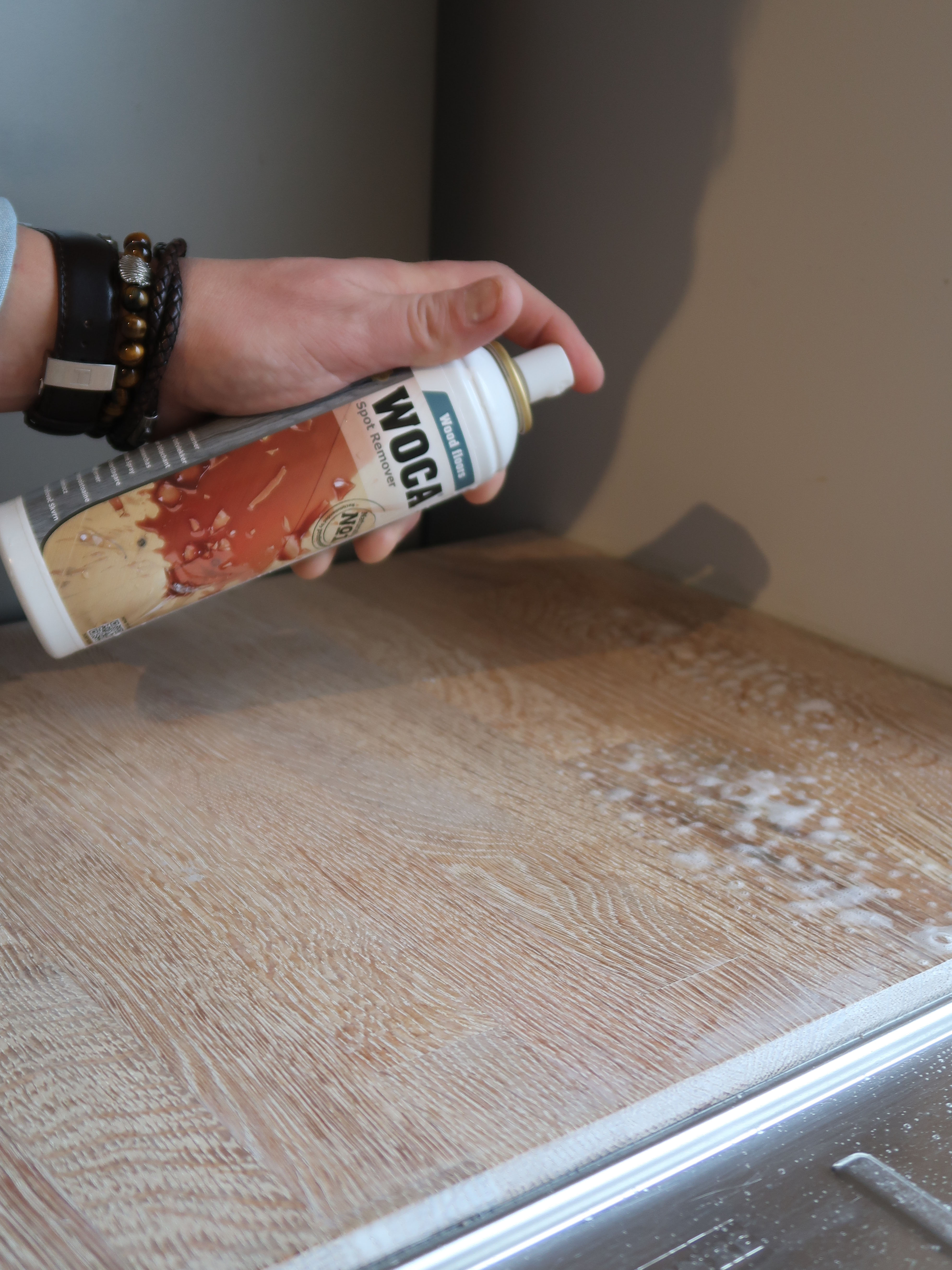 − Det ser du først etter at du har brukt en trerens. Se på kluten, sier han, og peker på en klut som en gang har vært hvit. Nå er den møkkete. – Et rensemiddel sørger også for at porene i treet åpner seg slik at oljen trekker dypere inn, sier han.
