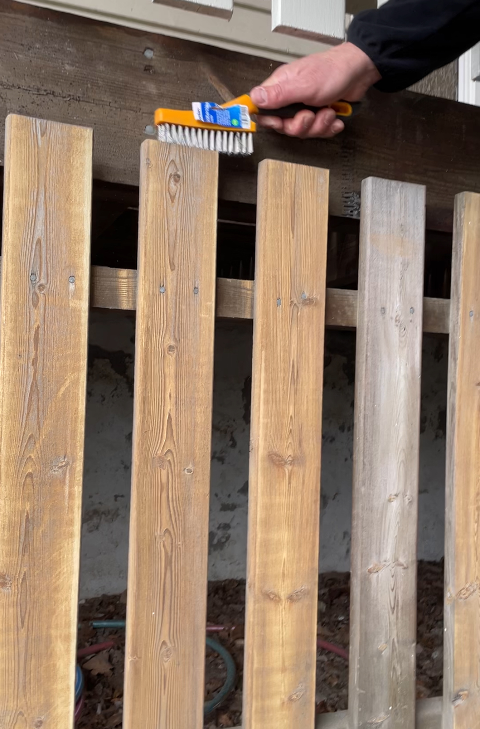 – Når overflaten er ferdig pusset, og du har tørket av støv med en mikrofiberklut kan du sette i gang å påføre beisen. Beisen som blir brukt her har en glansgrad på 15. Det vil gi et mattere utseende. Etter du har slipt helt ned til bart treverk vil treverket være sugende. Det er derfor viktig å få på nok beis. Stryk godt ut og mett endeveden, både under og over, i tillegg til kantene, sier Krogh.