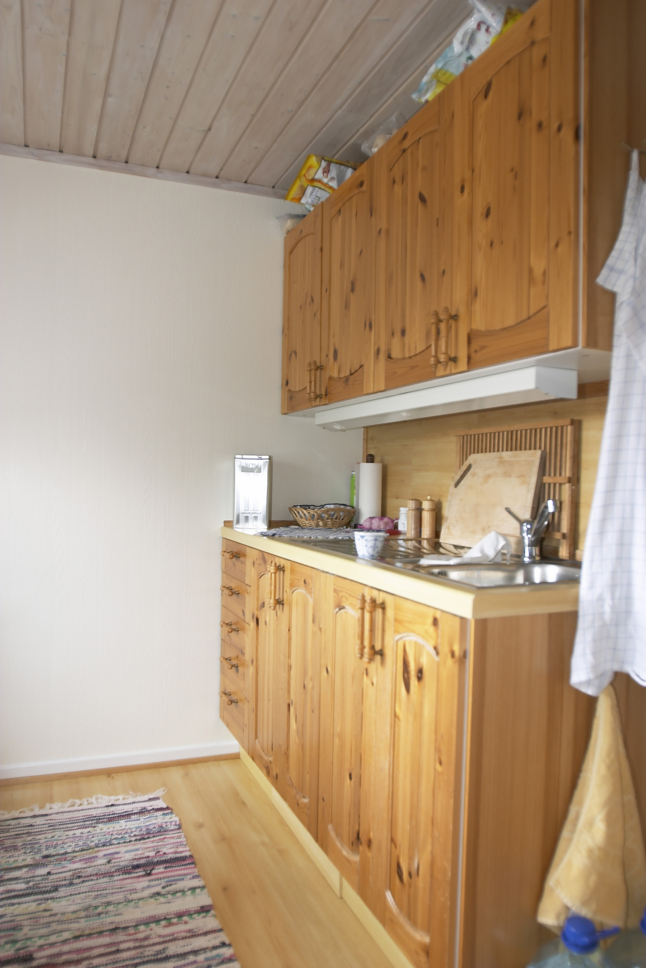 Solheim fant fort frem malerkosten. Hytta bar tydelig preg av sitt opphav. Det tidligere så populære møllerstuepanelet prydet de fleste veggene, og møblene bar preg av motene fra 70-tallet, med kraftige innslag av oransje og brunt. Både vegger, tak og gulv var trehvite, men etter mange år var panelet blir mørkt. Her måtte noe gjøres.
