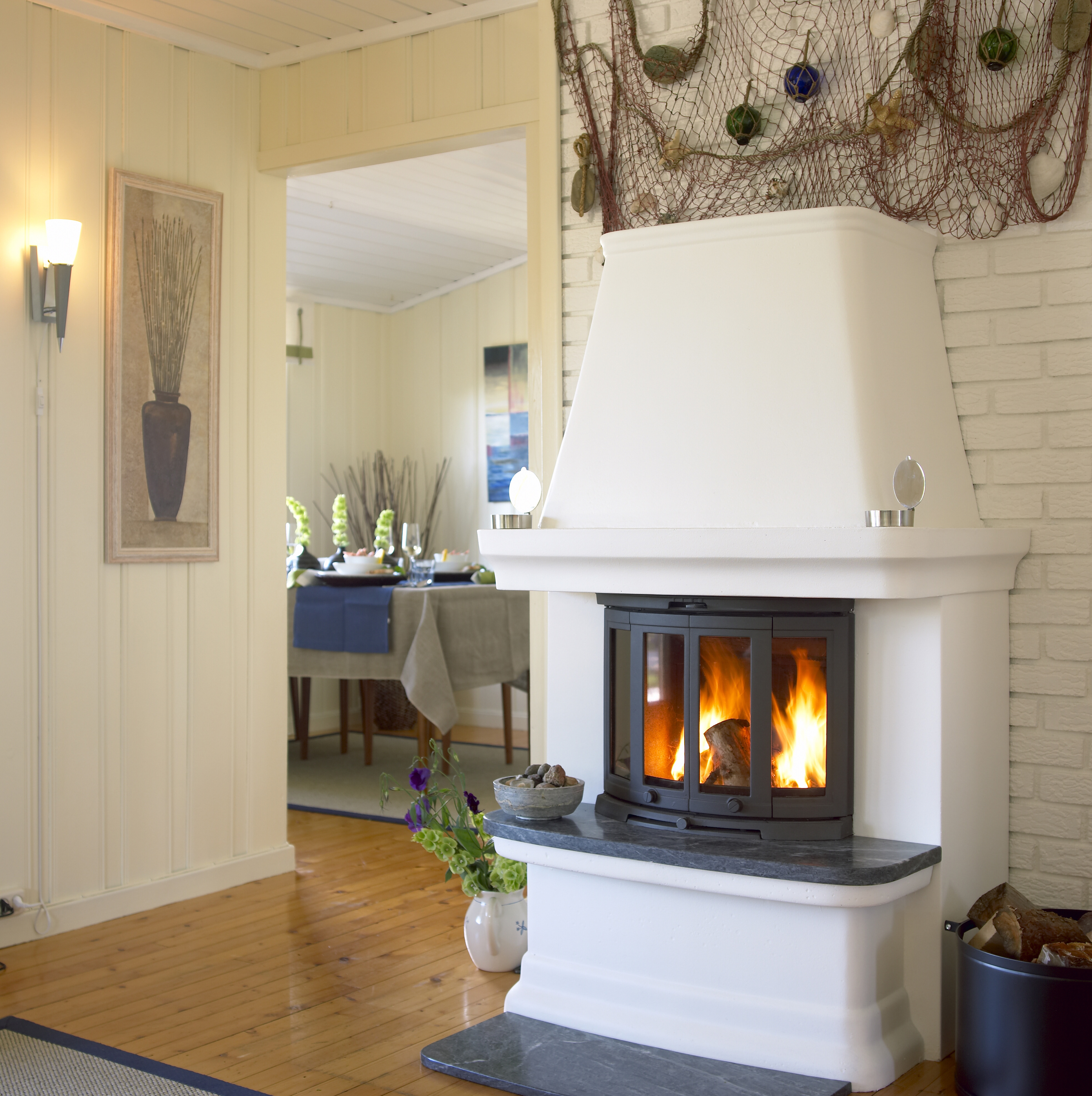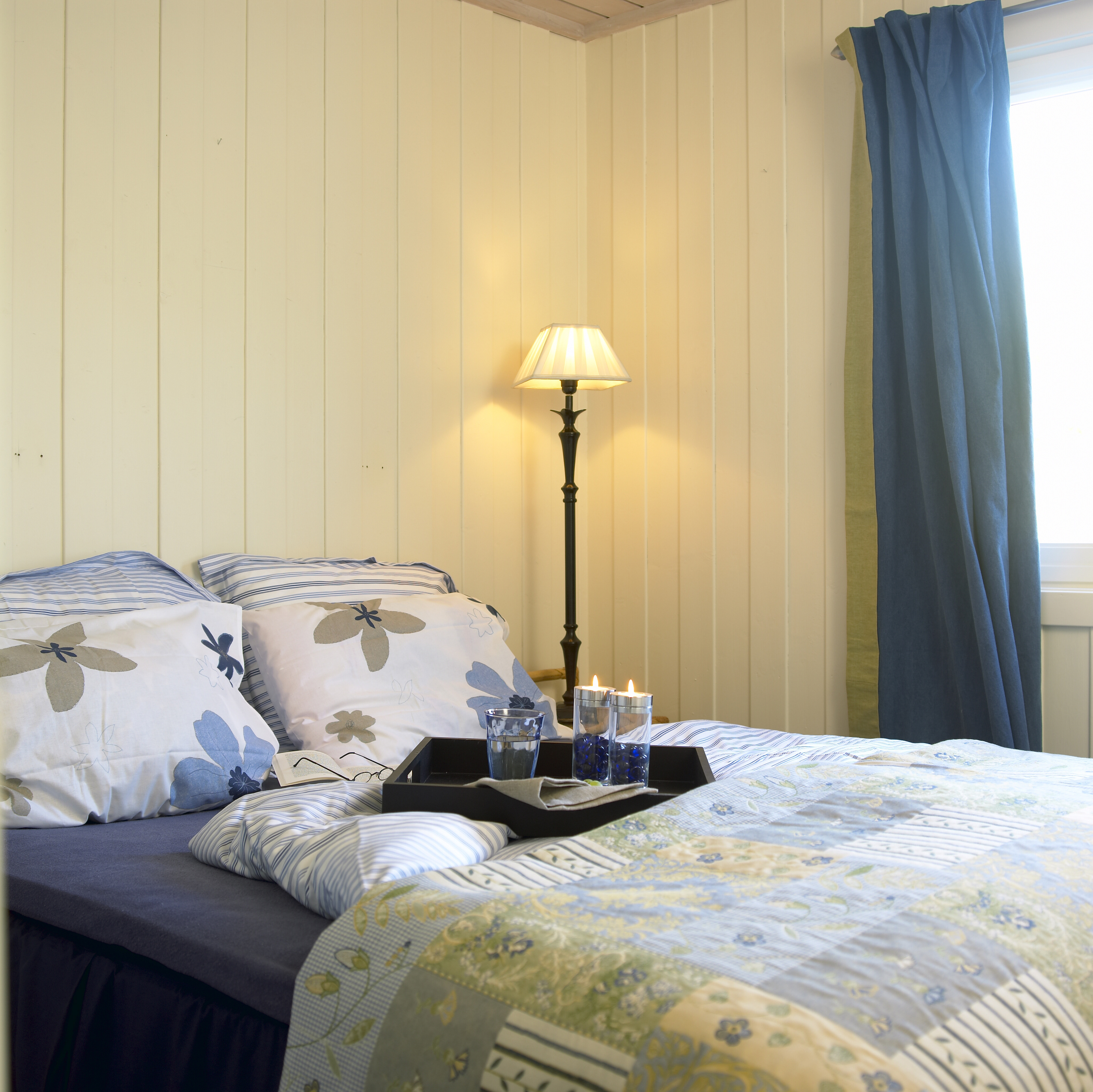 Når veggene er hvite, bør møbler, gardiner, bilder og gjenstander ha farger som bryter. For en hytte ved sjøen har det vært vanlig å velge marineblått hvis man vil ha litt maritim stemning. Mulighetene er flere enn folk flest vanligvis tenker over, mener Seberg.