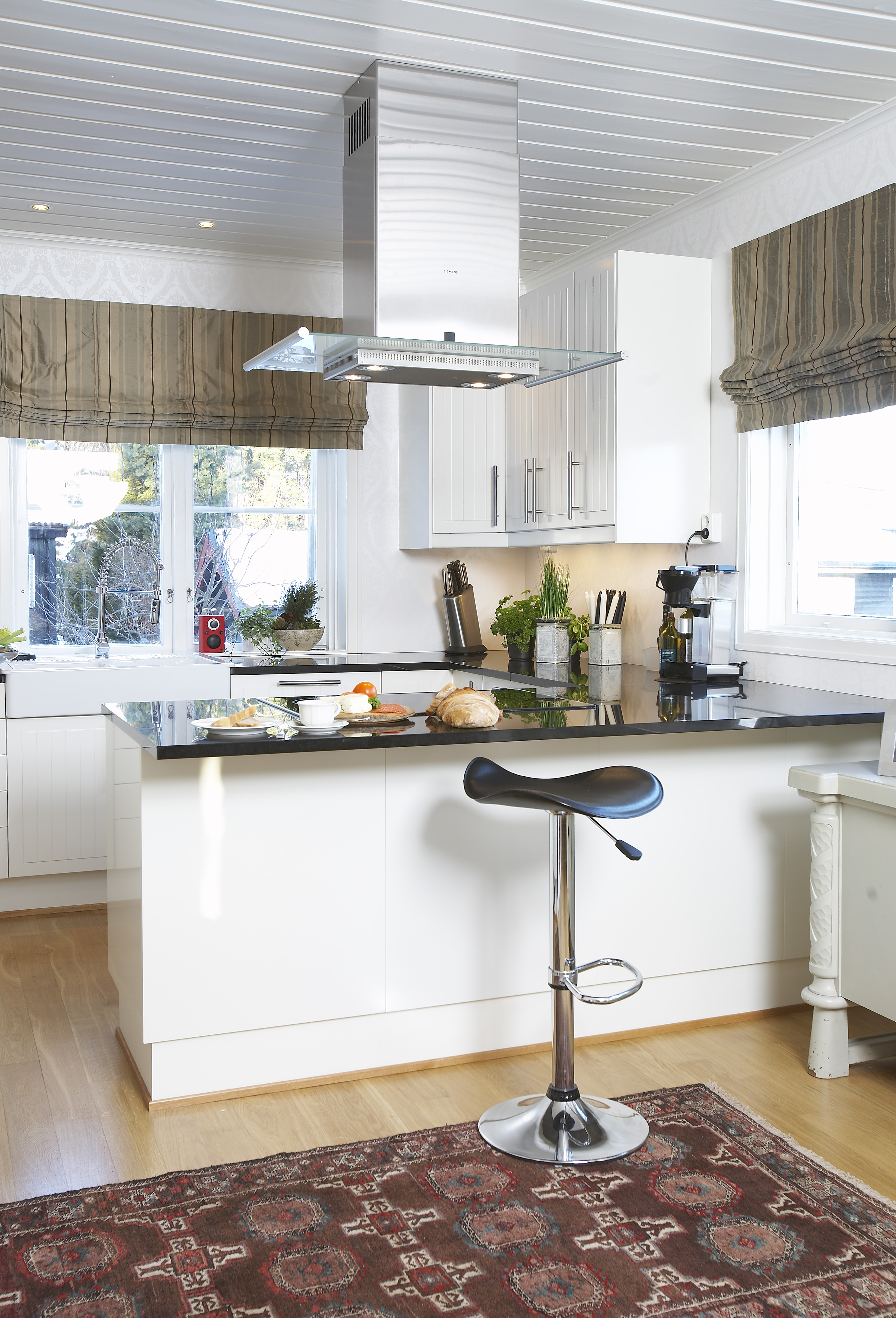 - For oss er kjøkkenet det viktigste rommet i hjemmet, så vi ønsket en løsning der vi ikke måtte stå med ryggen til gjestene når vi lager mat. Det skal være sosialt å kokkelere, og vi har allerede erfart at gjestene våre trives godt med å slå seg ned på barkrakkene ved kjøkkenbenken mens vi gjør ferdig middagen. Der kan de sitte med et glass vin, småprate og prøvesmake. Det er en god start på en hyggelig kveld, synes vertskapet.