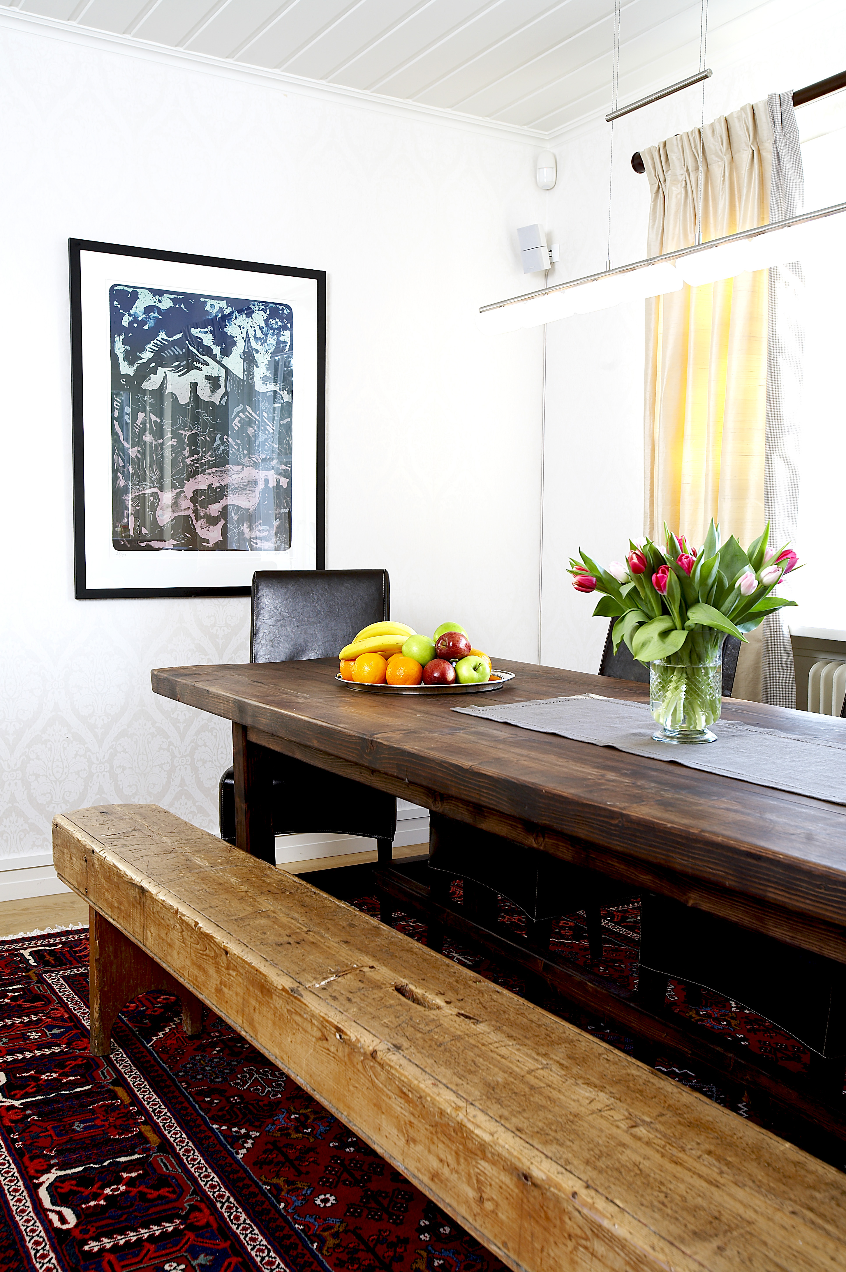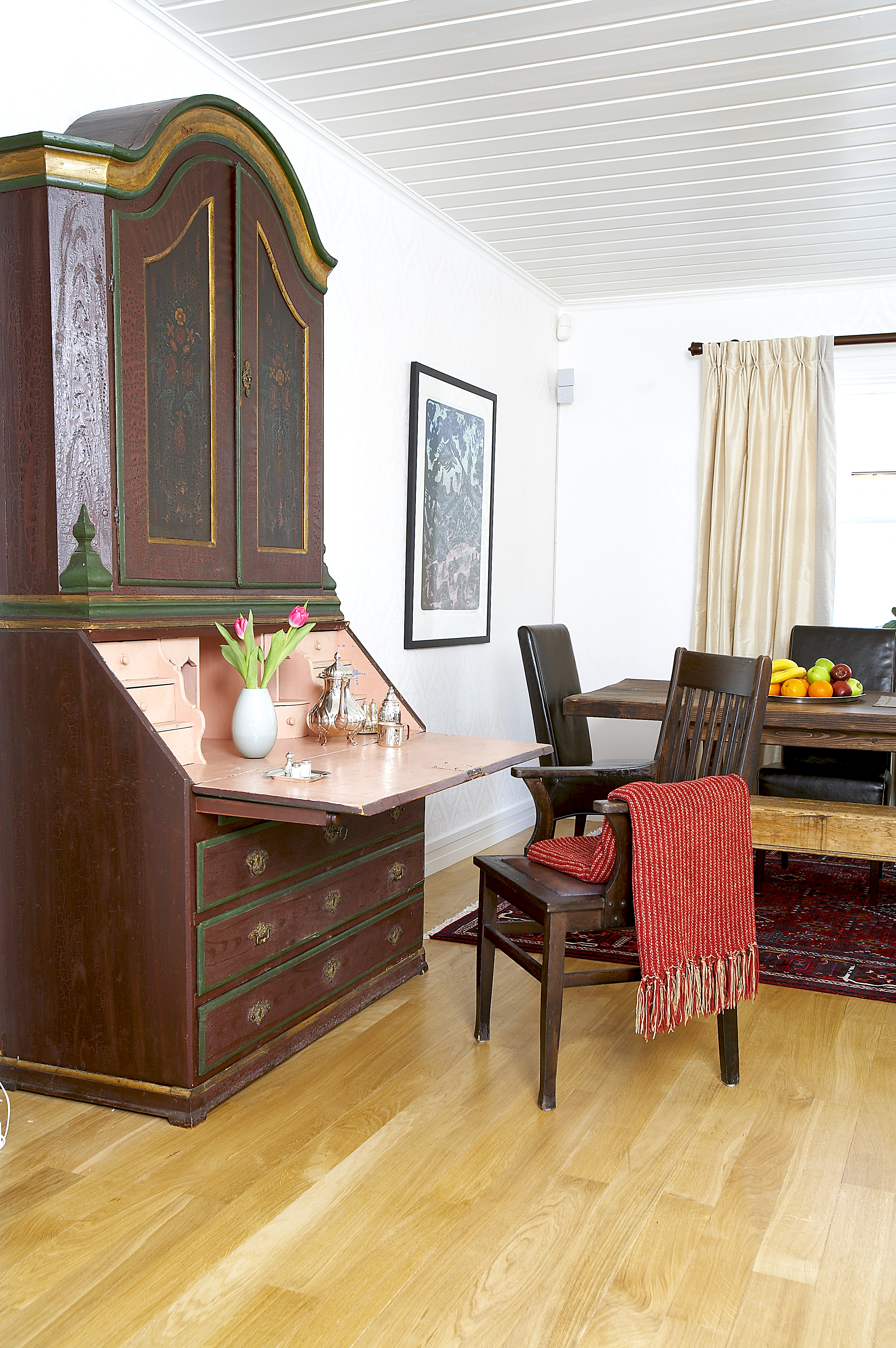 Et vakkert, gammelt framskap er plassert i overgangen mellom kjøkkenets arbeidsdel og spiseavdeling. Langbordet har verten tegnet selv, og stolene i mokkafarget skinn har komfort som tåler en laaaang middag.
