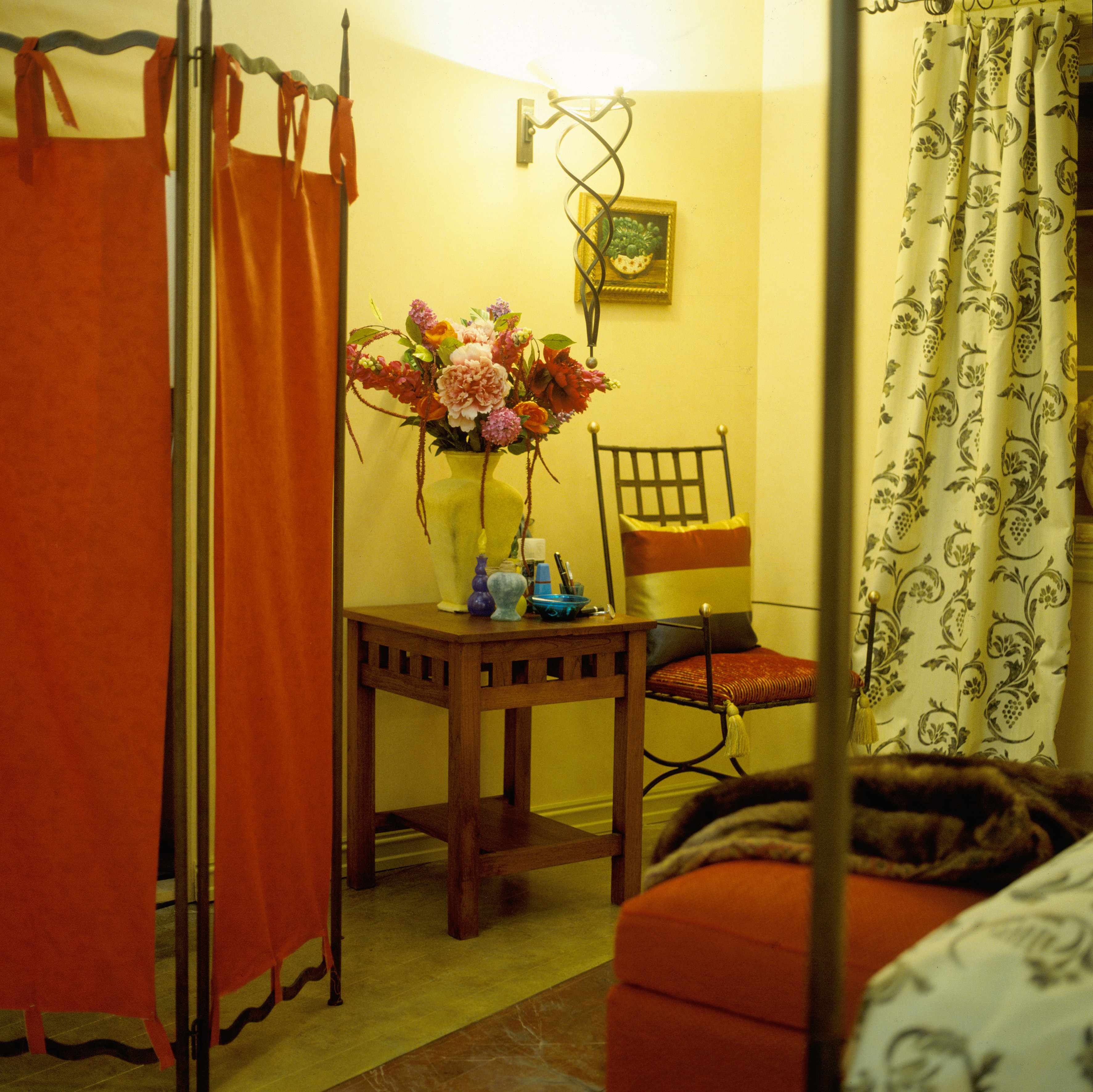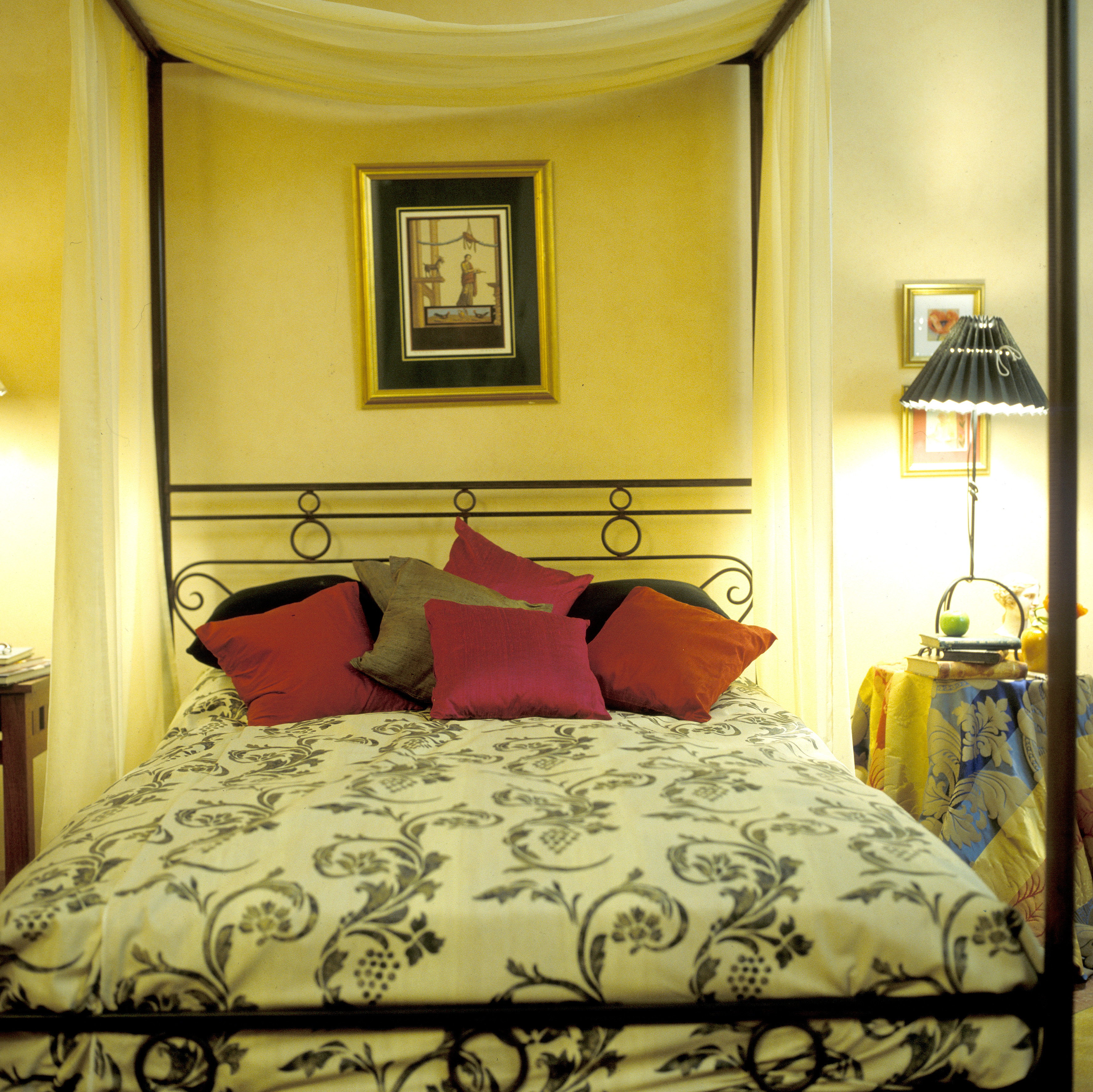 Det er ikke spart på noe for å gi dette soverommet en standsmessig og lun atmosfære. Gulvet er dekorert etter alle kunstens regler, oppdelt i et mønster og i gode varme farger. Her er det ikke behov for lunende tepper. Rikelig med tekstiler hører med, i klassiske mønstringer og gode kvaliteter. Veggene er tapetsert med en nesten ensfarget tapet som gir en sjattert og nyansert flate. Samme effekten kunne man oppnå med maling, men vil du gjøre det selv blir dette enklere. Også gardinen har noe av den samme bunnen, mens mønsteret er trykket med sort og litt gull. Vi har brukt samme tekstil til sengeteppet og gardiner. Det er en stødig og kraftig bomullskvalitet med god tyngde. Andre tekstiler i duk og puter er av skinnende silke og myk fløyel. Himmelsengen i støpejern finnes i flere bredder. For enden av sengen står en pall trukket med dyprød velur.