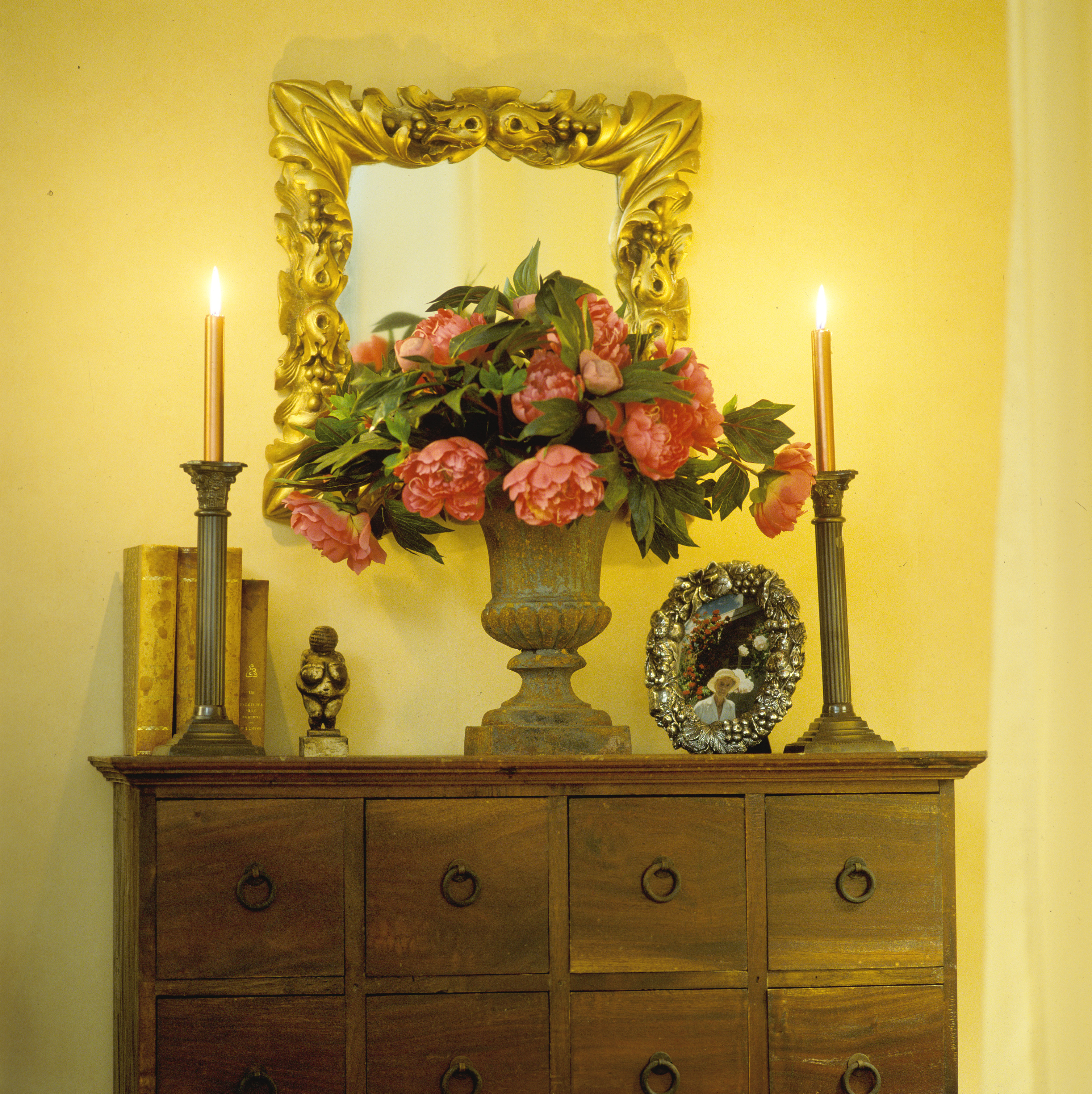 Fete gullrammer og frodige blomsterbuketter skal det være. Klassiske lysestaker i bronse og jernurne er helt i stilen. Mahognykommoden er av det rustikke slaget som vi importerer fra østen.