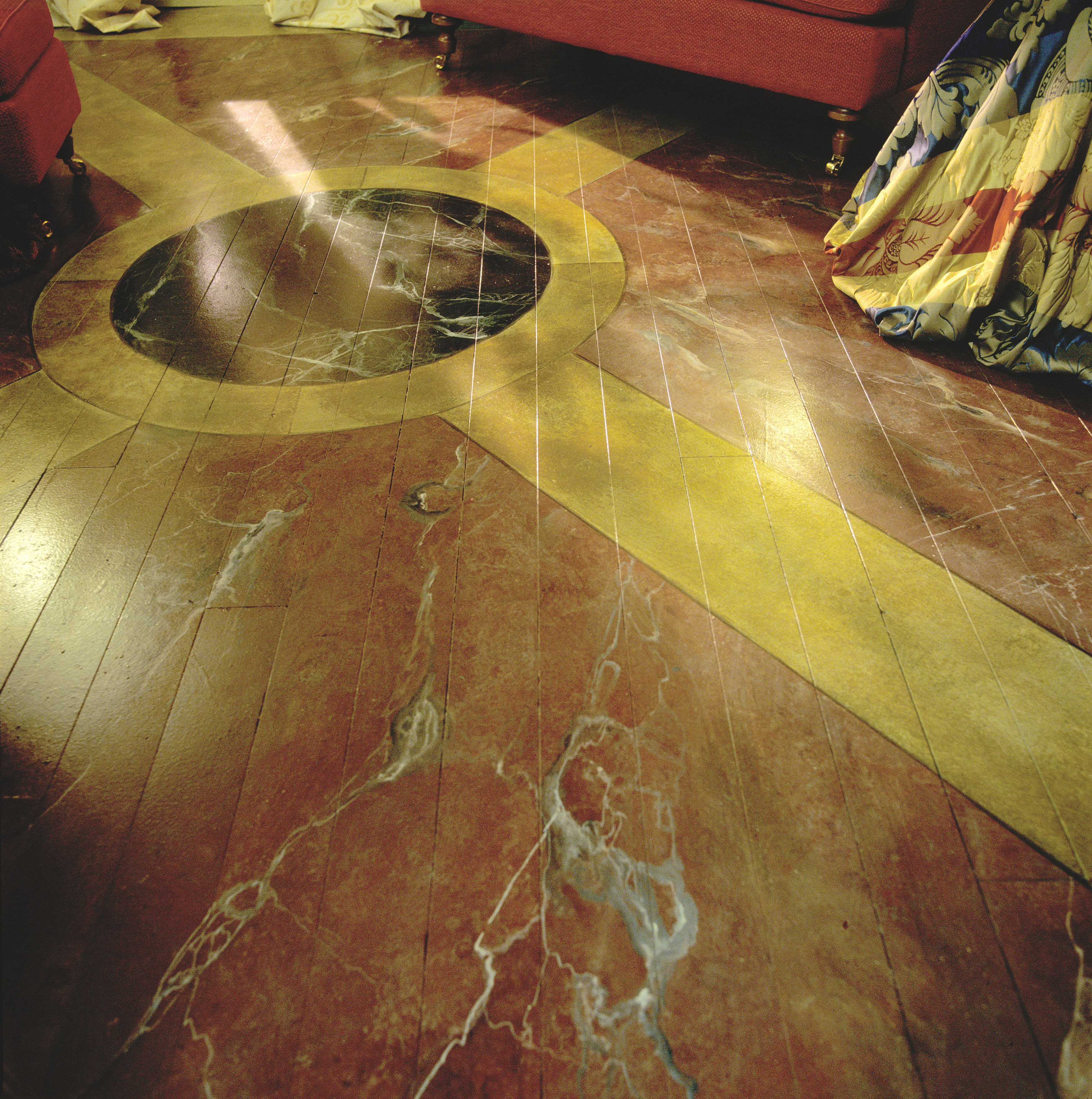 Dekorerte tregulv er populært. Dette er helt spesielt - patinert, marmorert og dekorert i flotte felter. Det er dekorert av en malermester - ikke noe for nybegynnere, altså.