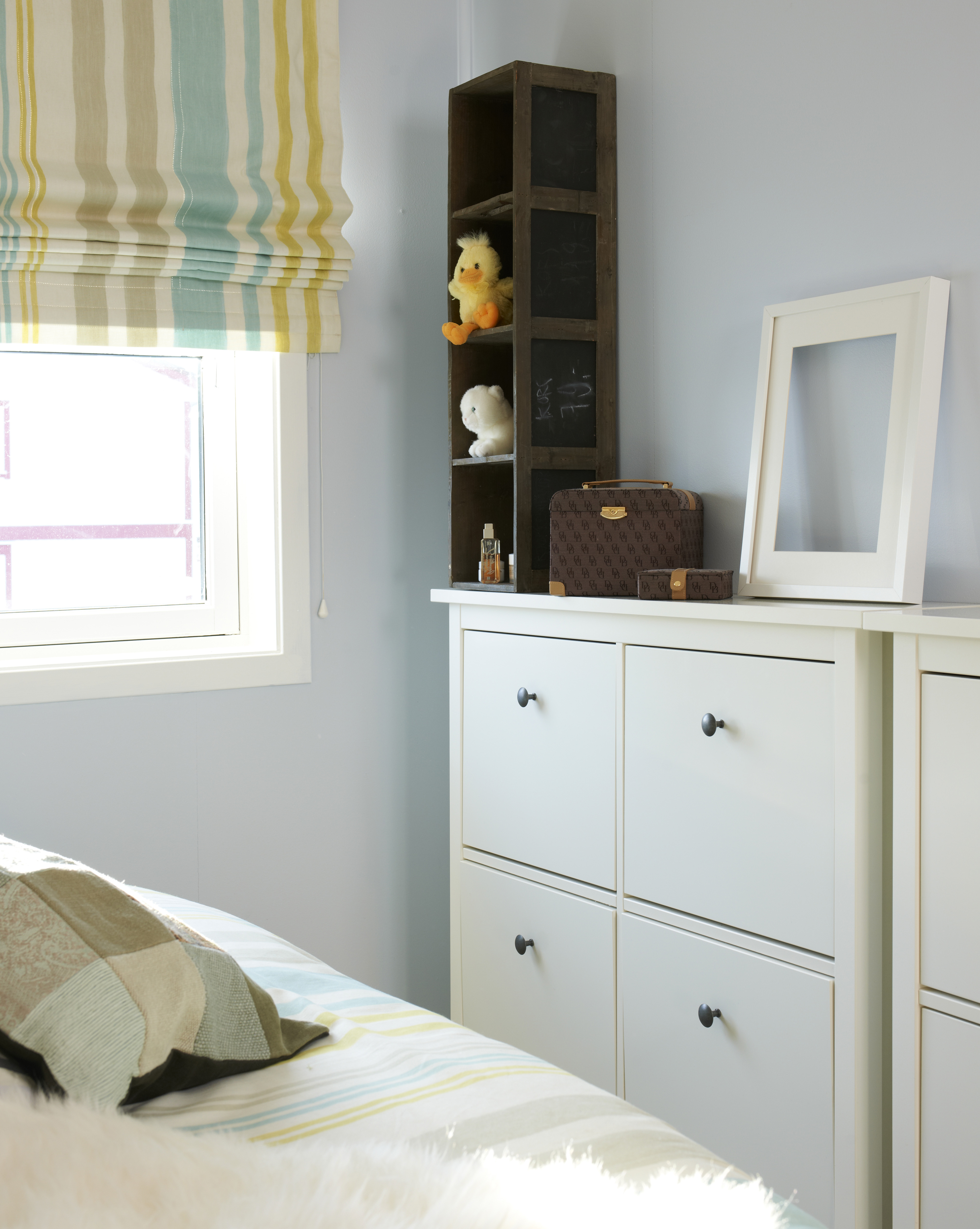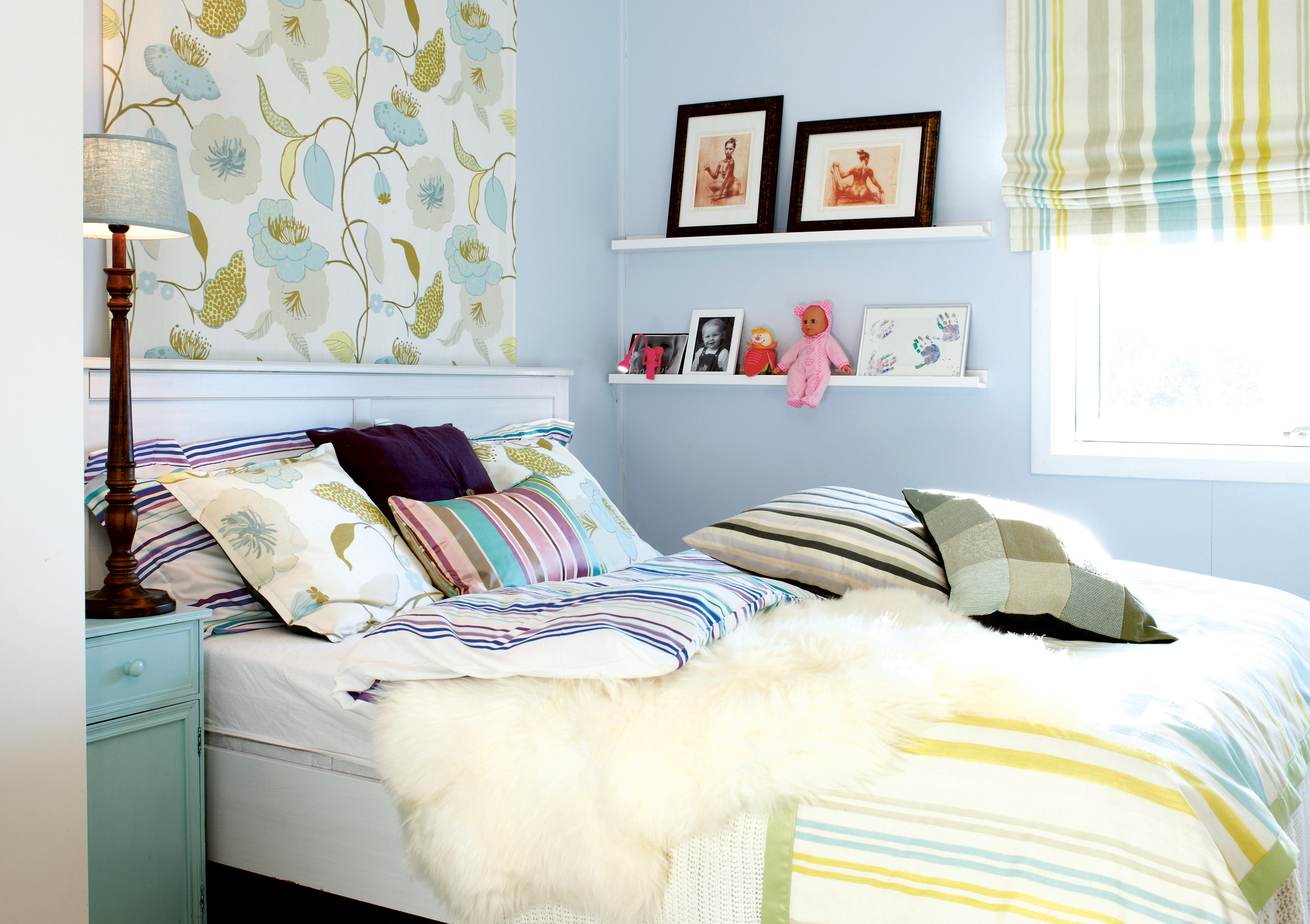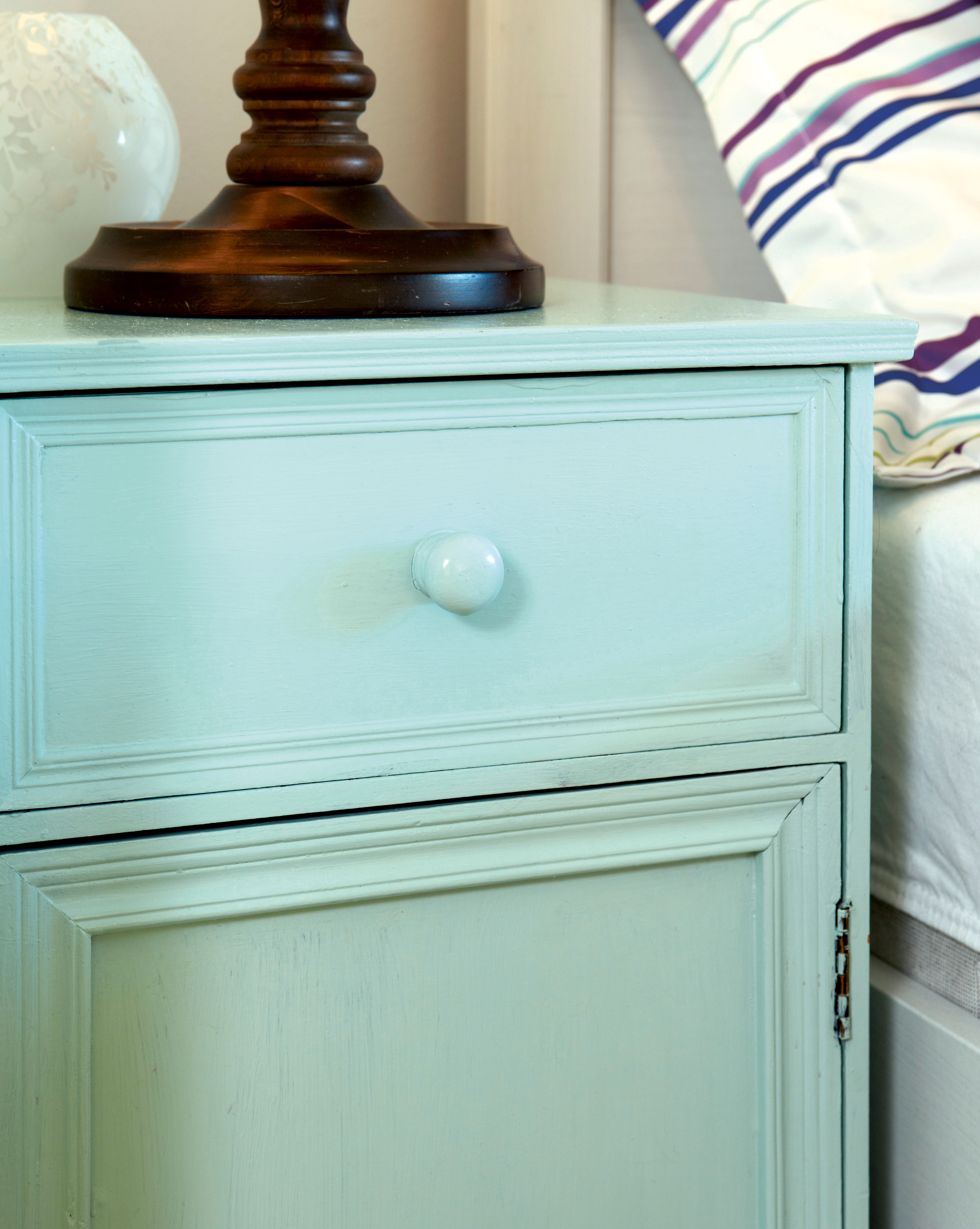 Et gammelt nattbord fra brukthandelen fikk nytt liv med maling. Fargen ble plukket ut fra det ene tekstilet.