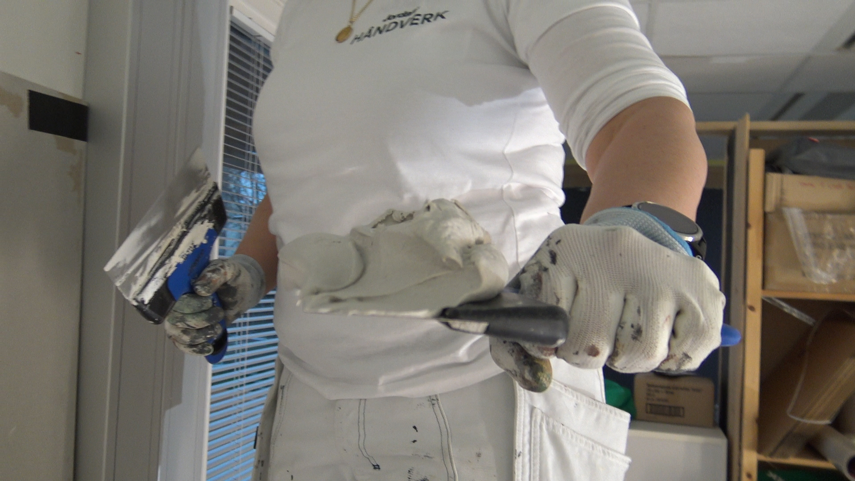 – Prøv og hold den sparkelspaden du oppbevarer sparkelmassen på så vannrett som mulig slik sparkelen ikke detter av, sier Schaanning.