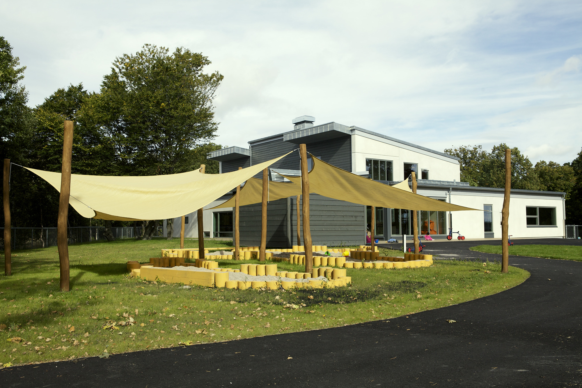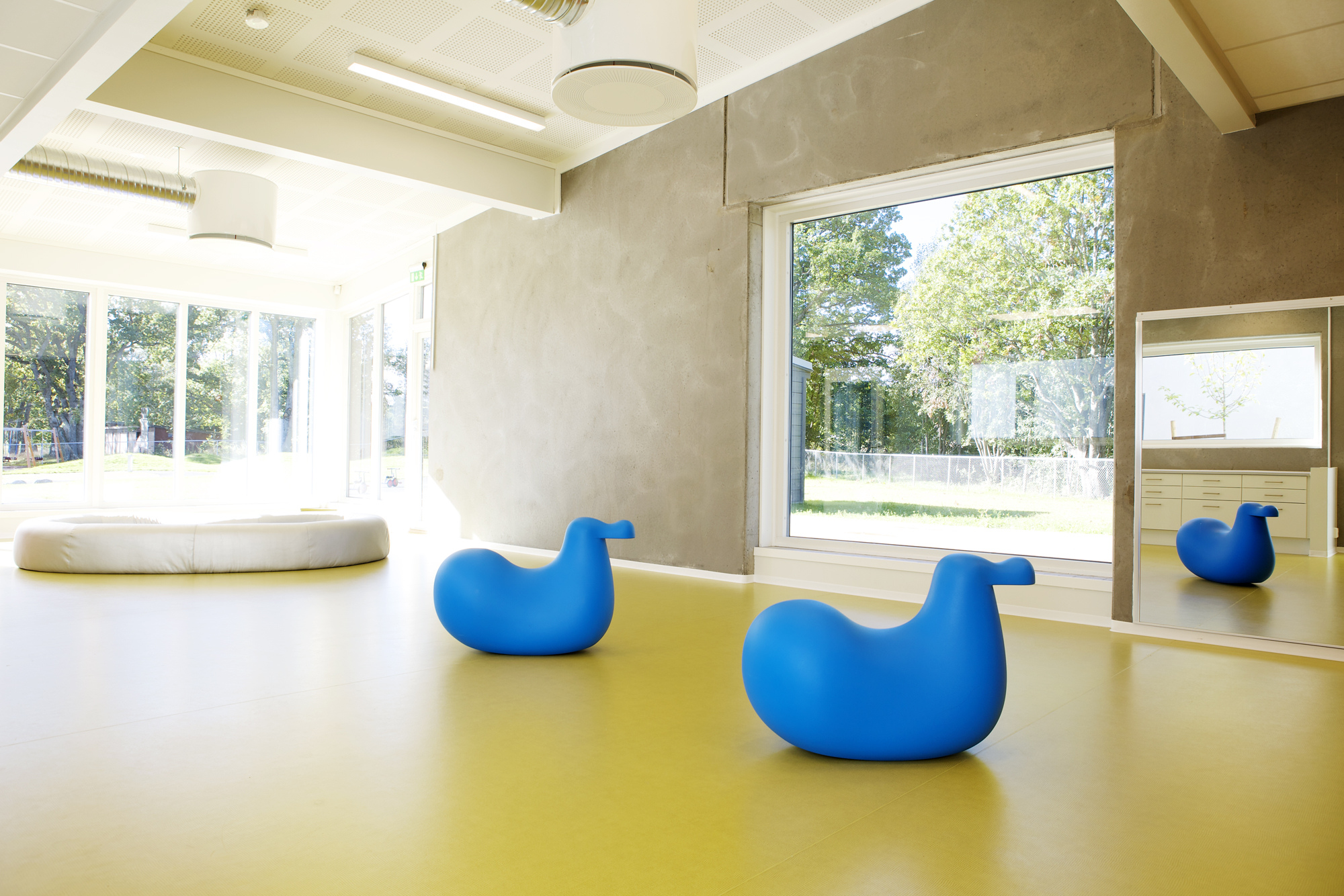 Barnehagen er innredet med inspirasjon fra elementene jord, ild og vann. Fargene rødt, gult, oransje, sort, grønt og blått lyser opp rommene.