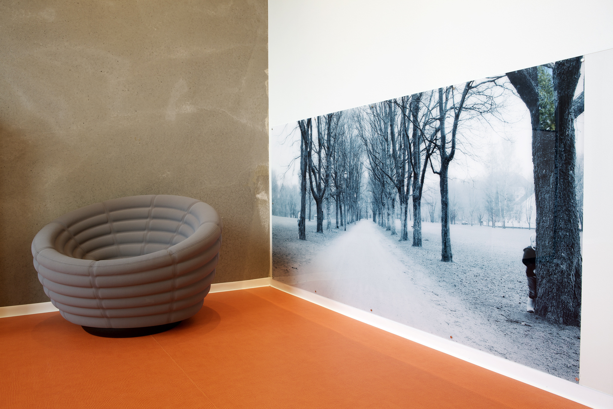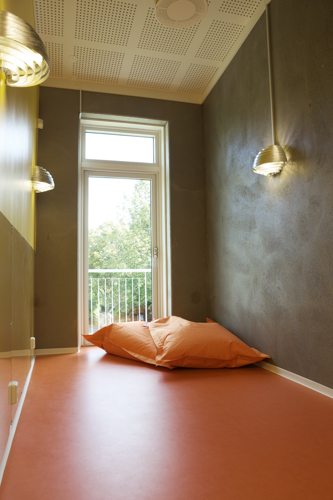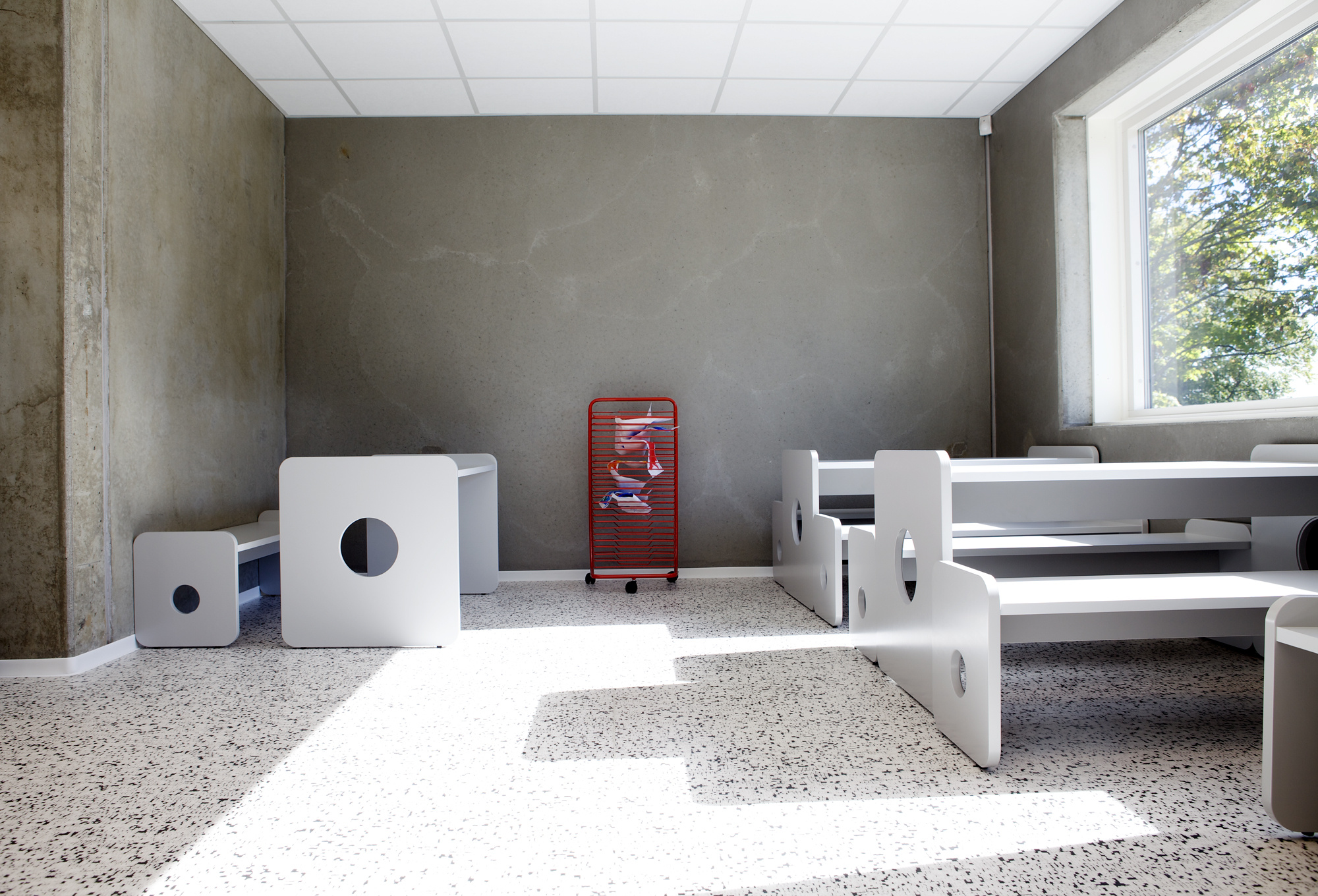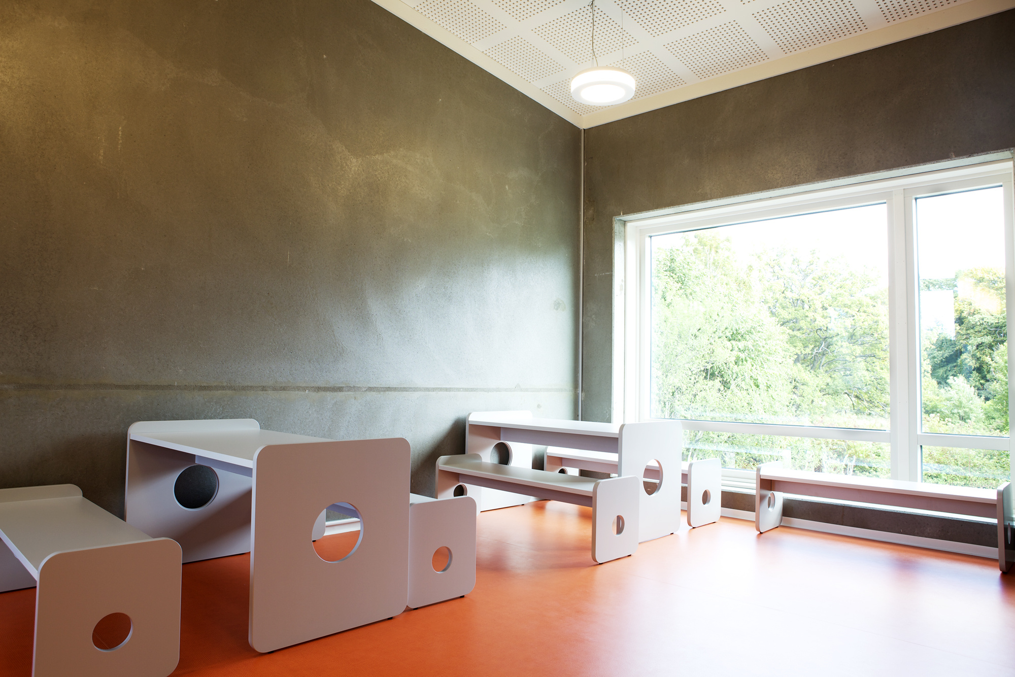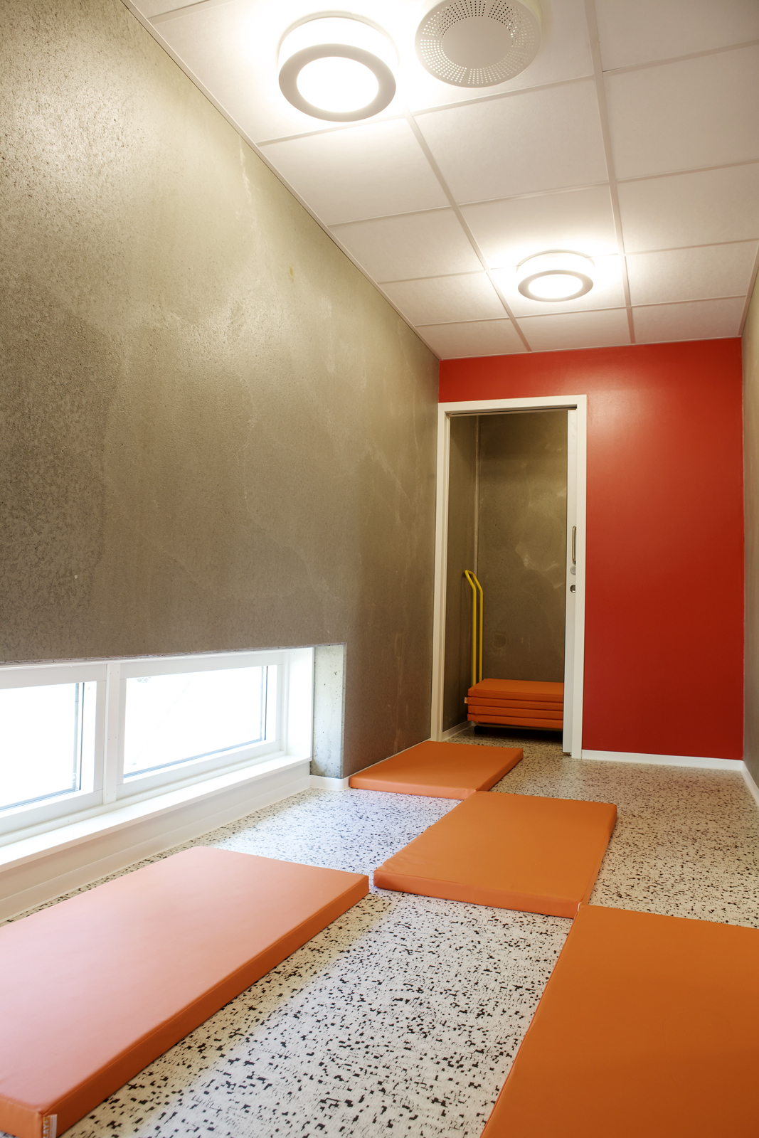 Flere av veggflatene består av umalt betong, andre er gitt de samme spreke fargene. På gulvene ligger slitesterke heterogene vinylbelegg fra Gerflor, i den samme fargeskalaen.