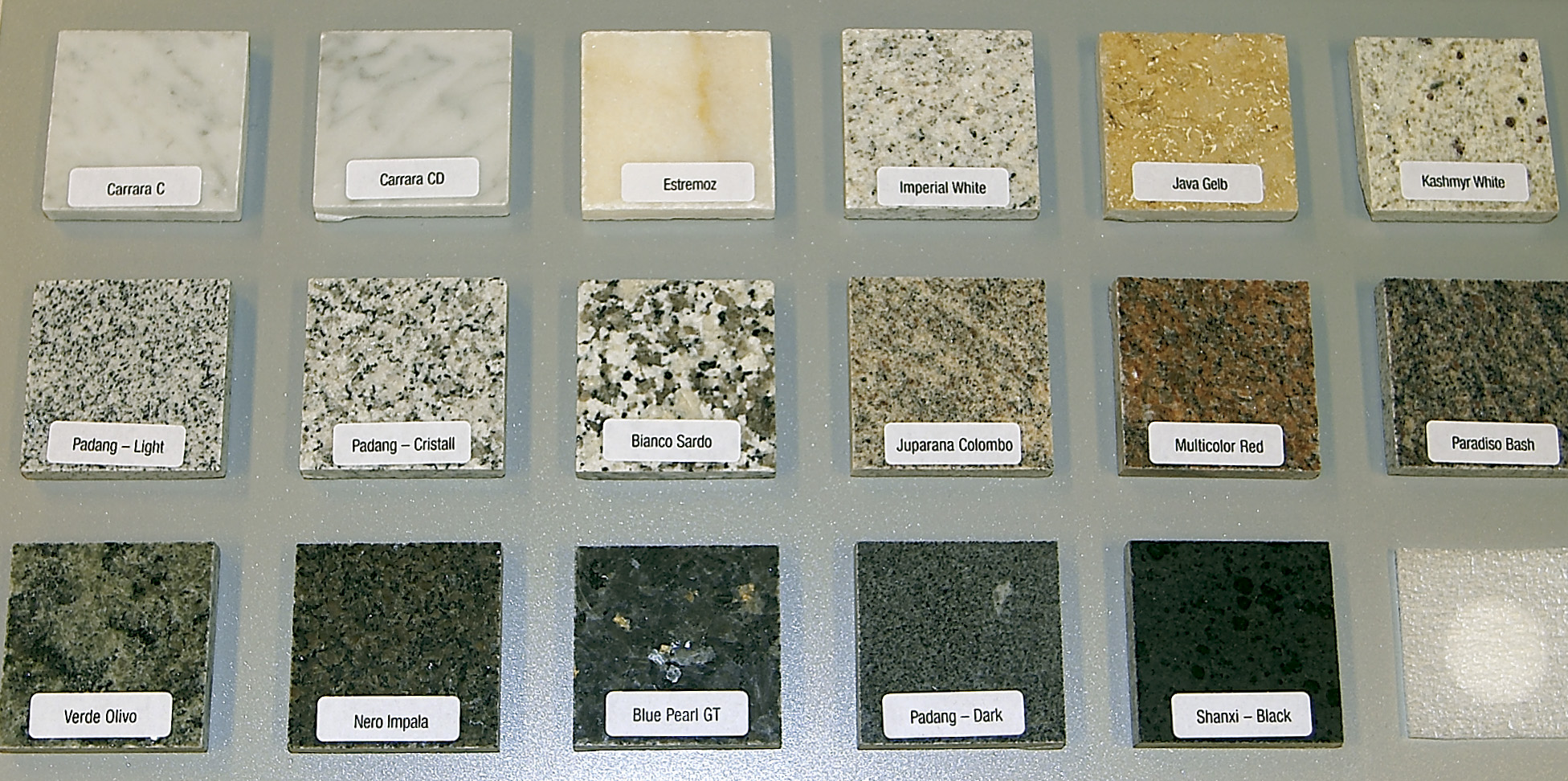 Nyheten kommer i mange typer stein - fra Italia, India, China og Larvik (larvikitt) - i forskjellige overflater: polert, pusset, sandblåst, brent, antikk. De leveres i følgende størrelser: 60 x 60 cm, 60 x 30, 50 x 50 og 40 x 40 cm. Tykkelsen på steinflisene er 2 cm. Sammenføyningsprofilene/fugene leveres i tre farger, bruk avhengig av steintype.