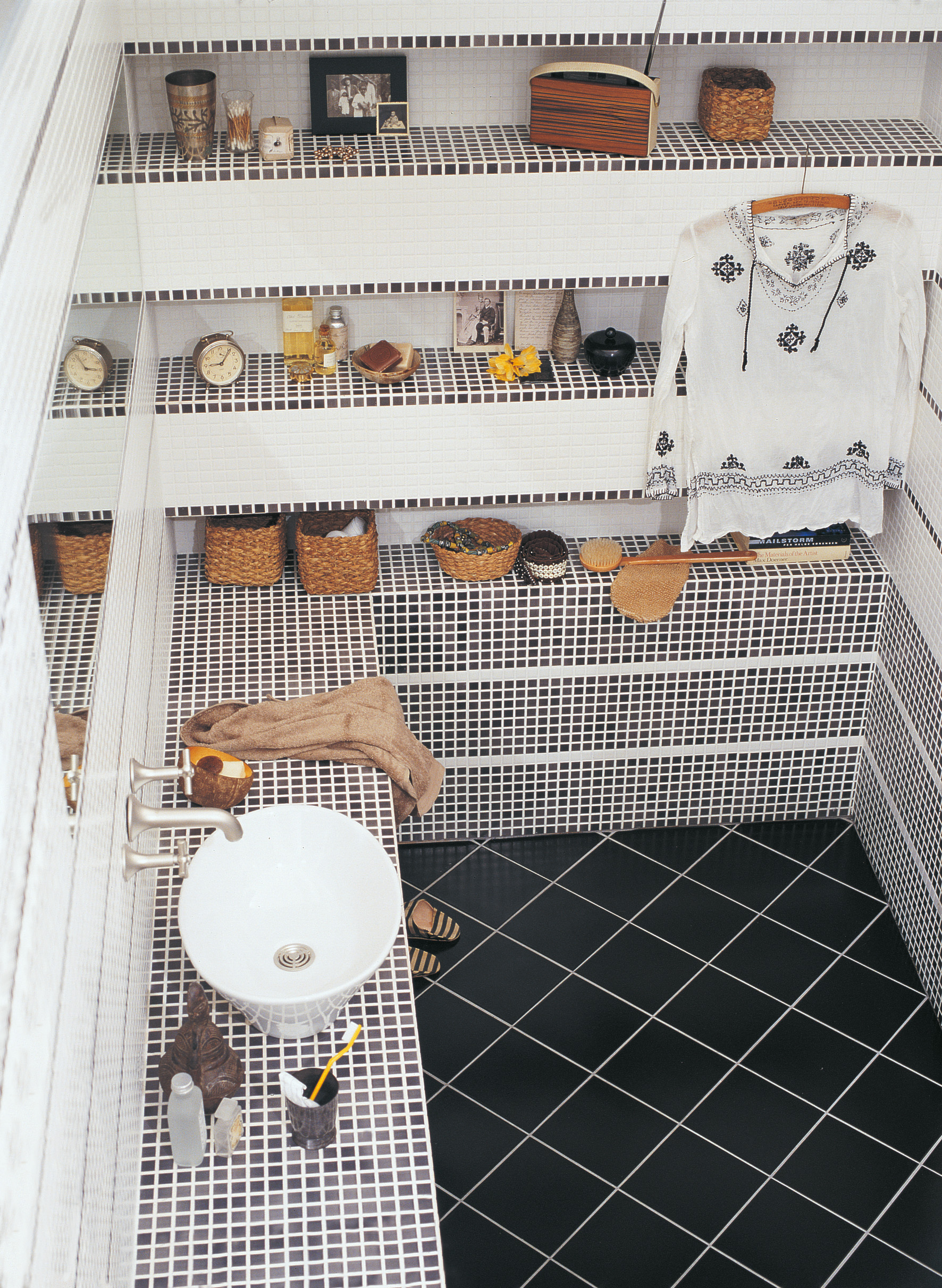 Ønsker man å fastholde det enkle og mer maskuline uttrykk, kan man rolig la mosaikken tale sitt eget språk. Flisene er bygget opp slik at mosaikken sjatterer i lyse og mørkere toner, noe som pirrer øyet og skaper dynamikk i rommet. Fargepaletten strekker seg fra antrasittsvart over til grått, sand og eggegul til elfenbensvit, krydret med lys blå, fersken og oransje.