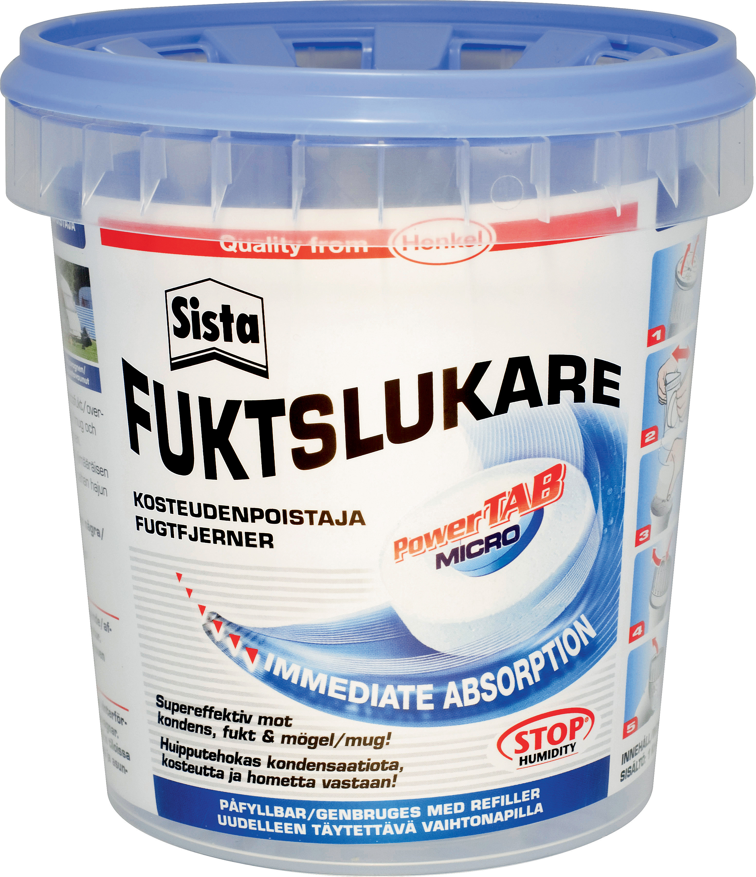 Henkels fuktsluker er et eksempel på et effektivt middel mot kondens, fukt og vond lukt. Resultatet av fuktslukeren merkes innen få timer. Fuktslukeren passer i alle typer rom der det er fuktig, som for eksempel våtrom, garasjer, hytter, campingvogner og båter. En lettvint refilltablett puttes i boksen når den har gått tom. Den virker med en gang og varer i 2-3 måneder, litt avhengig av fuktighetsgrad og temperatur.