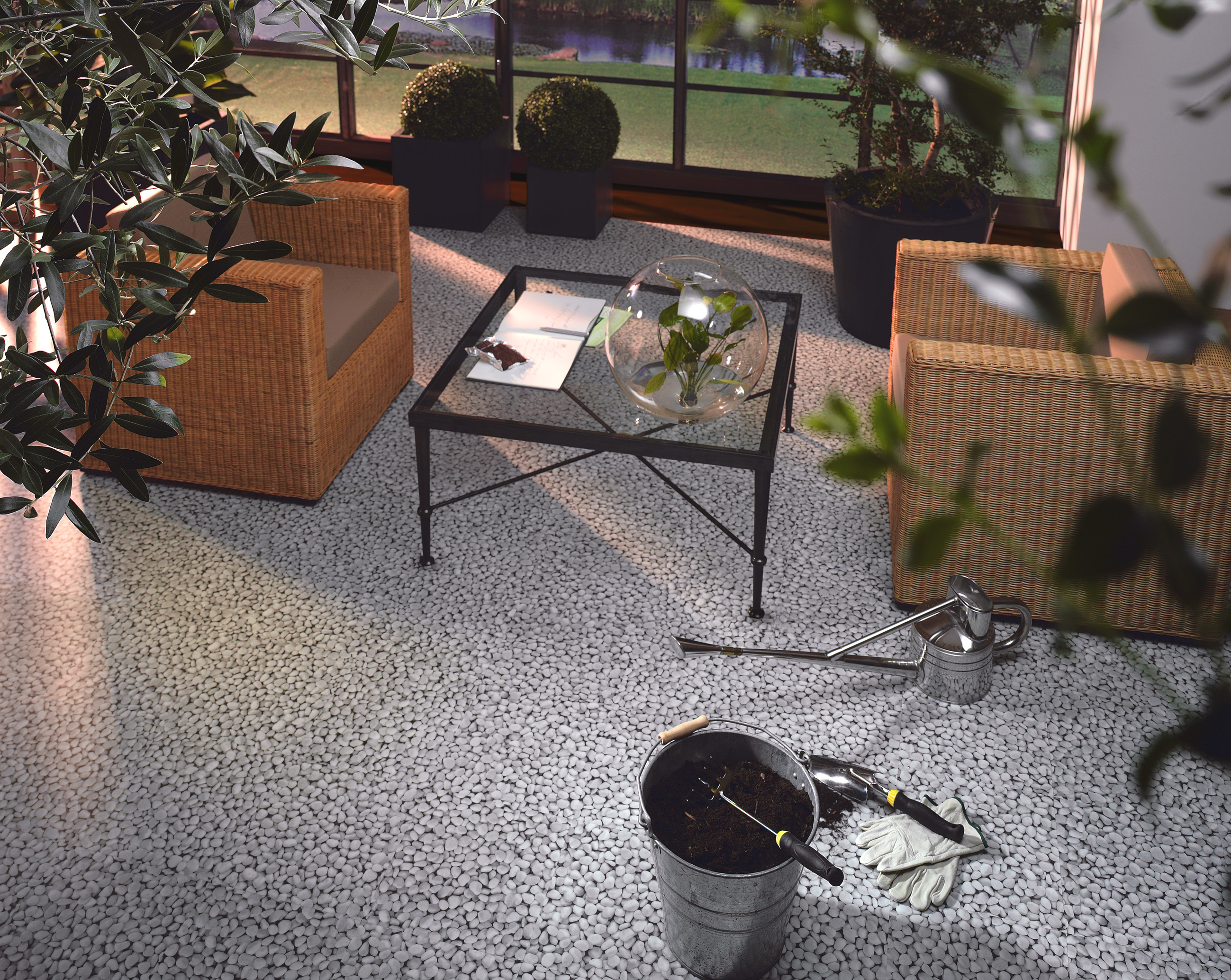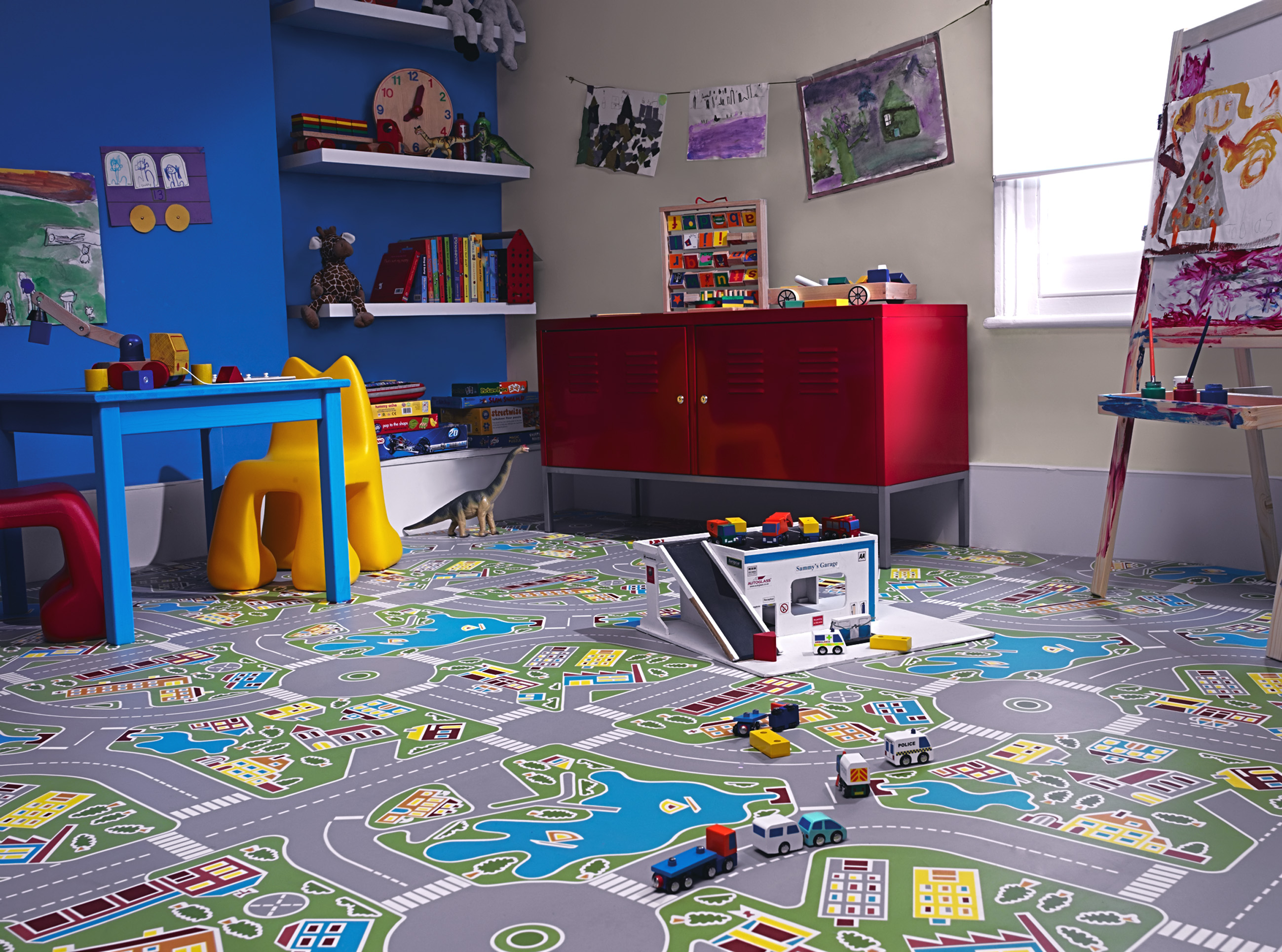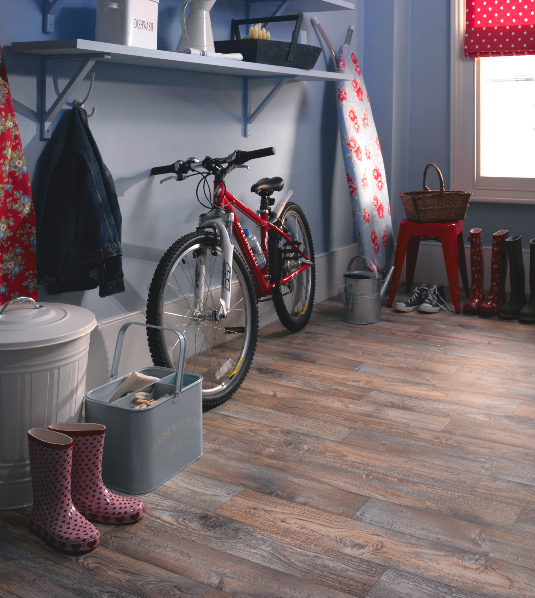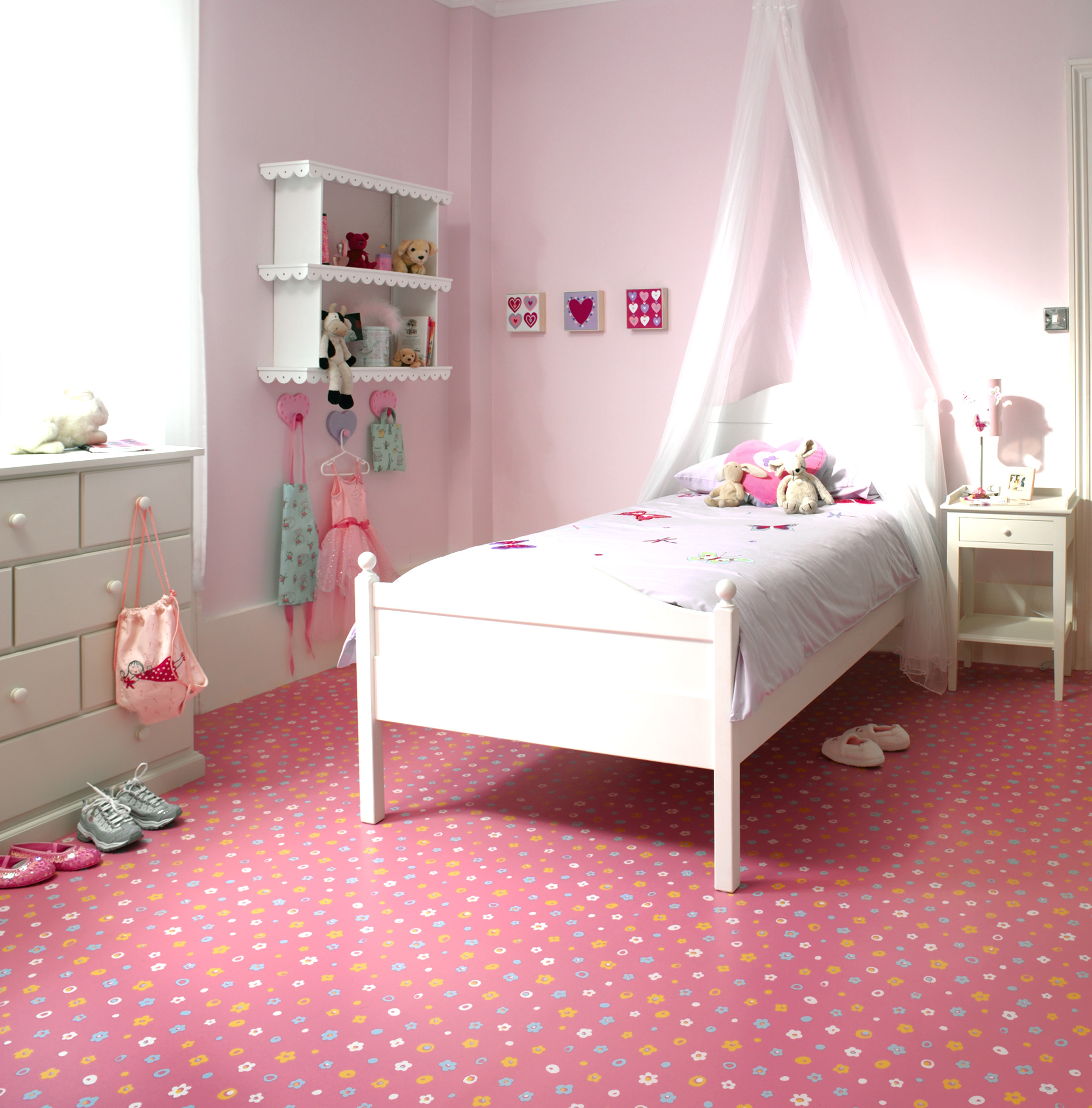 Hva billedserien her forteller er at man bør mønsterlegge gulvet etter hva rom brukes til for å gi det den rette karakter - et barnerom med vekt på rosa, et kjøkken med matt flismønster, et japan-skinspirert soverom og biblioteket med eksotisk tremønster.