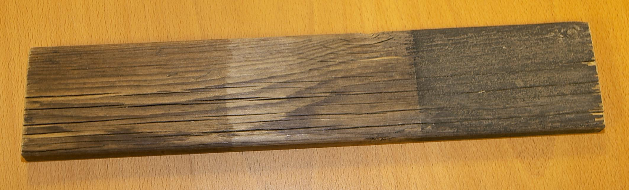 På bildet, i feltet til høyre, ser vi et eksempel på et stykke terrassetre som har fått et veldig dårlig utseende. I midten ser vi treverket etter at det er behandlet med terrassevask og i feltet til venstre når det er ferdig oljet. Dette er en sikker systembehandling man gjerne kan foreta årlig.