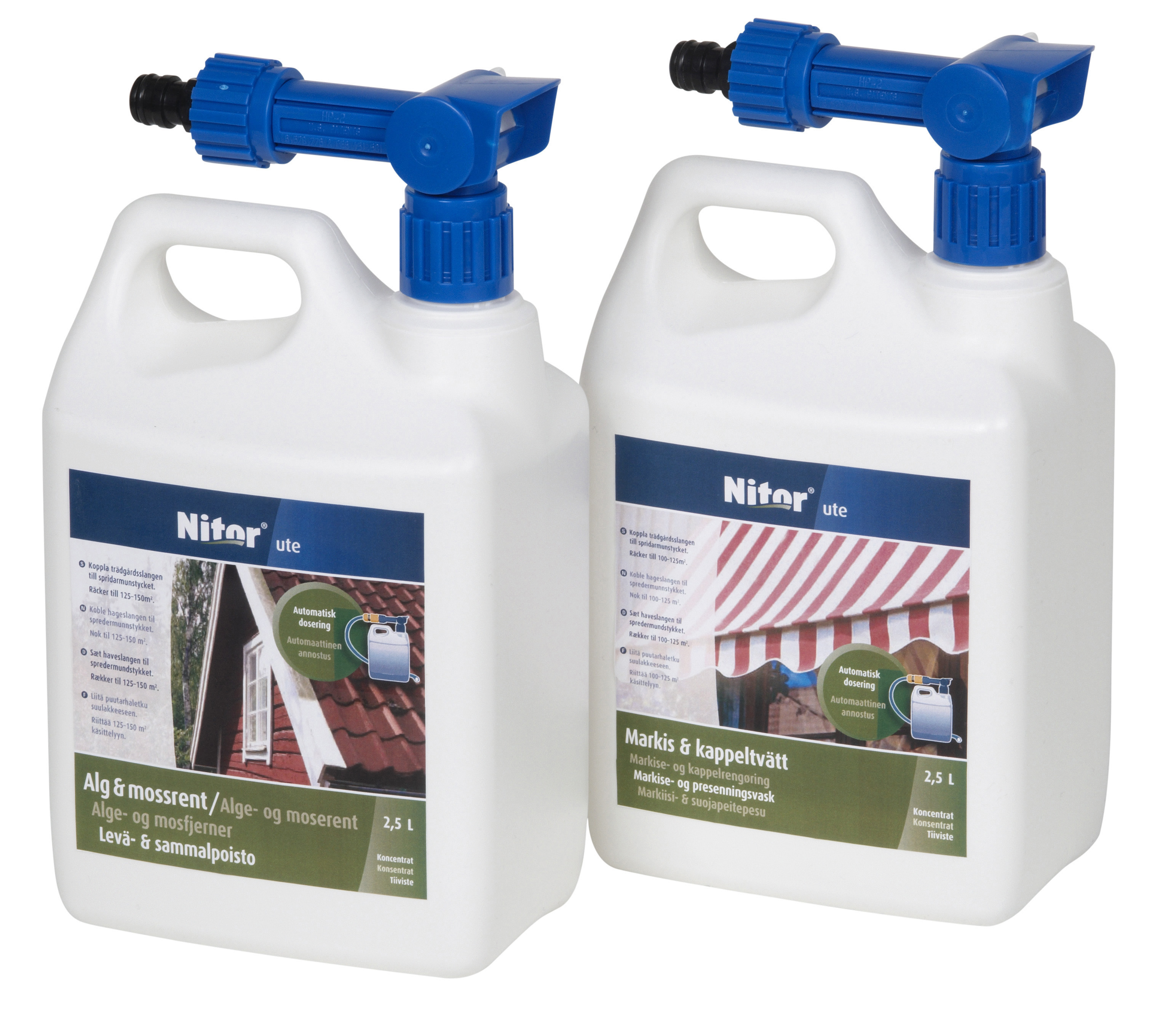 Når det er store arealer og ulike overflater som sårt trenger rengjøring, tenk praktisk: produkter med flere bruksområder og store kvanta. Så lenge en slipper å slepe rundt og fylle vannbøtter, går jobben både lettere og raskere. En av vårens nyheter er produkter med doseringsmunnstykke som en kan koble rett på hageslangen. Nitor Alge & moserent og Nitor Markise & kapellrengjøring kommer i 2,5 liters konsentrat hvor doseringen skjer automatisk via den tilkoblede hageslangen. Riktig dosering er et viktig argument for lommeboka, men også for miljøet som blir spart for unødvendig påkjenning/belastning/forurensing.