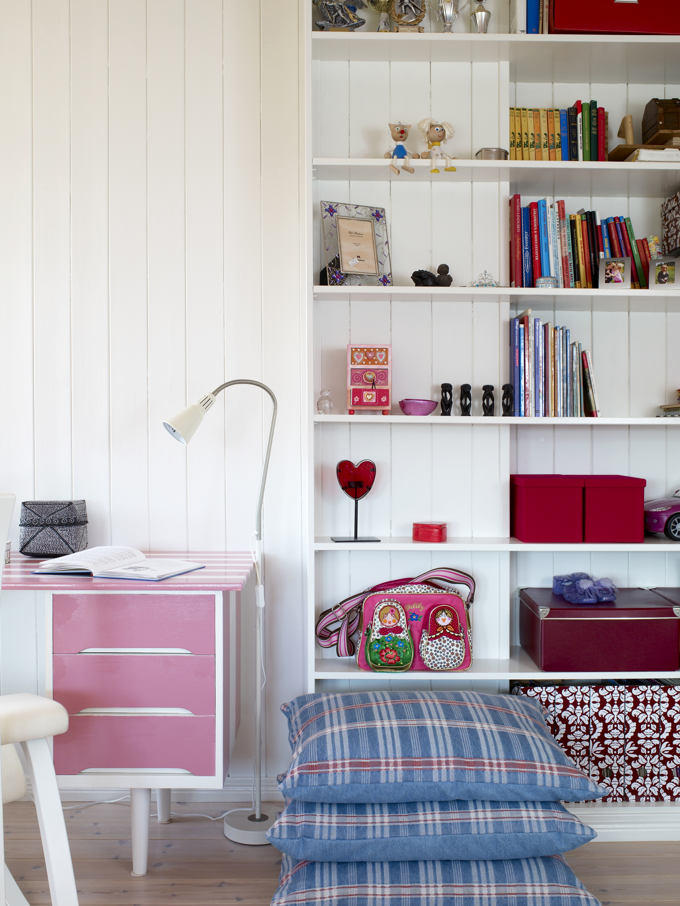 Med nøytrale, lyse vegger kunne de jo endre rommene sine om noen år ved å skifte ut tekstiler og møbler. Men selvsagt skulle jentene få både turkis og rosa i sine nye rom. Det ble løst ved å male møbler og sy puter og sengetepper i disse fargene. En rosa saccosekk og en seng med rosamønstrete tekstiler ga rommet den fargesettingen som Anna ønsket. To gamle stoler fra bestefar fikk loose-cover; den ene i hvitt, den andre i dongeri.