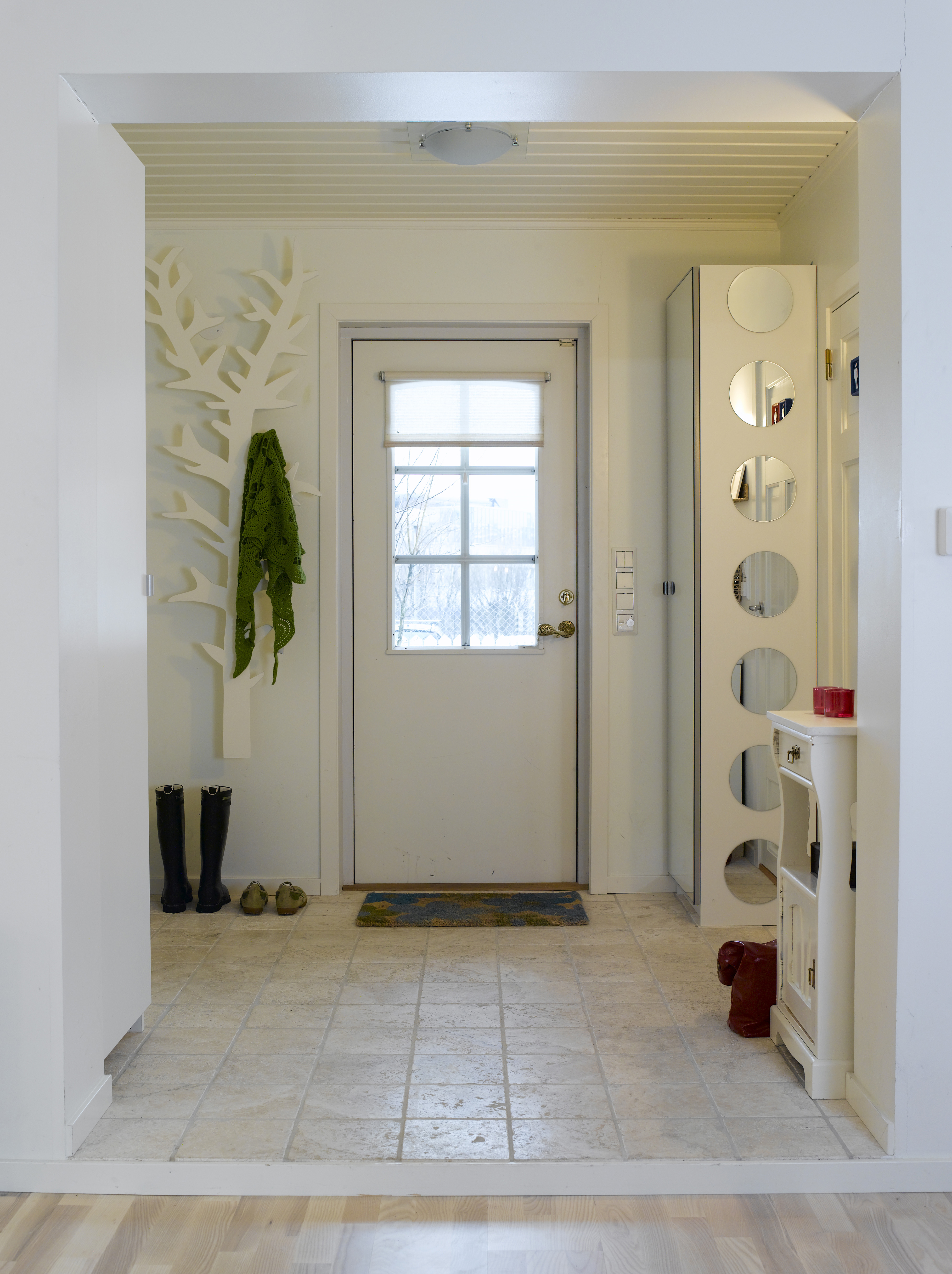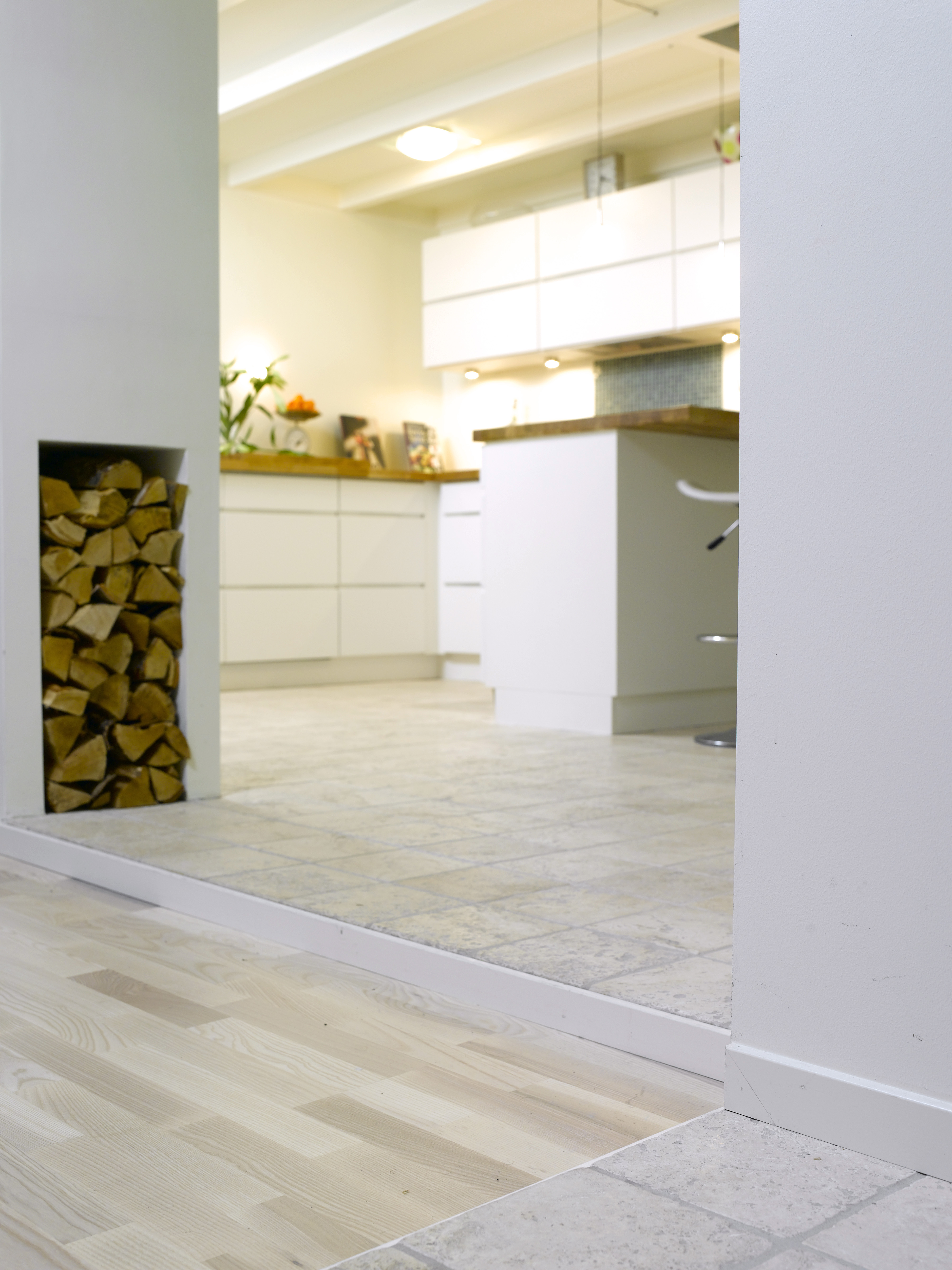 "Beboerne ville ha fliser på kjøkkengulvet, og jeg foreslo å ta igjen disse flisene i gangen. Tre ulike gulv på et så lite område hadde blitt forvirrende. Gulvet på kjøkkenet er 7 cm høyere enn i stuen. Derfor var det naturlig å heve gulvet i gangen til samme nivå. Høydeforskjellen bør være såpass stor at det blir et lite trinn, ikke bare en snublekant.