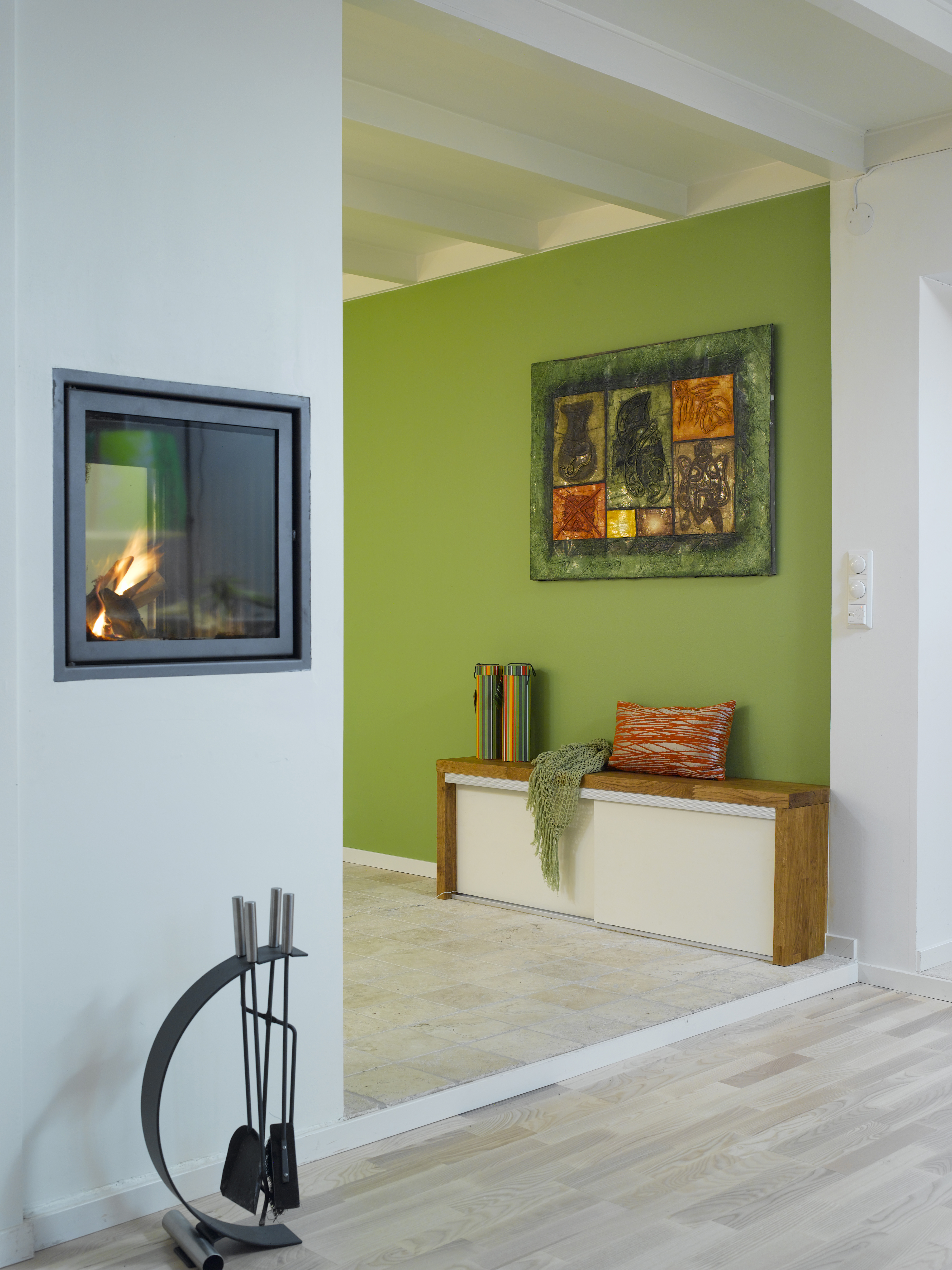 - Peisovnen ble skiftet ut med en peis med glassdører bygget inntil pipen. Peisen er to-veis, slik at man har glede av bålet både i stuen og kjøkkenet.