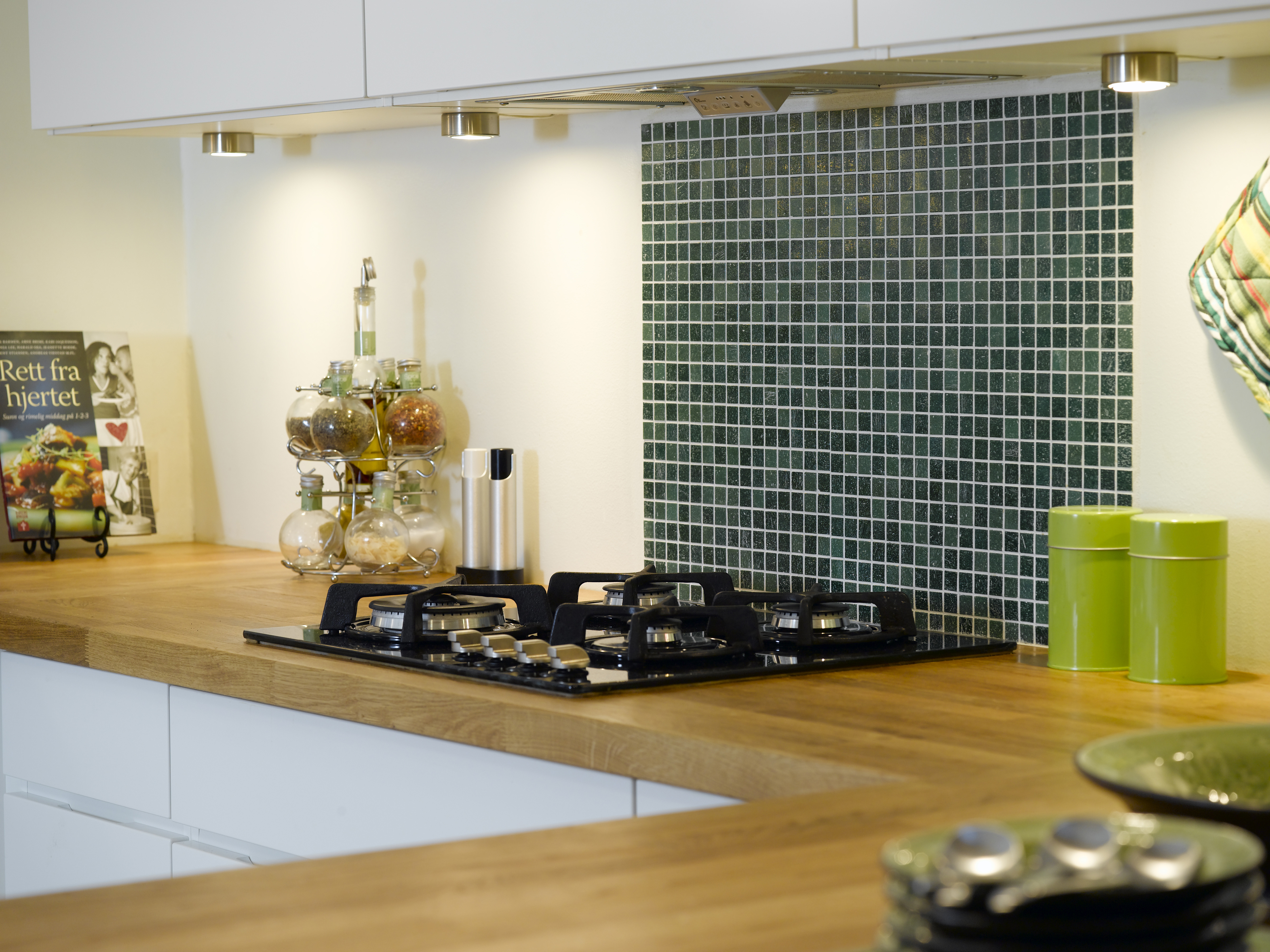 - Over komfyren ble det satt opp mosaikkfliser, mens resten av veggene bare ble malt.