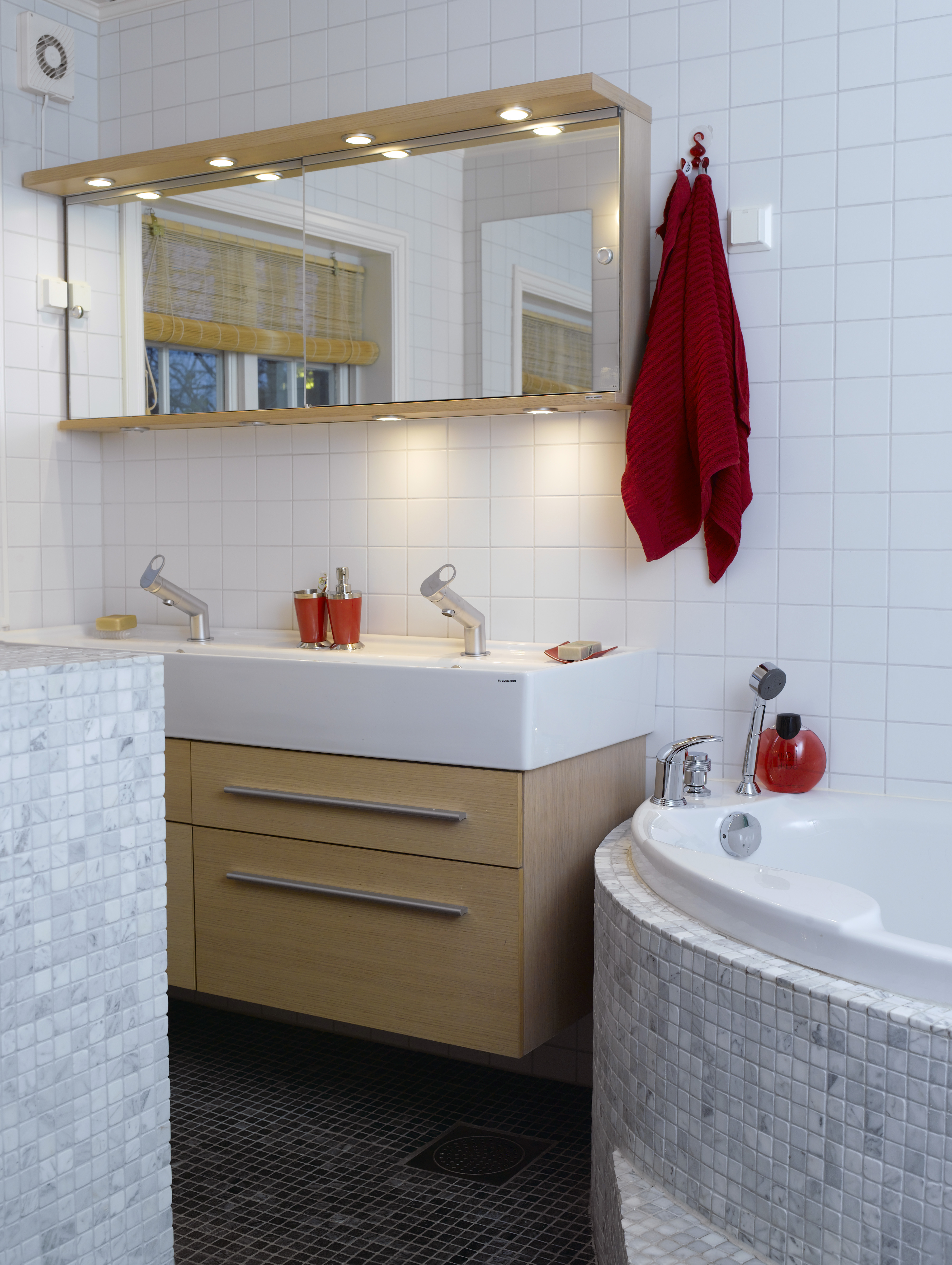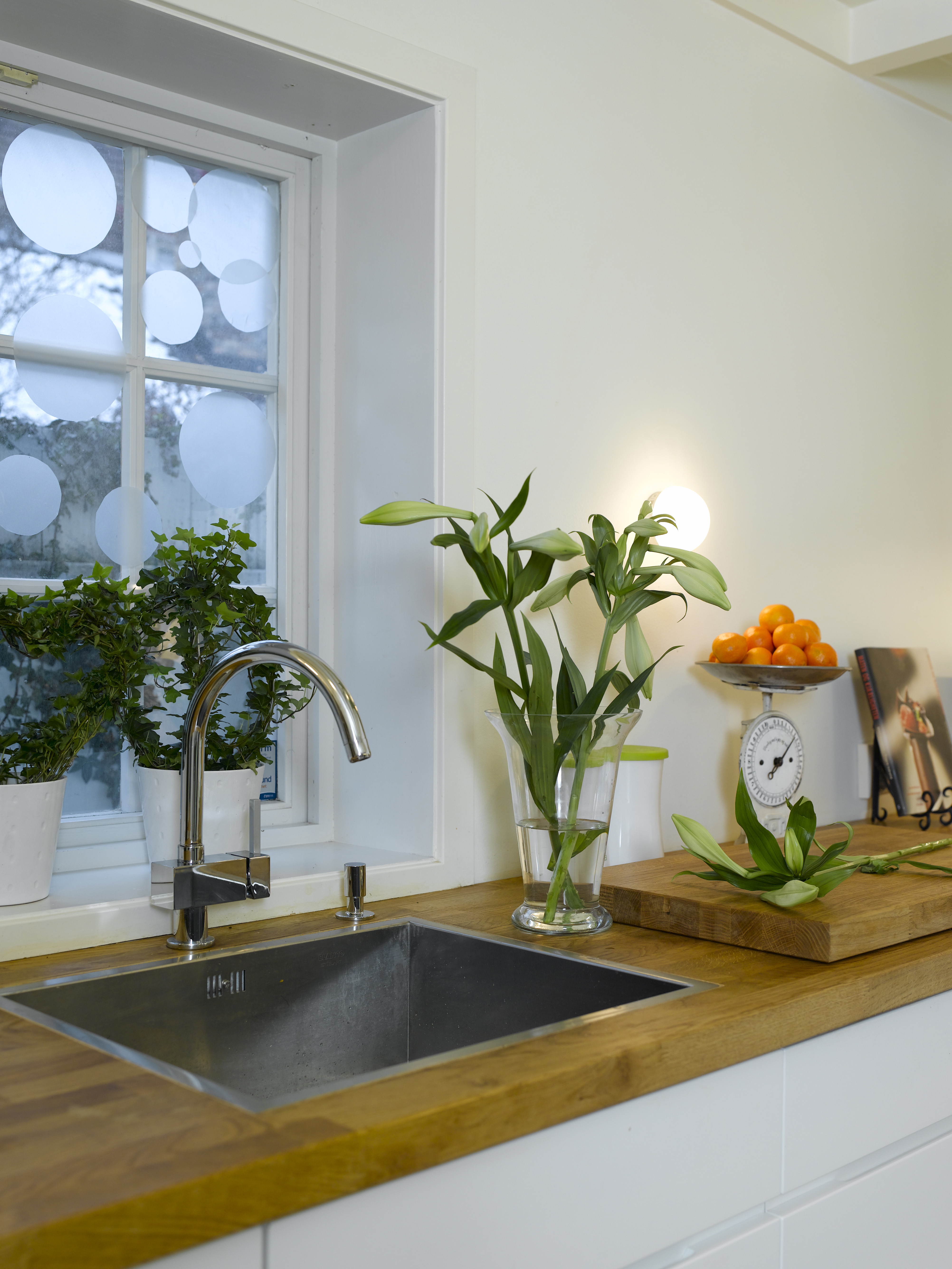 "Tømmeret i stuen går ikke helt ned, så da brystpanelet ble fjernet, måtte vi finne på noe morsomt derfra og ned. Vi valgte skap med skyvedører, der dørene ikke tar plass ut i rommet. Dører istedenfor åpne hyller er mer ryddig i små rom. Topp-platen er en rest etter kjøkkeninnredningen, og ga plass til pyntegjenstander i små grupper.