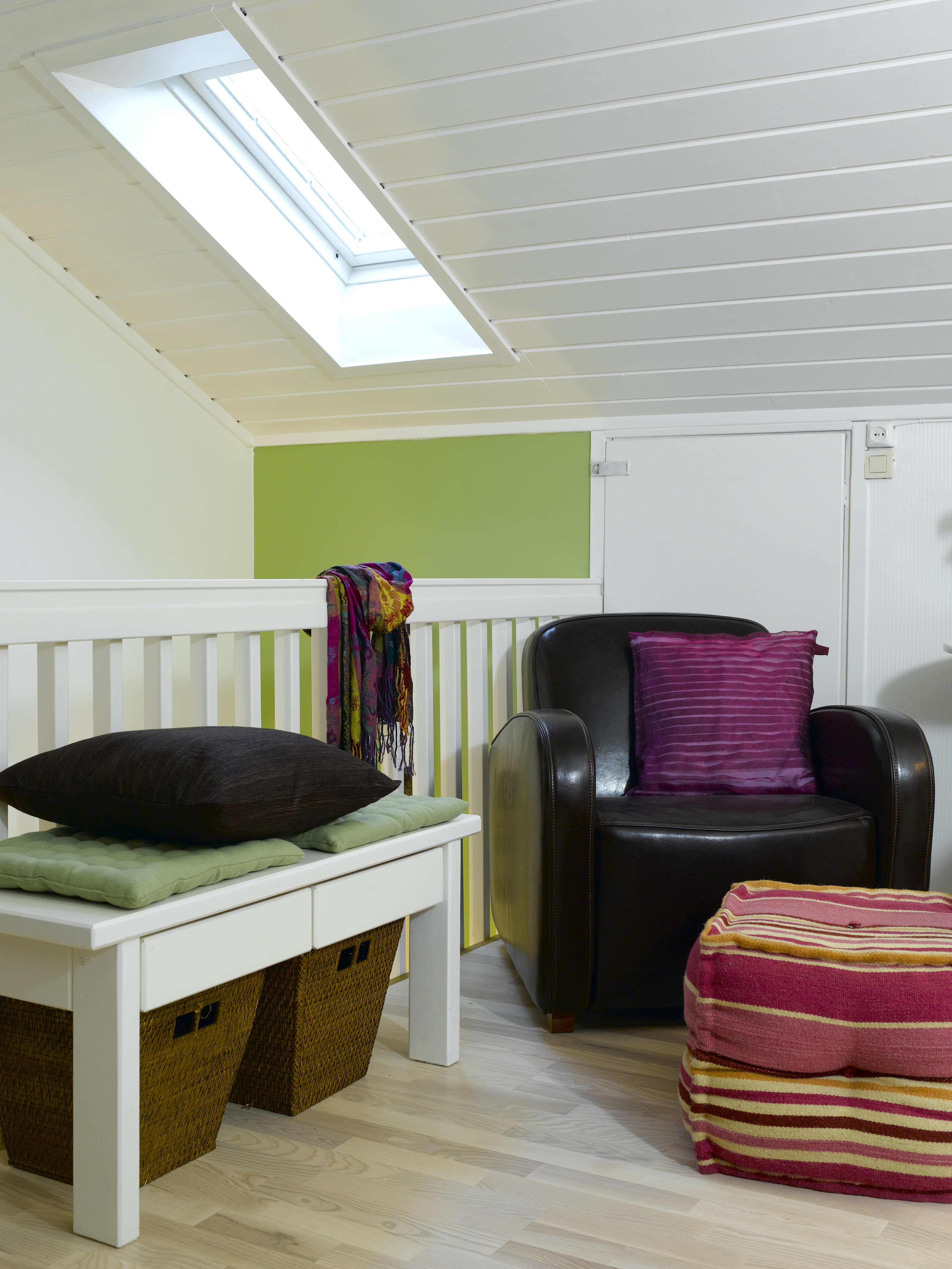 "Det som var morsomt nå, var å få inn en sterk farge fra vår egen tid, som vitner om at de som bor her er unge. Et moderne preg som kontrast til det gamle. Jeg ga dem valget mellom to grønnfarger, og var glad de valgte den friskeste - eplegrønn. Grønt er en naturlig farge, på samme måte som tømmeret, og den ble fortsatt opp veggen til annen etasje for å heve takhøyden visuelt."